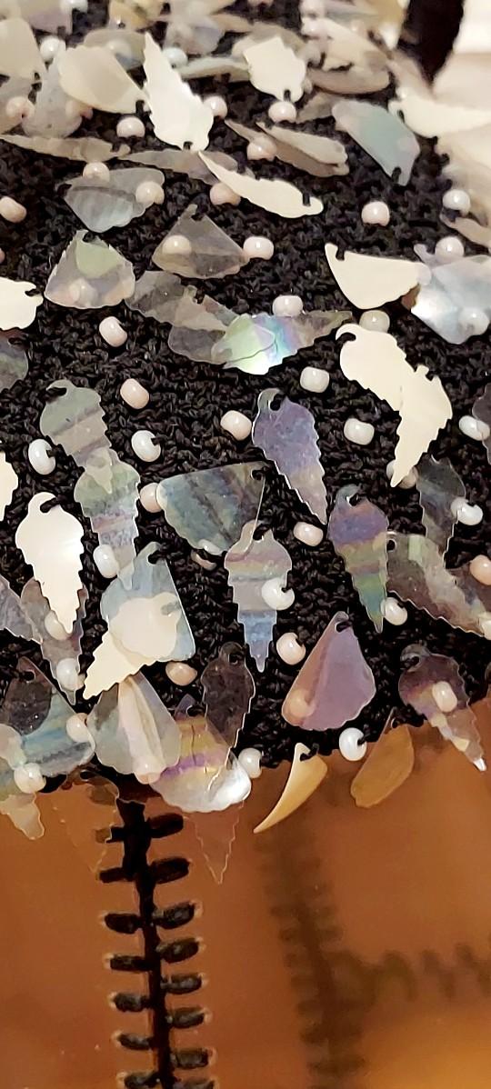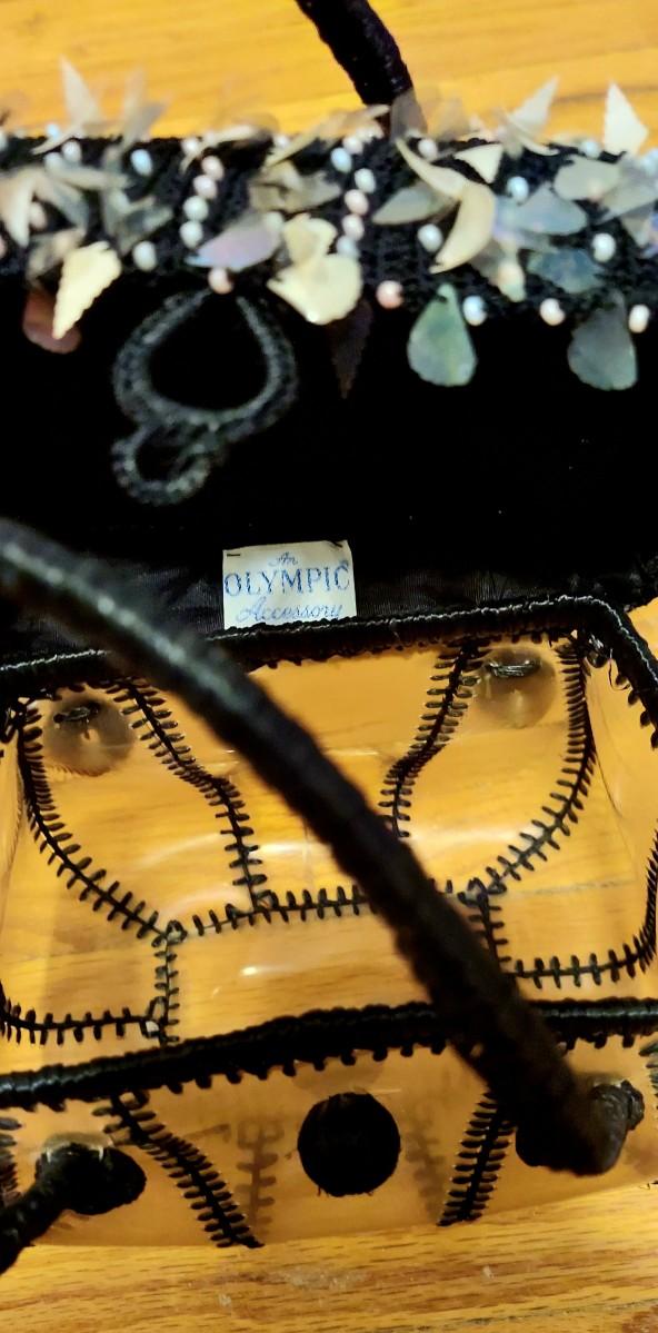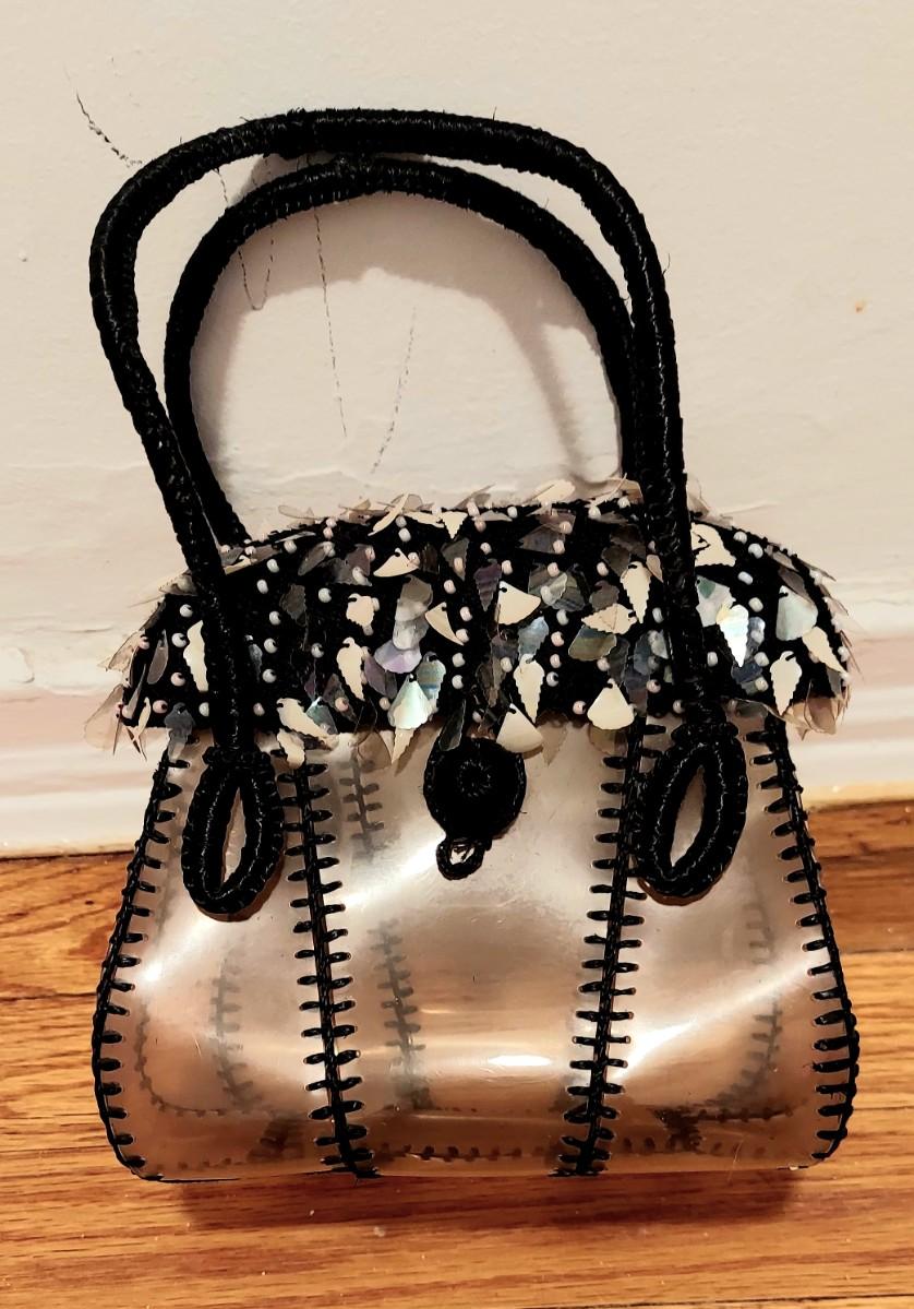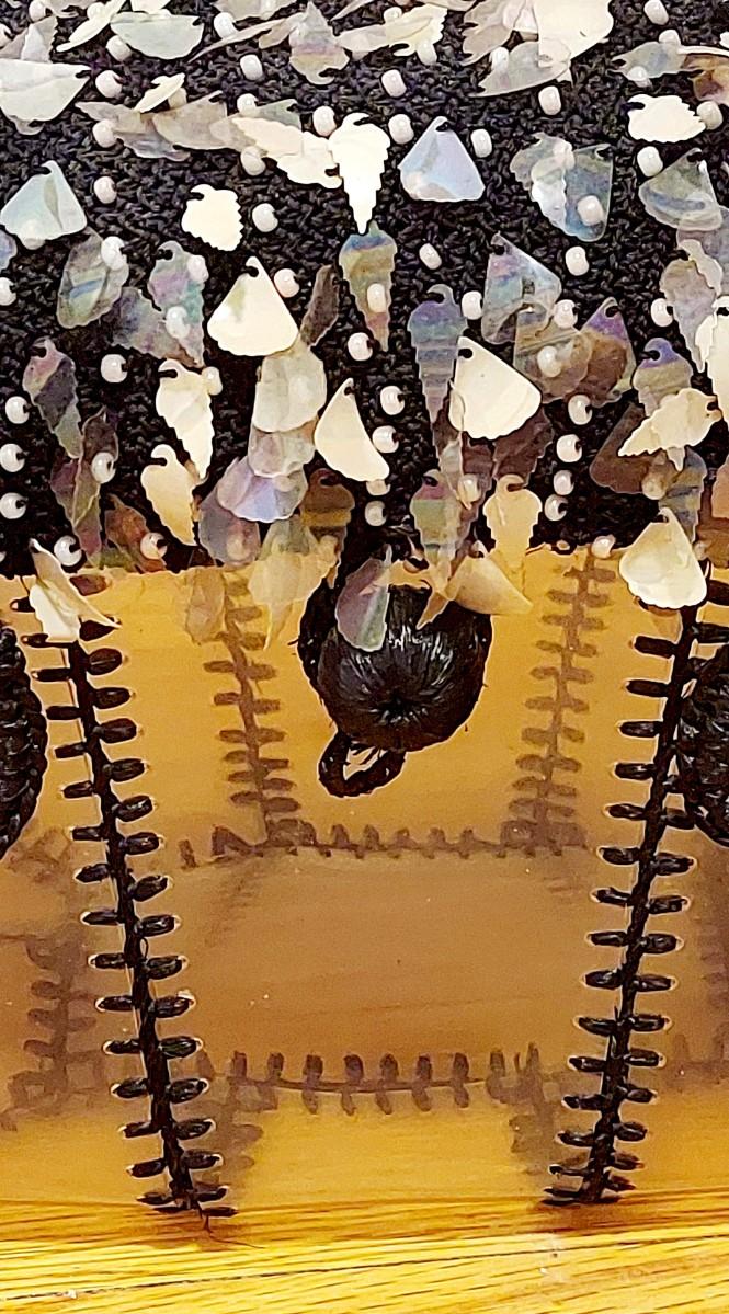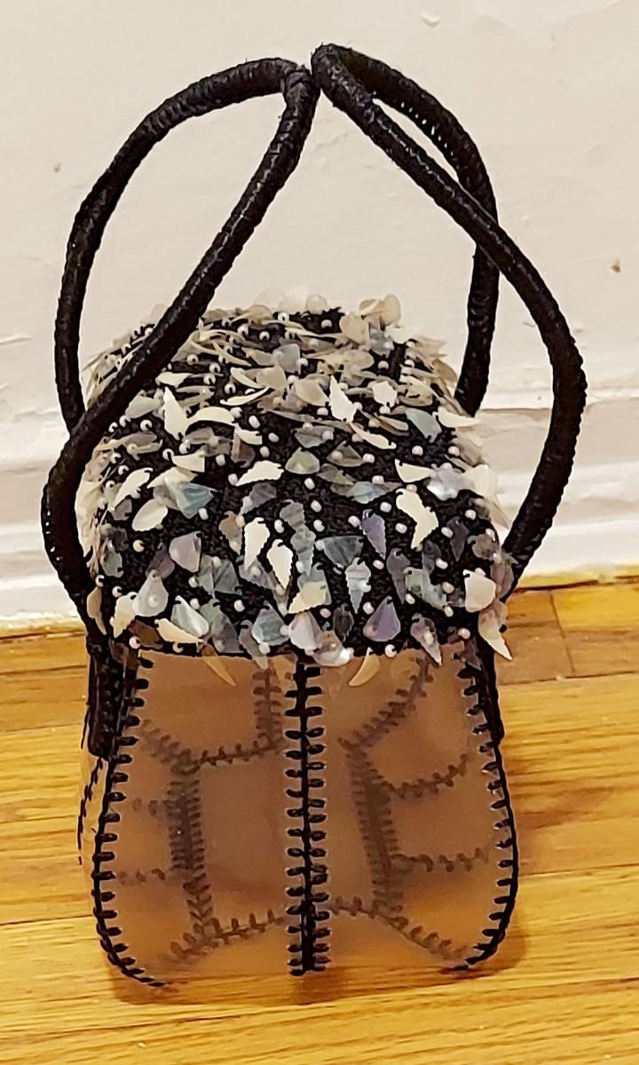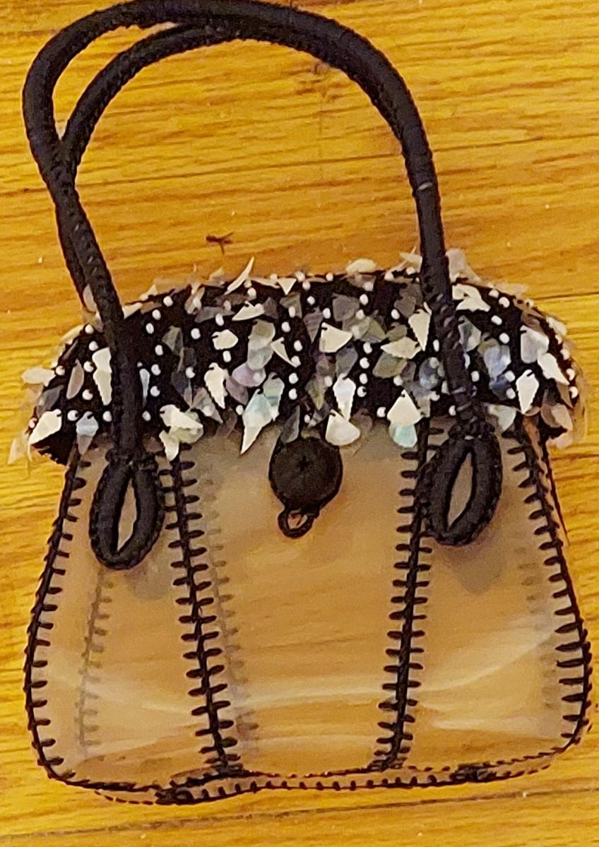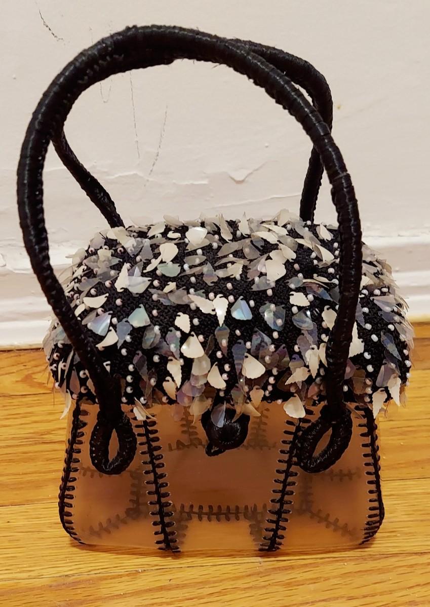 This one is the Piece de Resistence. I have yet to see the likes of this one. The 60s is made of plastic Sea Shells the handles are covered in Raffia. It is in very good Vtg condition.