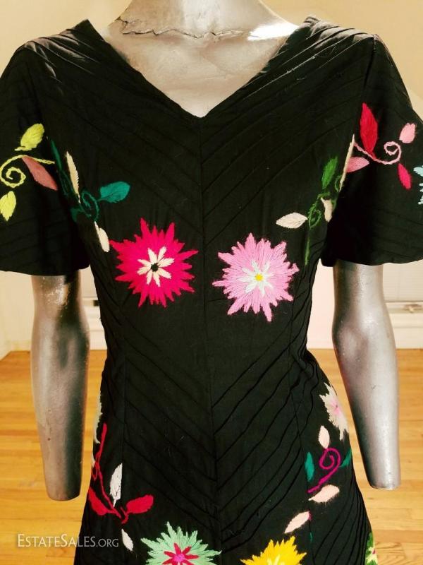 Rare because of the Era it's from. The early 1950's Boho chic Mexican hand embroidered festival dress worn by a bride to be.. The fabric itself has all lines hand embroidery . The gown is magnificent in look and style. . The back has a metal zipper