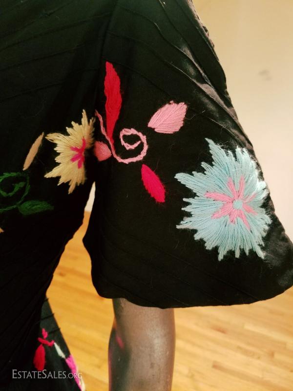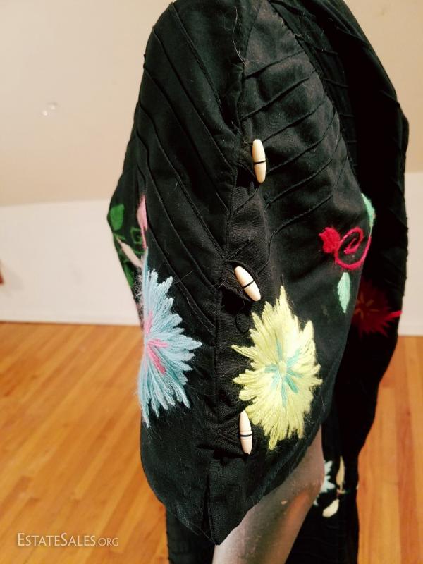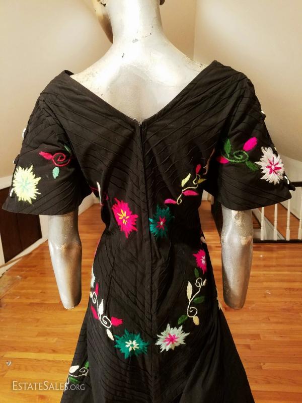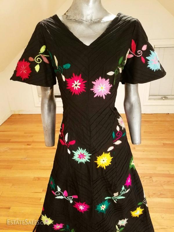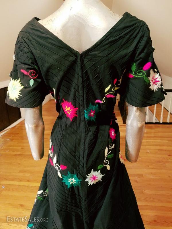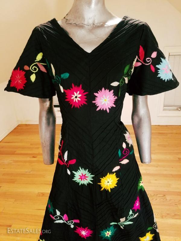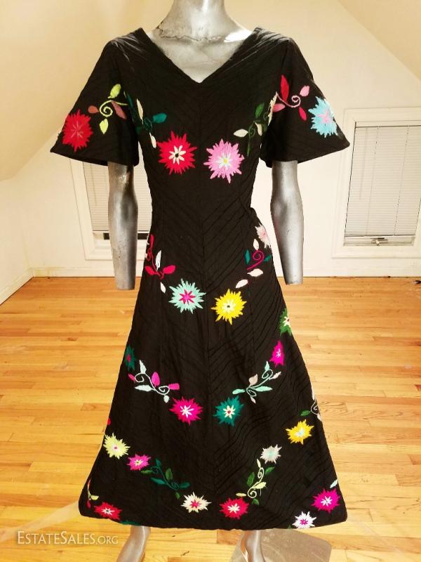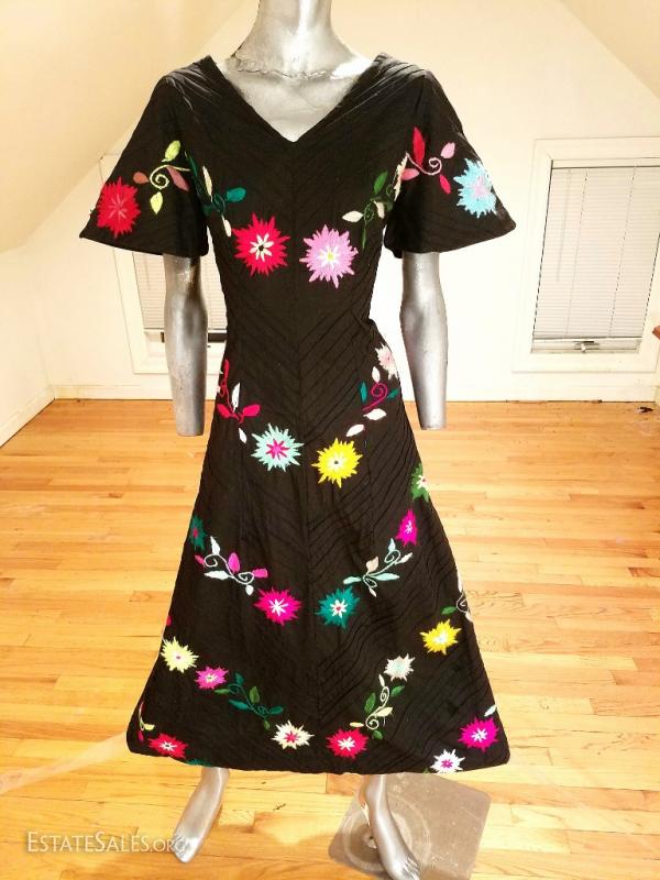 Rare because of the Era it's from. The early 1950's Boho chic Mexican hand embroidered festival dress worn by a bride to be.. The fabric itself has all lines hand embroidery . The gown is magnificent in look and style. . The back has a metal zipper
