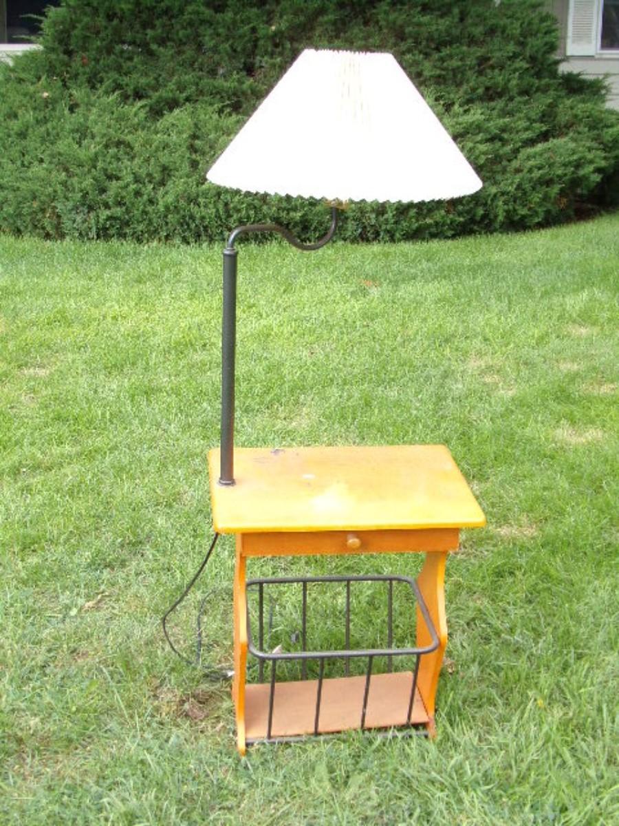 VTG reading table for next to your chair. Has a swing arm lamp, a magazine rack in bottom and small drawer. Needs a good cleaning but still usable.