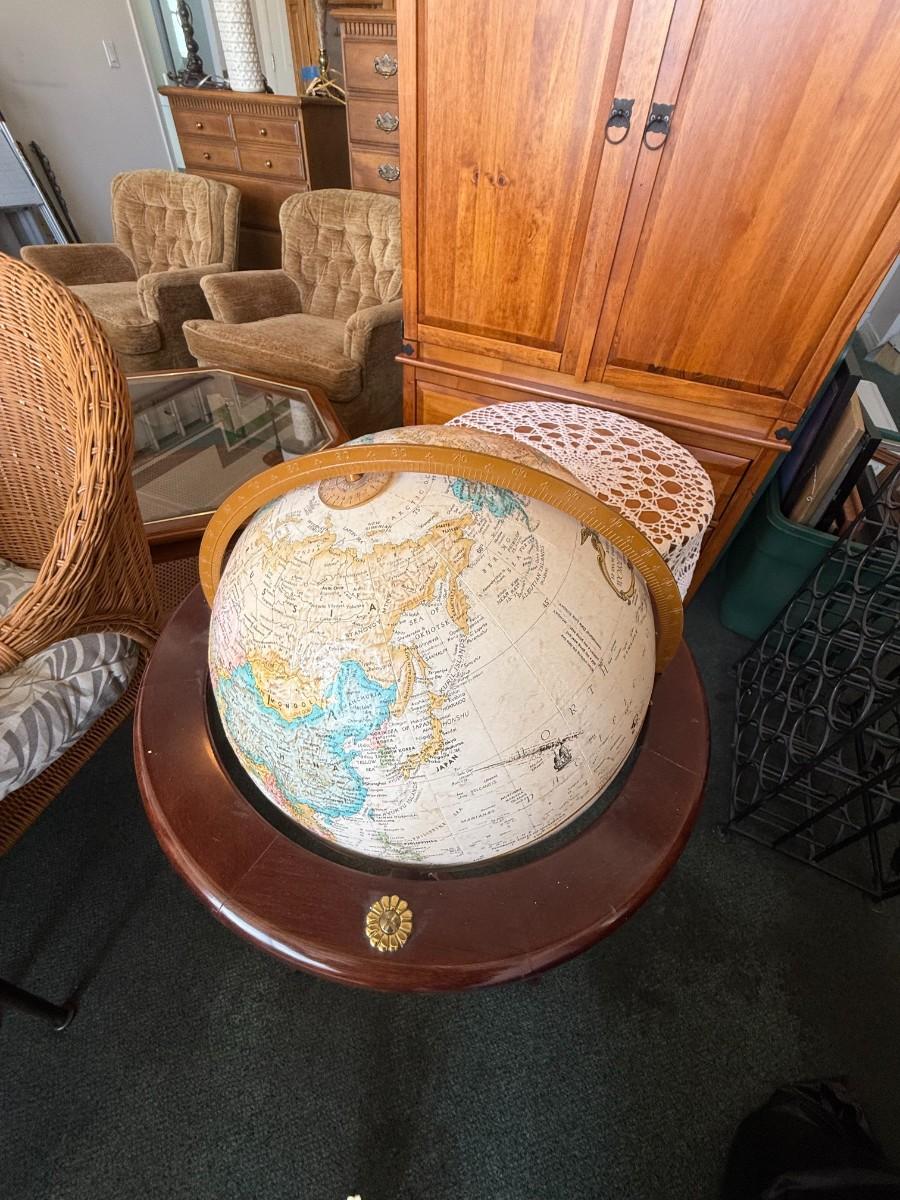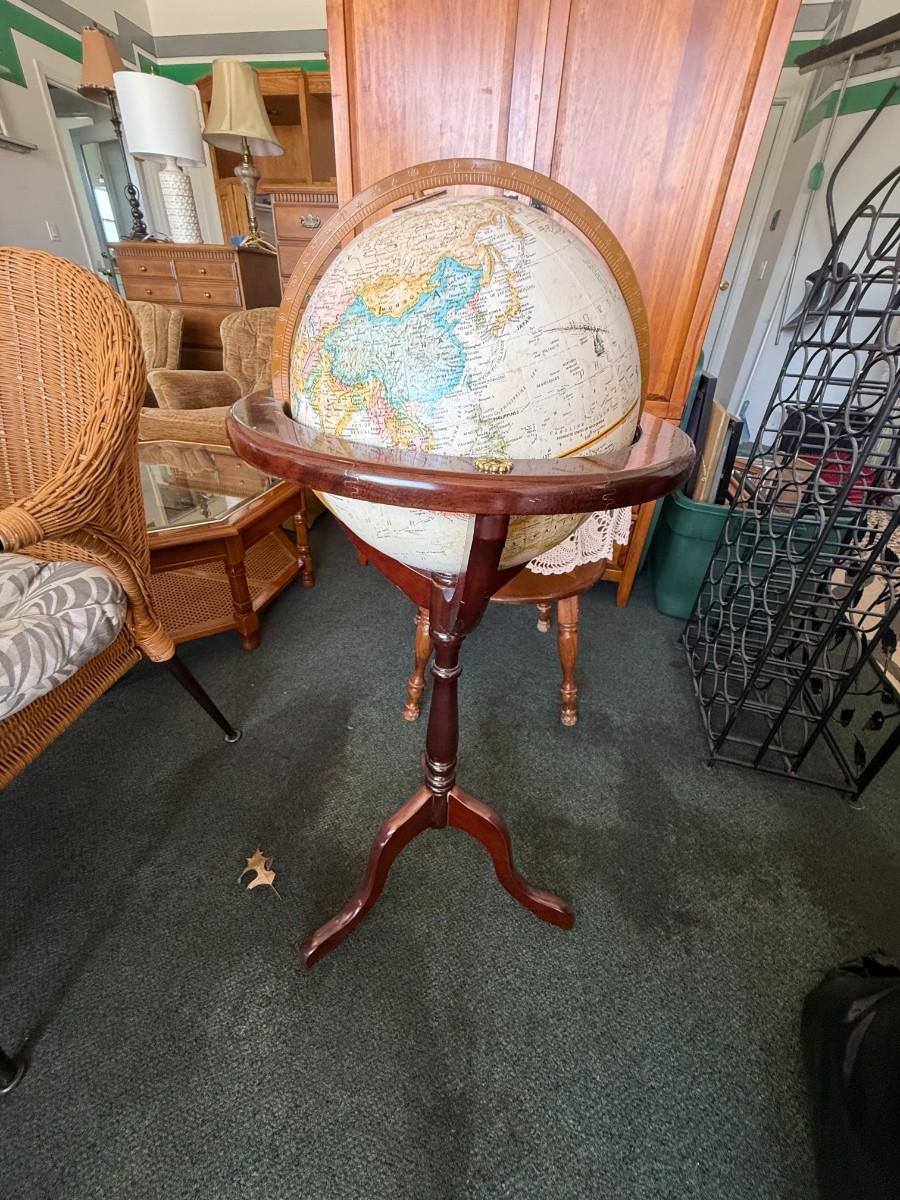 A beautifully designed vintage Replogle world classic globe that features raised relief and a stylish mahogany stand, perfect for your study or office.