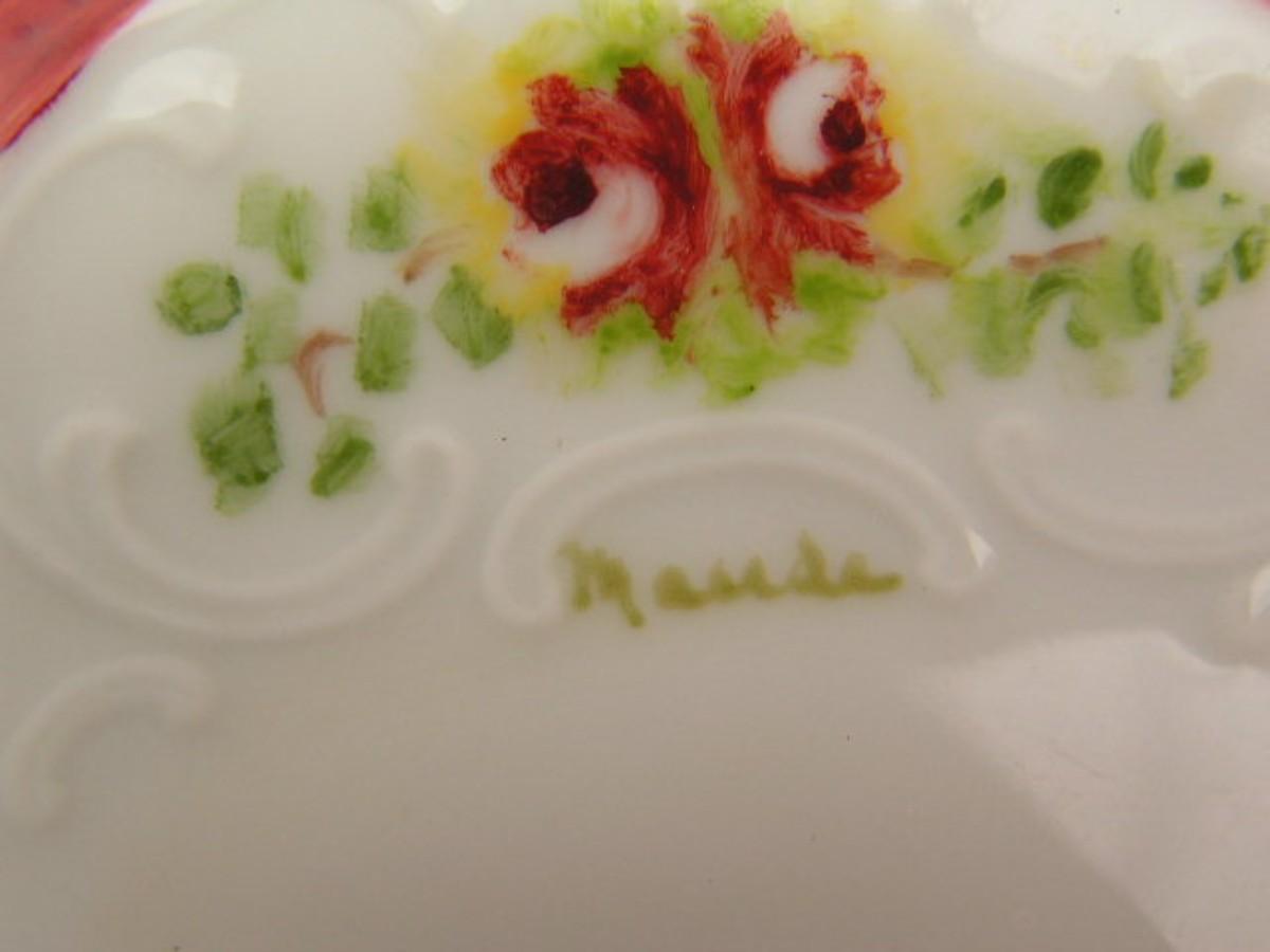 Vintage reticulated porcelain small dessert dish/plate. Appears hand painted at irregular edges. Has word painted in gold on front corner, no label on back. About 5" irregular shape. EX to Mint