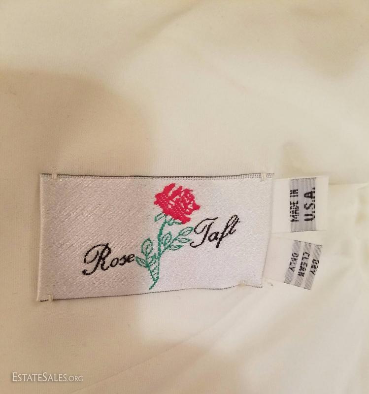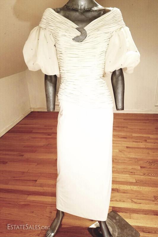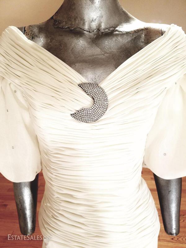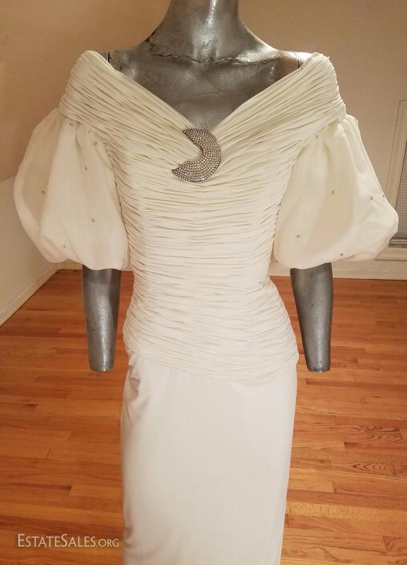 Vtg Rose Taft Couture shirred gown balloon sleeves Rhinestone Brooch