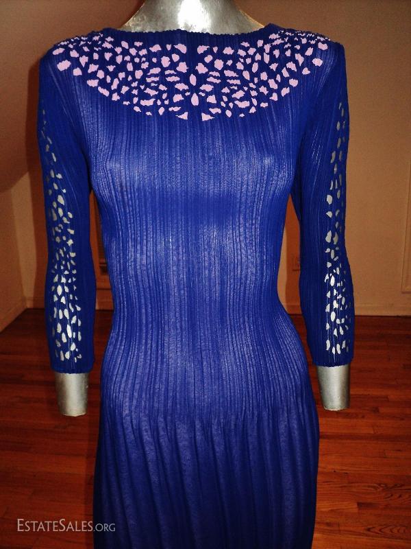 A Royal blue and lavender cutout pencil pleated crepe dress. Fortuny style.
