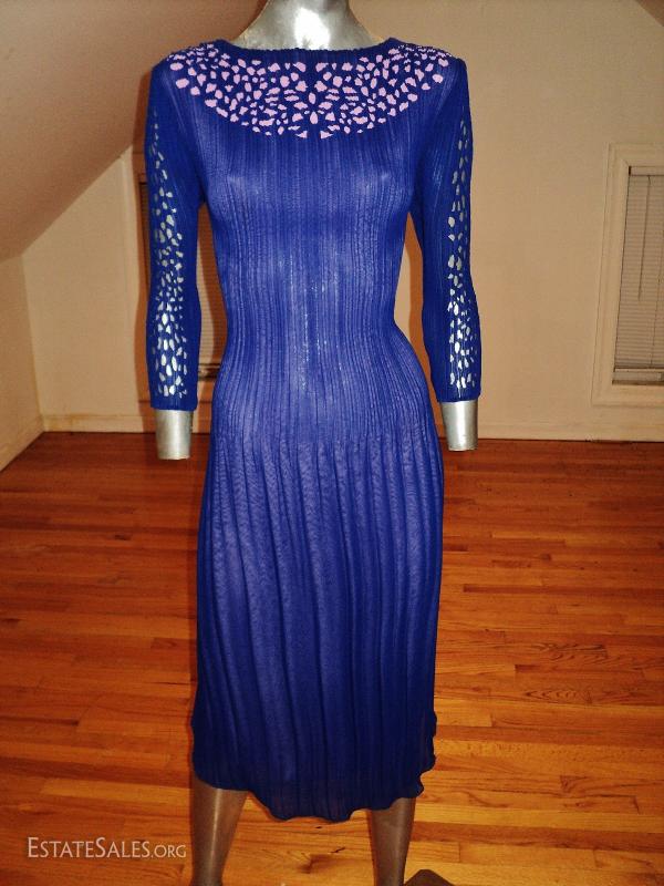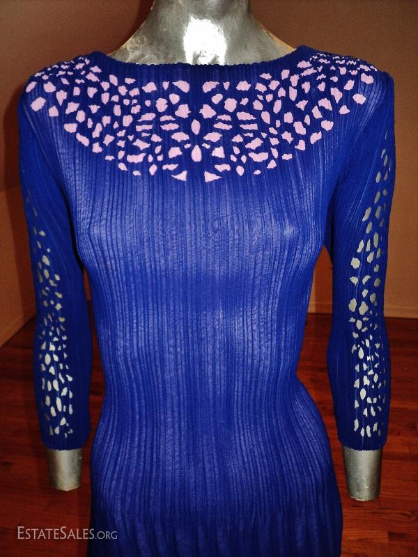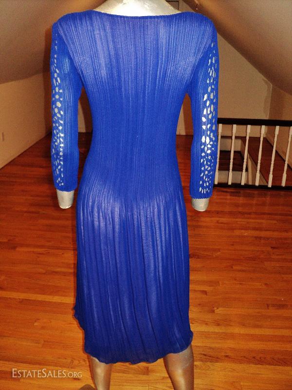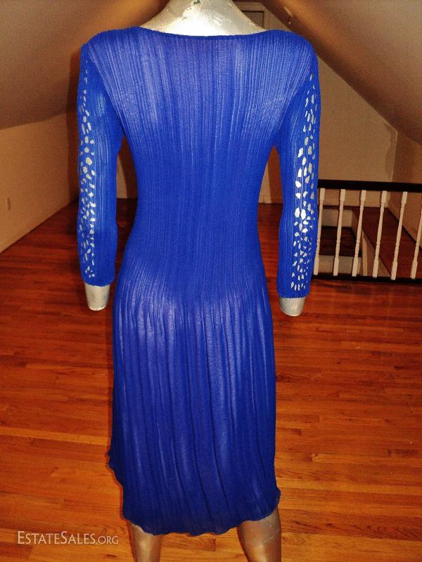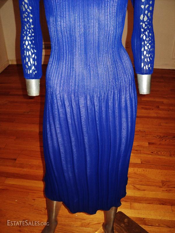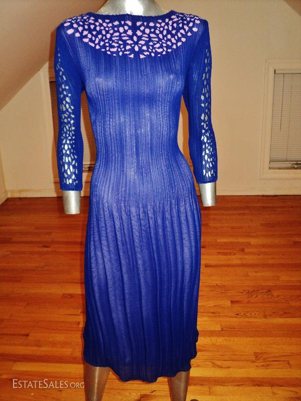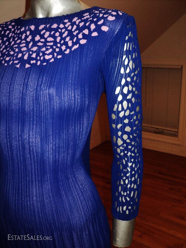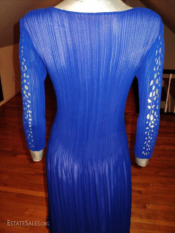 A Royal blue and lavender cutout pencil pleated crepe dress. Fortuny style.