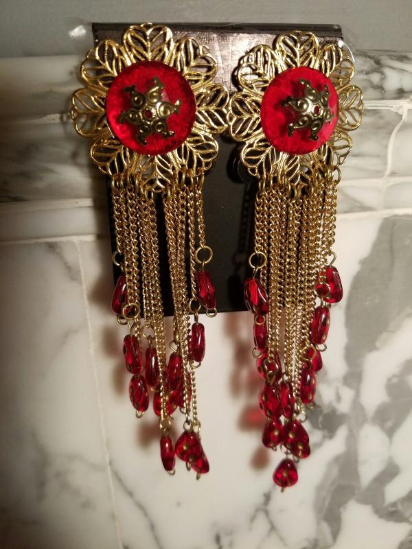 Estate find amazing earrings in a ruby tone celluloid danglers chains and a stunning work of filigree gold base.