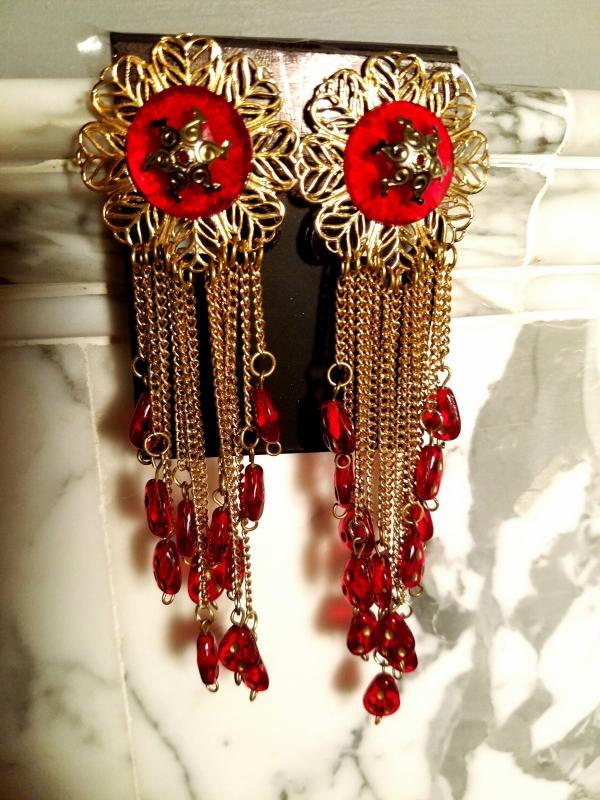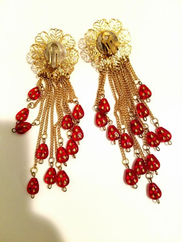 Estate find amazing earrings in a ruby tone celluloid danglers chains and a stunning work of filigree gold base.