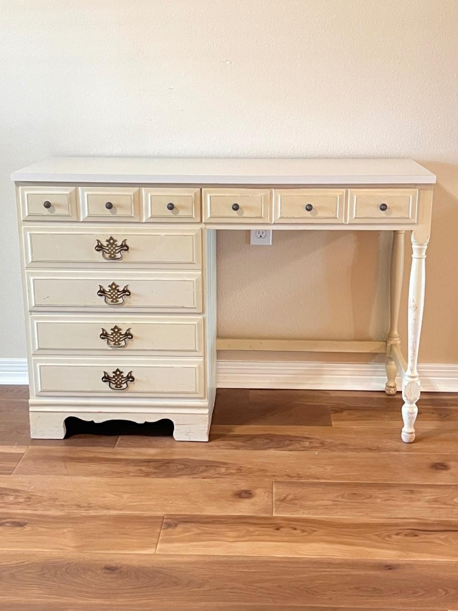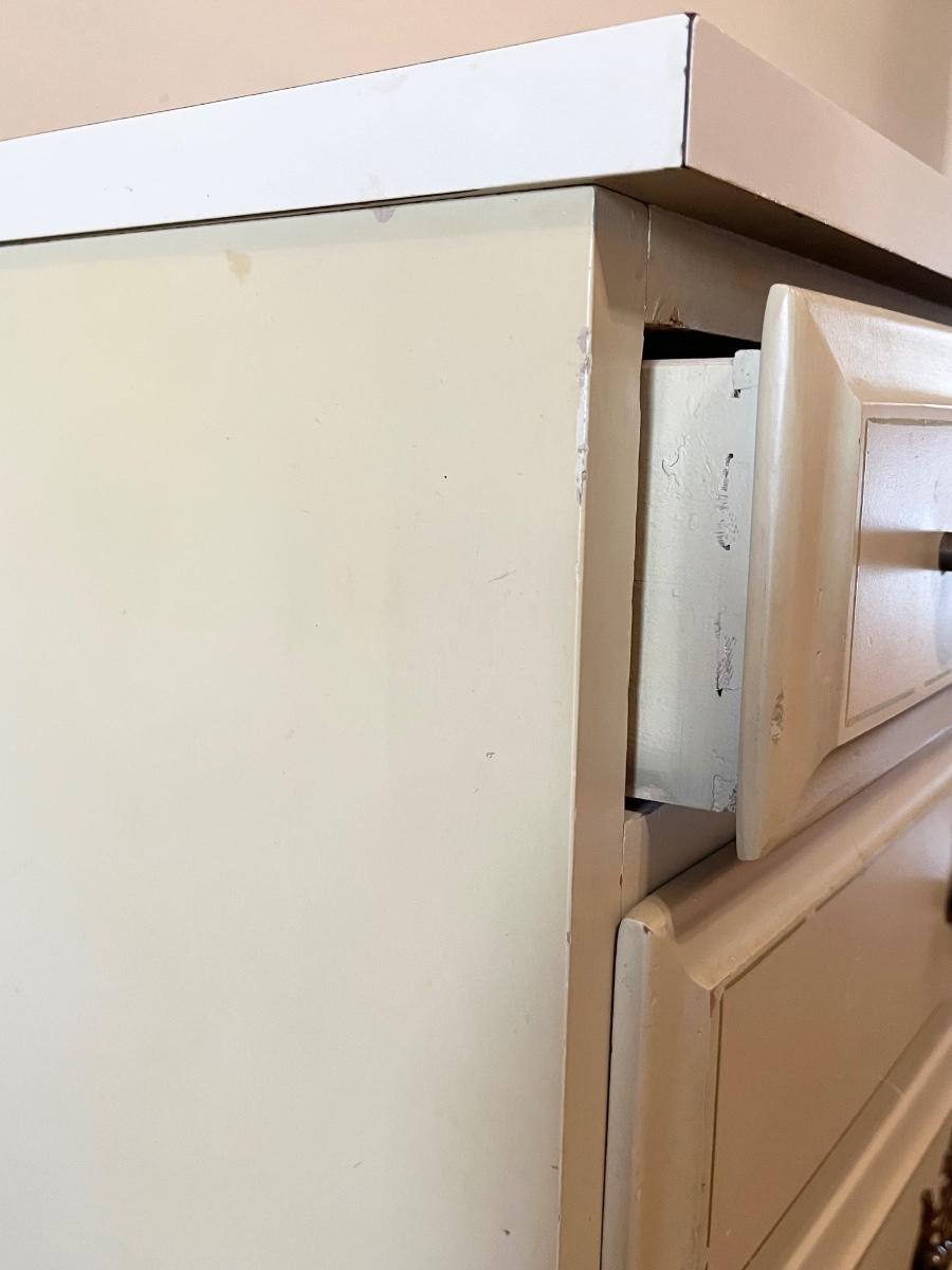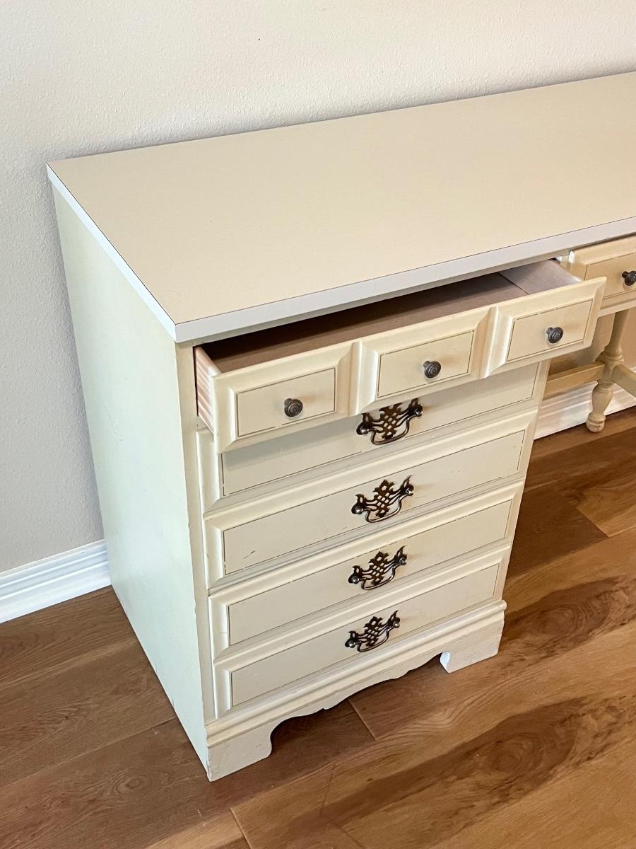 30.5” H x 44” W x 17.5” D ~ Has scratches around the legs as seen in photos ~ 4 drawers slide easily