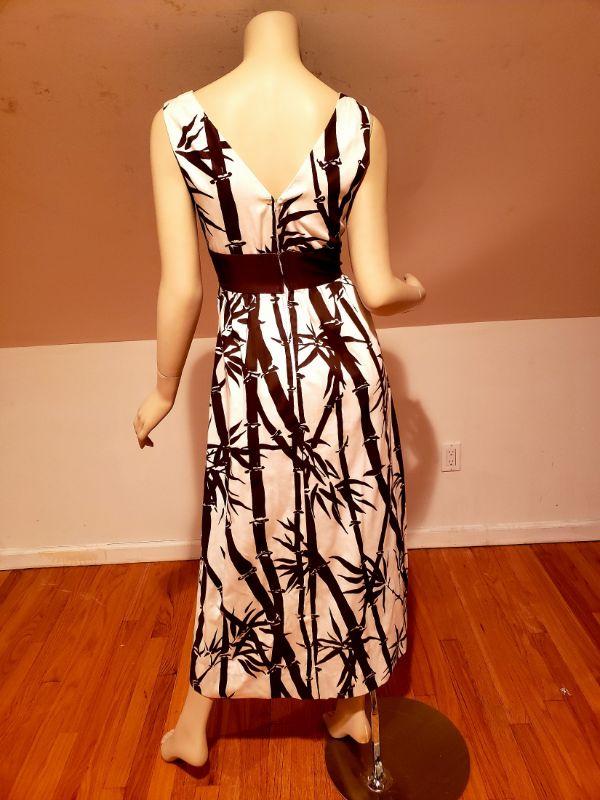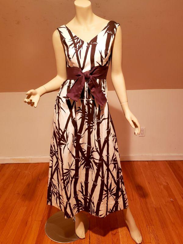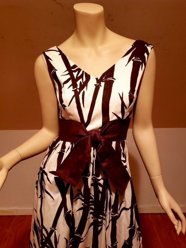 Darted Bust, V neckline with sash Bow.. Brown and Off white. Even has hidden pockets.