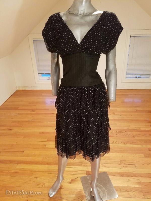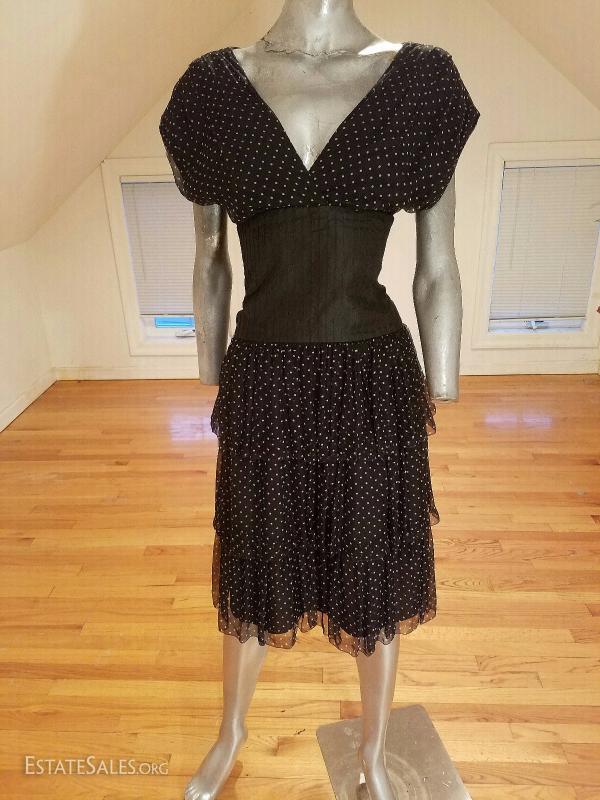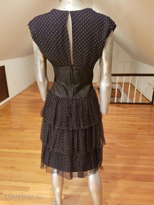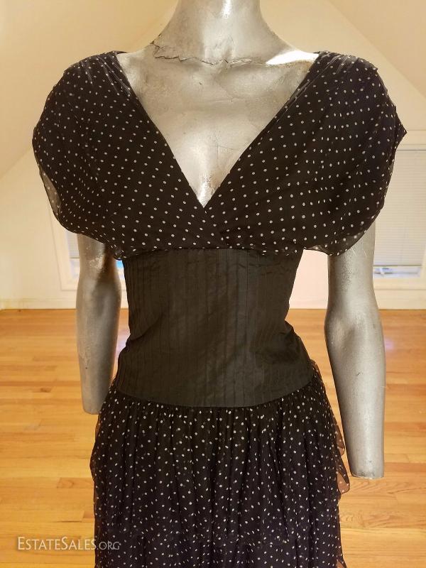 Layered chiffon with polka dots the midriff is like a bustier with elongated line embroidery .