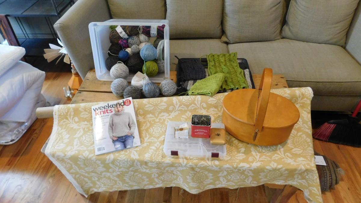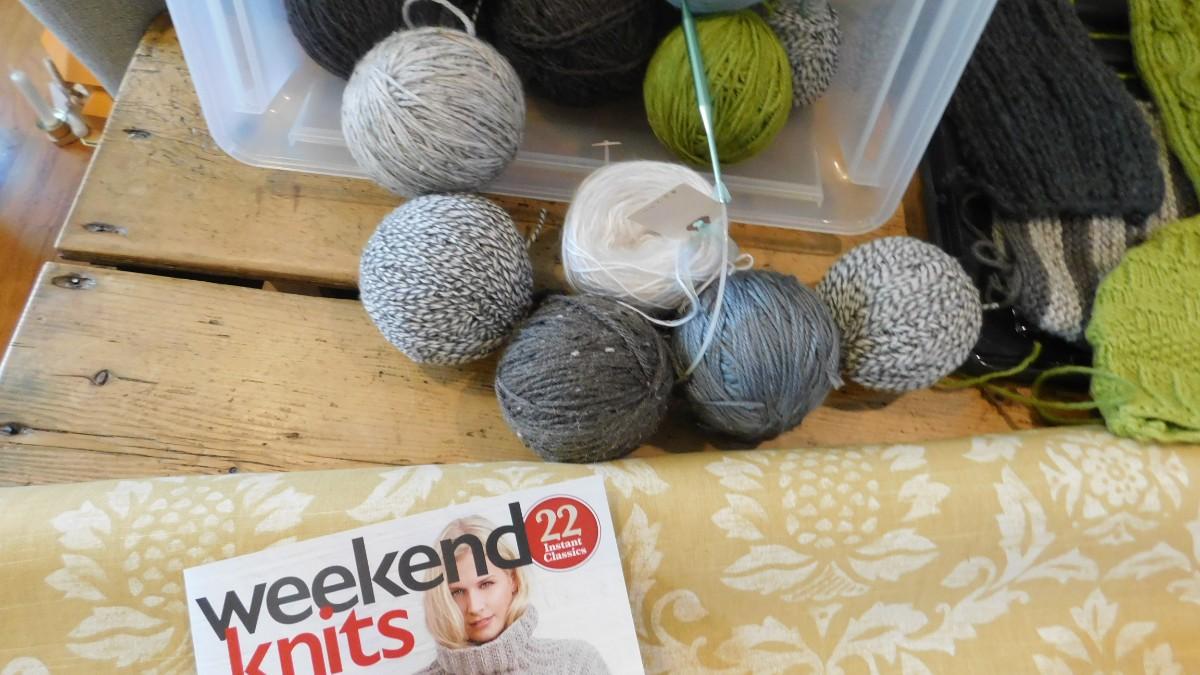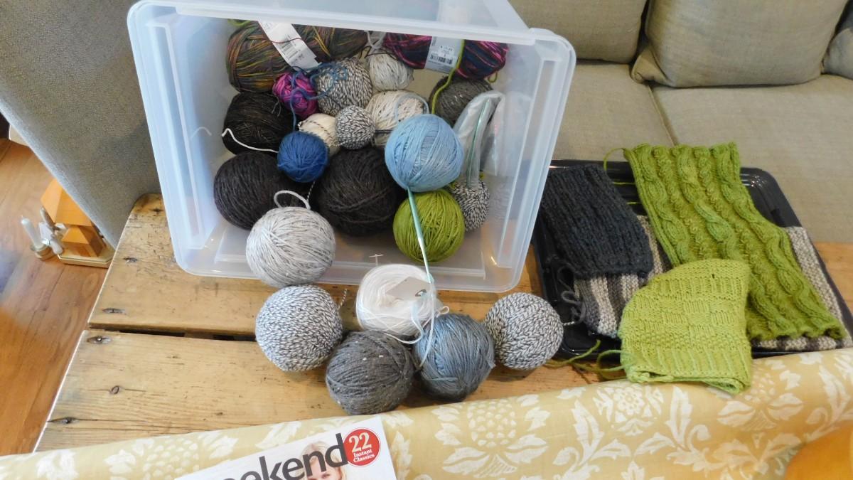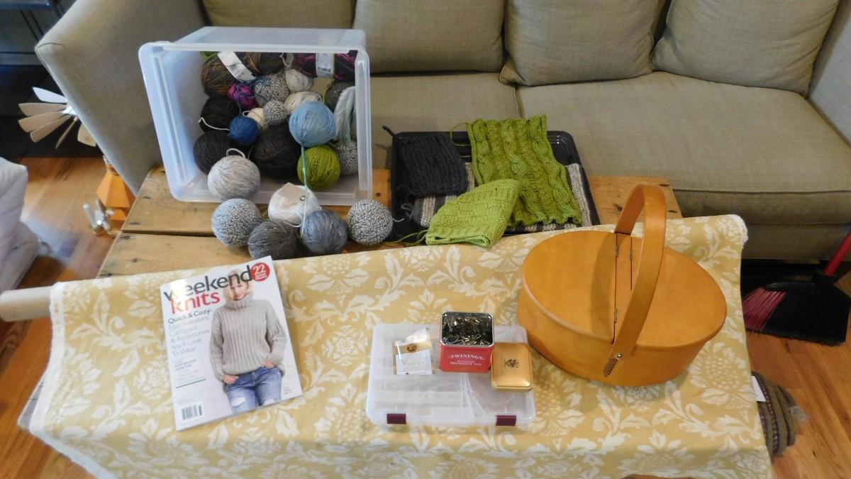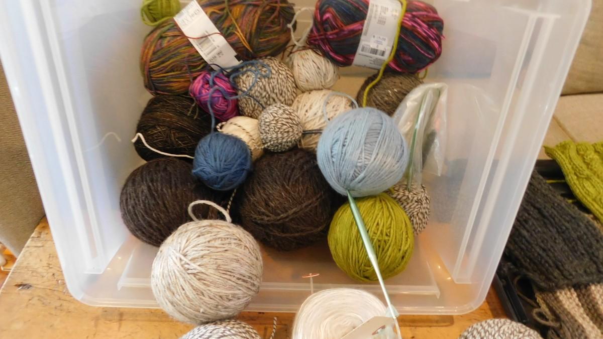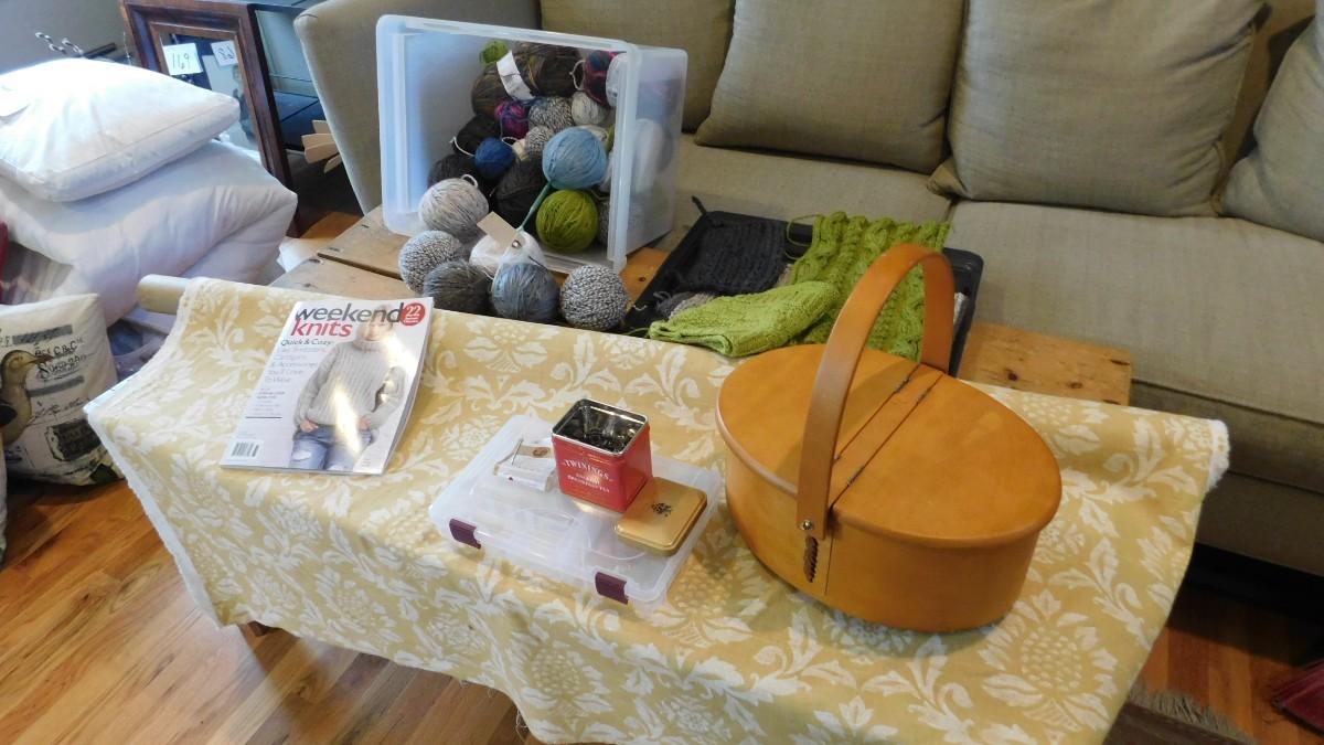 WOODEN SEWING BOX, YARN AND SEWING MATERIAL