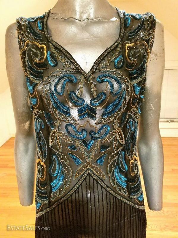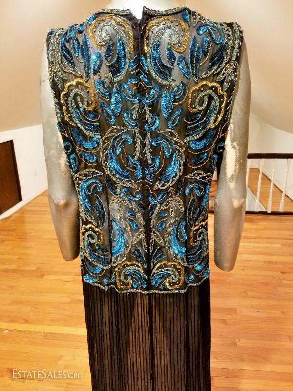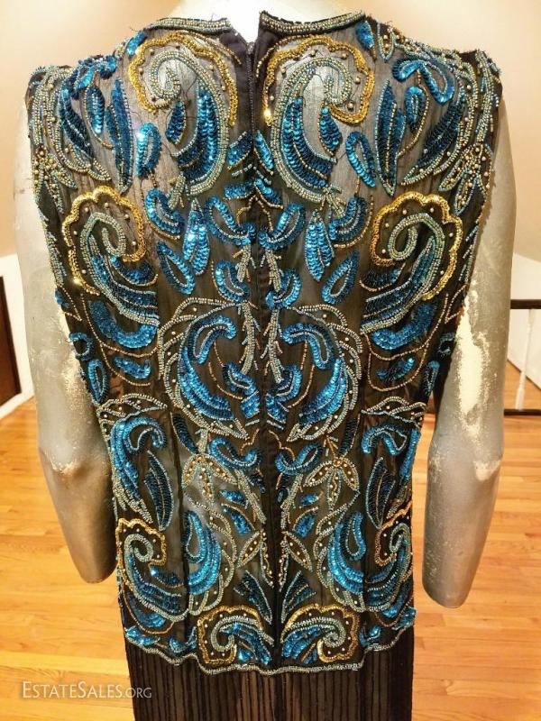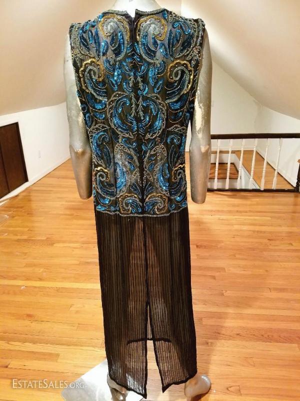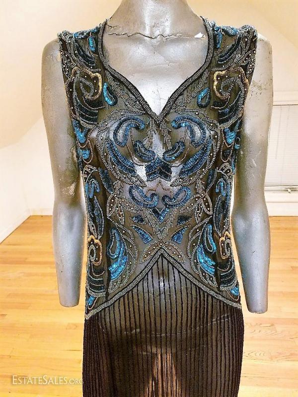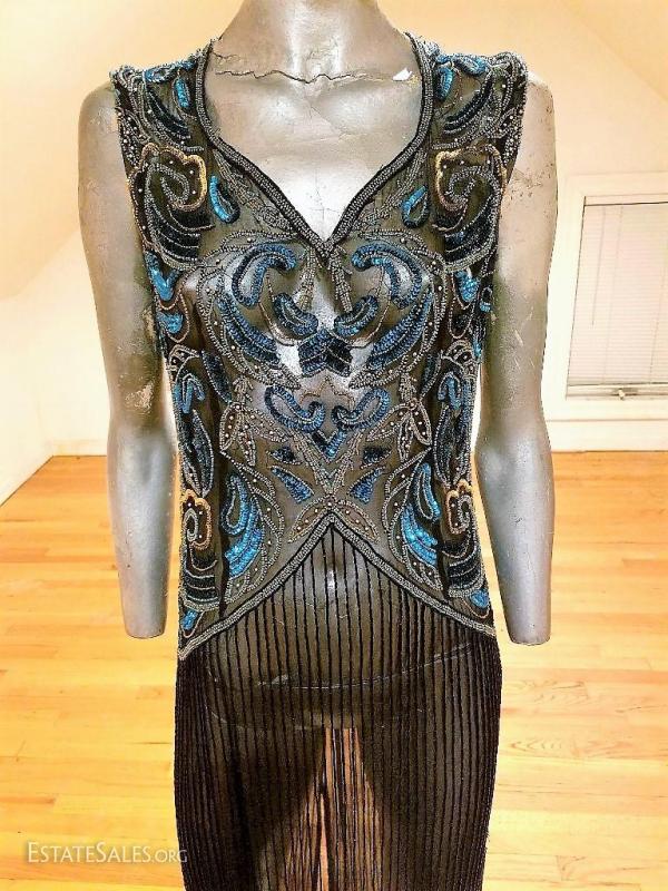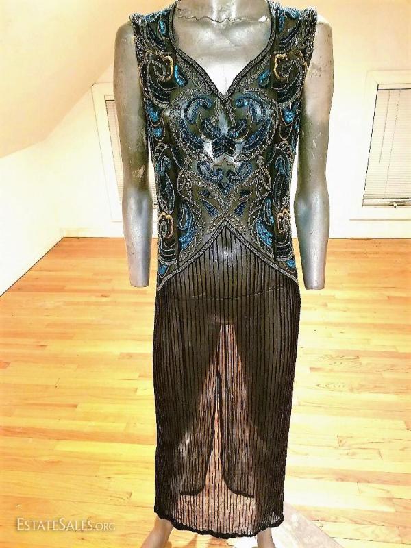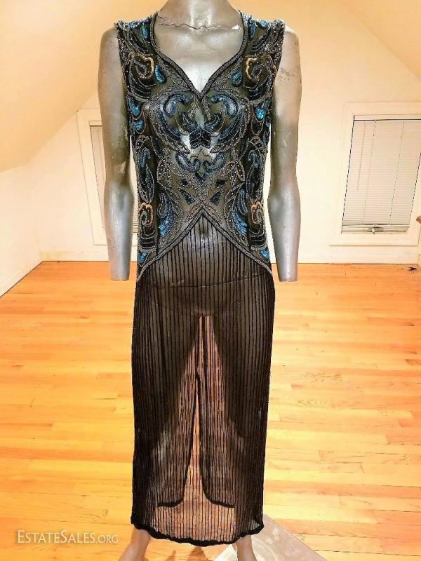 Vtg silk hand beaded layering flapper maxi dress on chiffon back slit