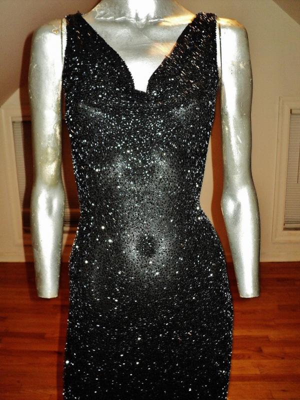 Every inch of it is hand beaded with small bugle onyx beads bodice collar lays drapes