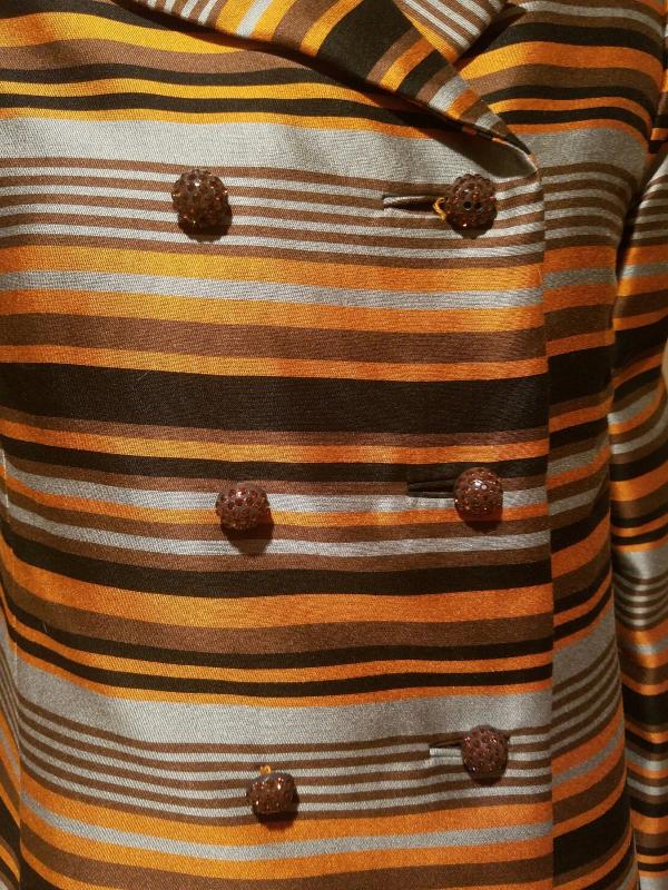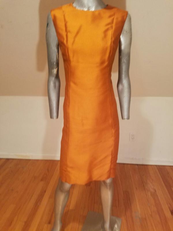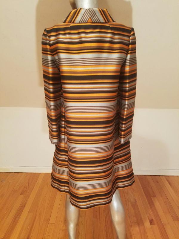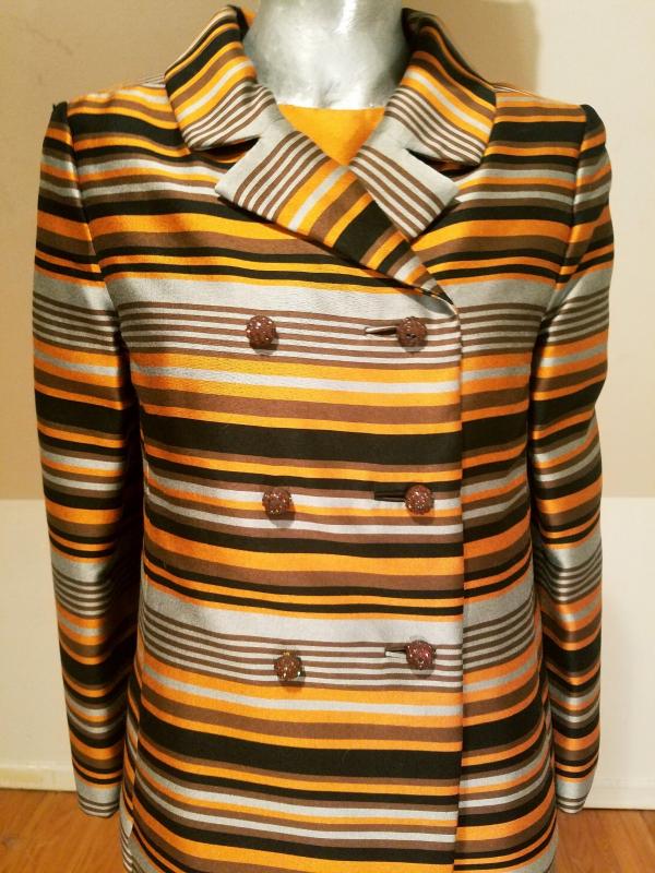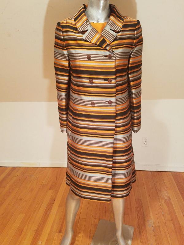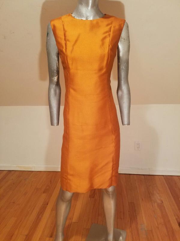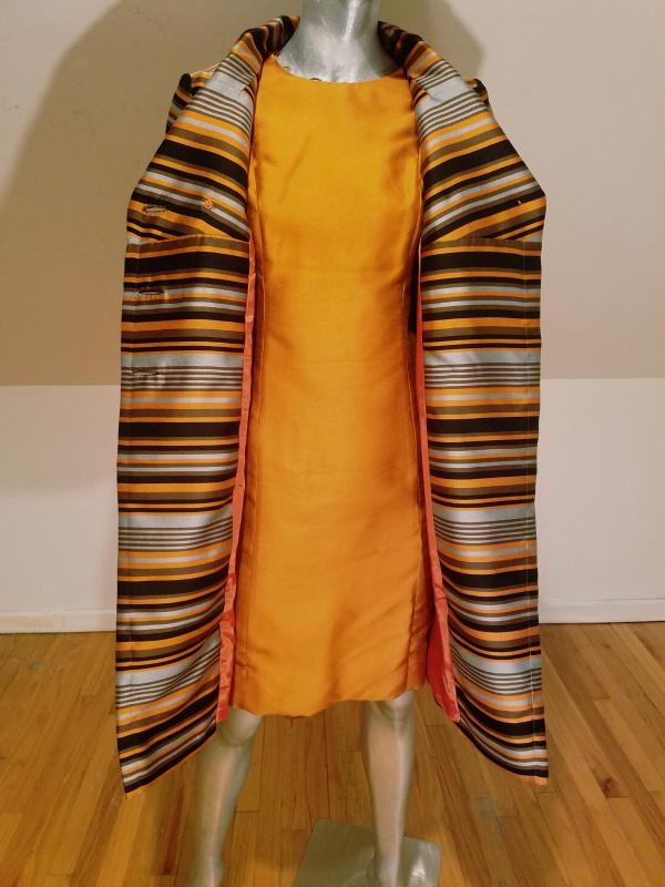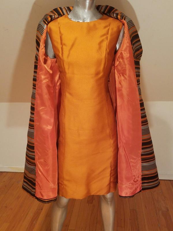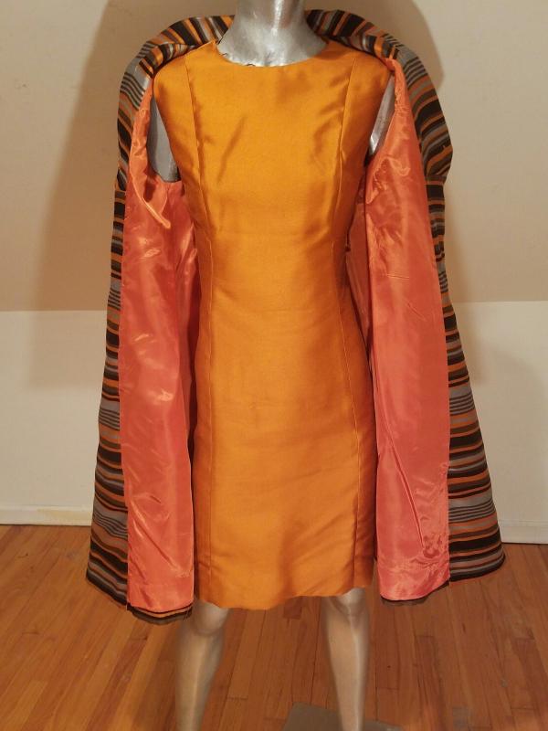 This is an amazing Opera silk shantung ensemble of a coat and wiggle Mod dress with orange crystal rhinestone buttons. from the late 1960's . The colors and details are stunning in a classic style a la mode then. Fully lined and couture finish. Like New. Stunning