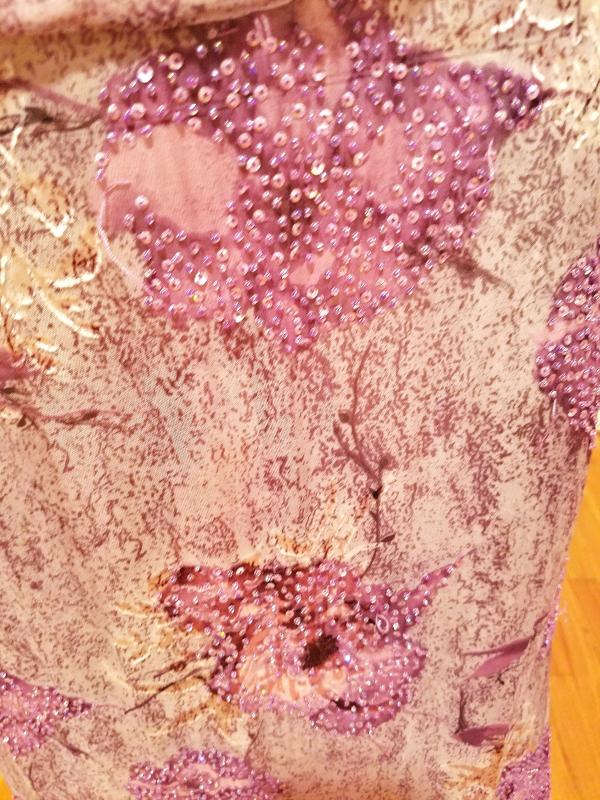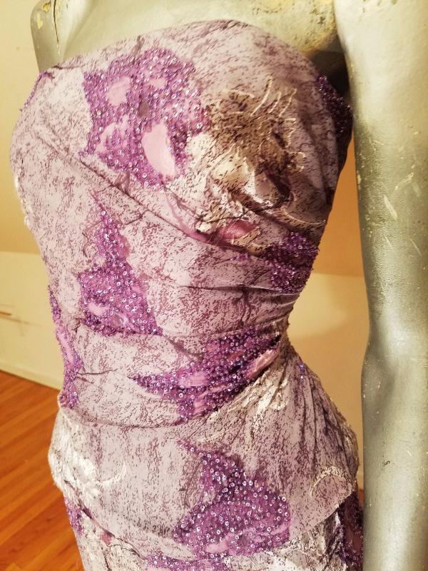 An amazing semi layering gown 100% silk Charmeuse floral design with hand beaded tiny crystal glass beads . In perfect condition