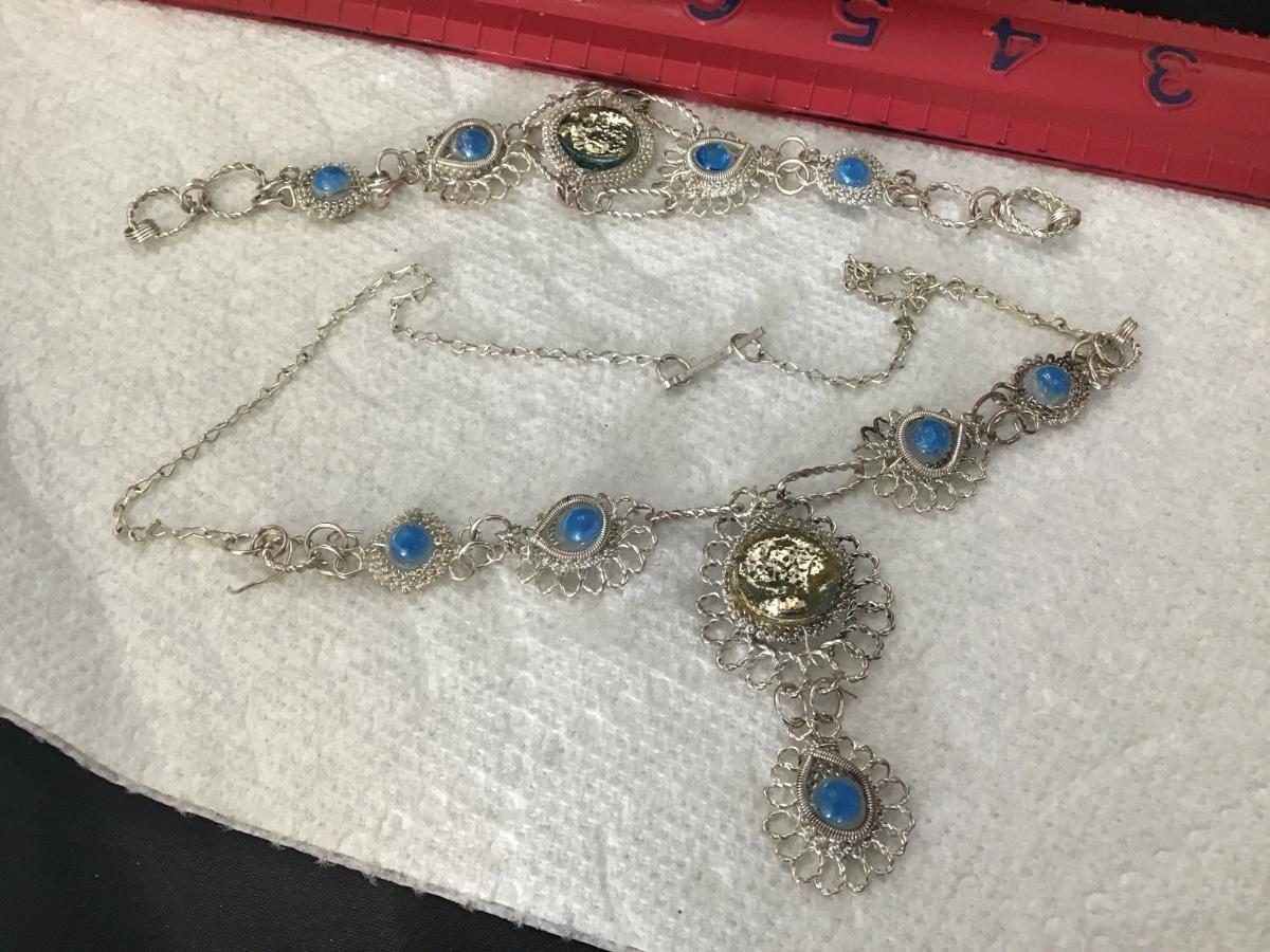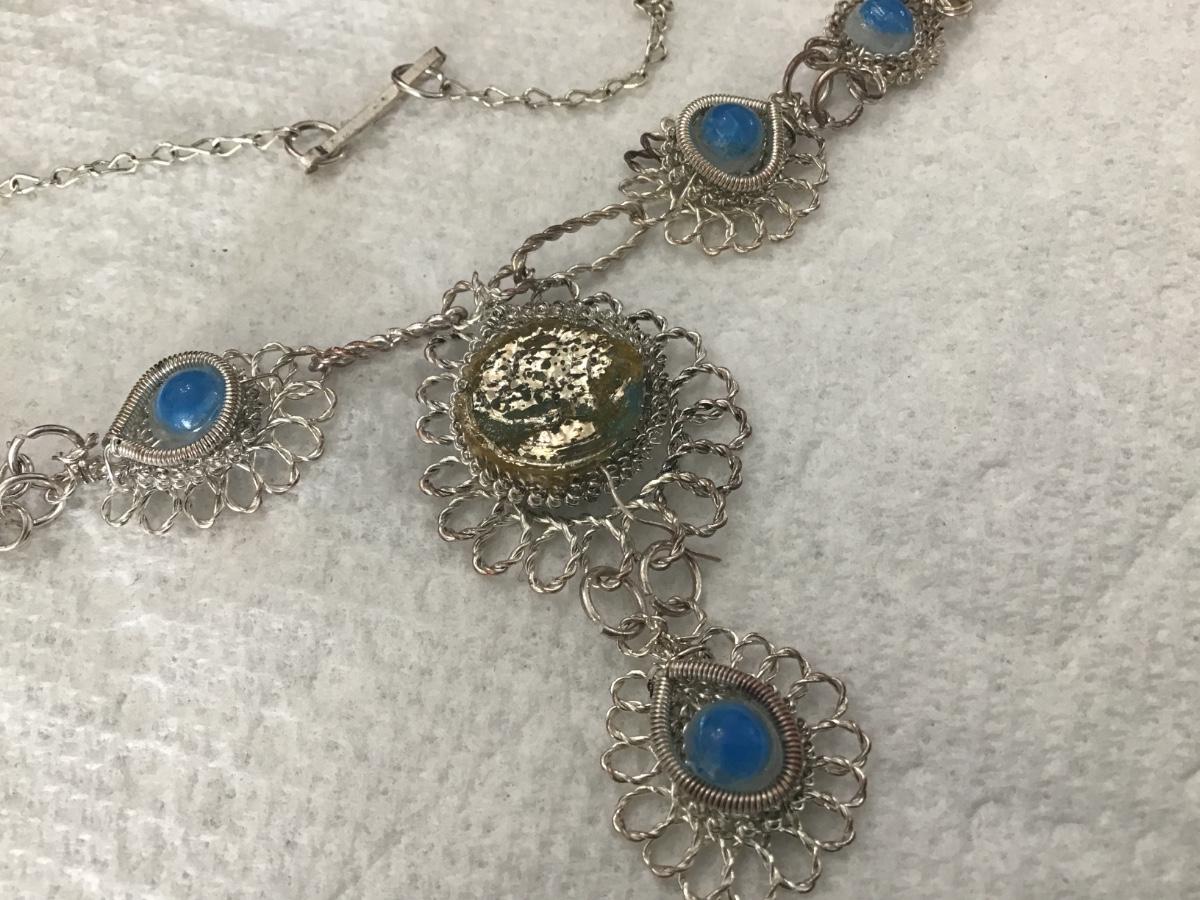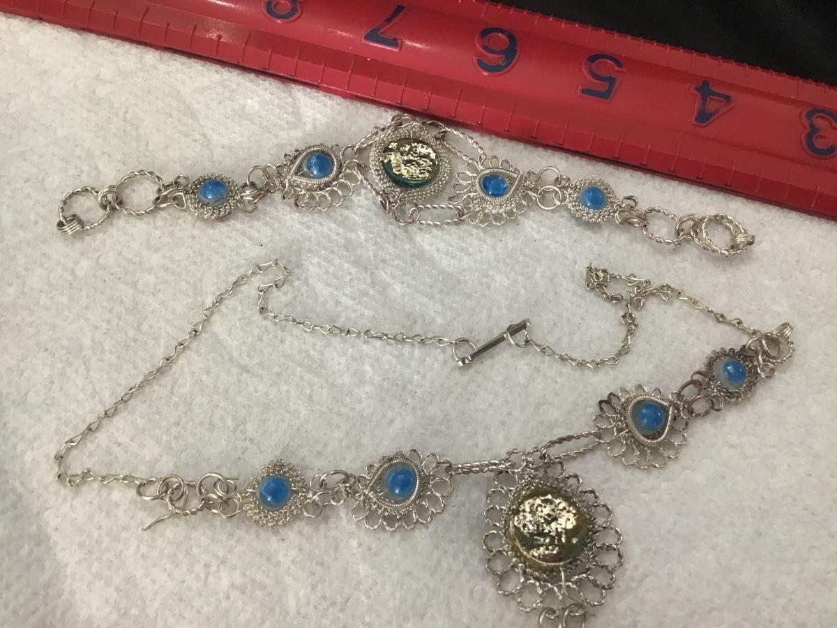 Vtg Silver Tone & Blue NECKLACE, BRACELET Set Woven Glass Stones