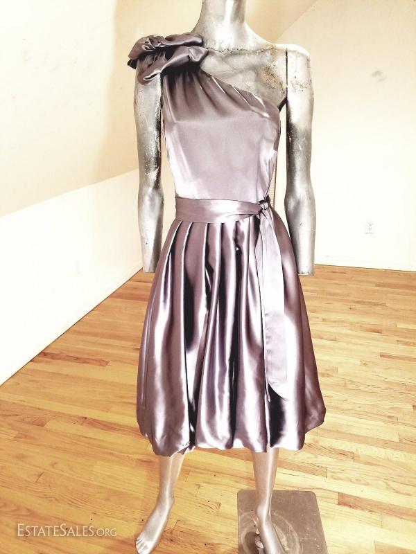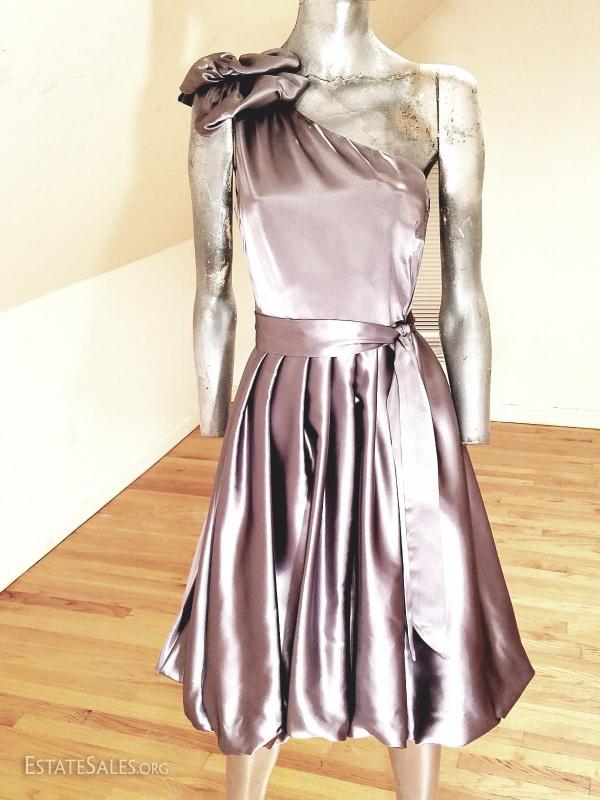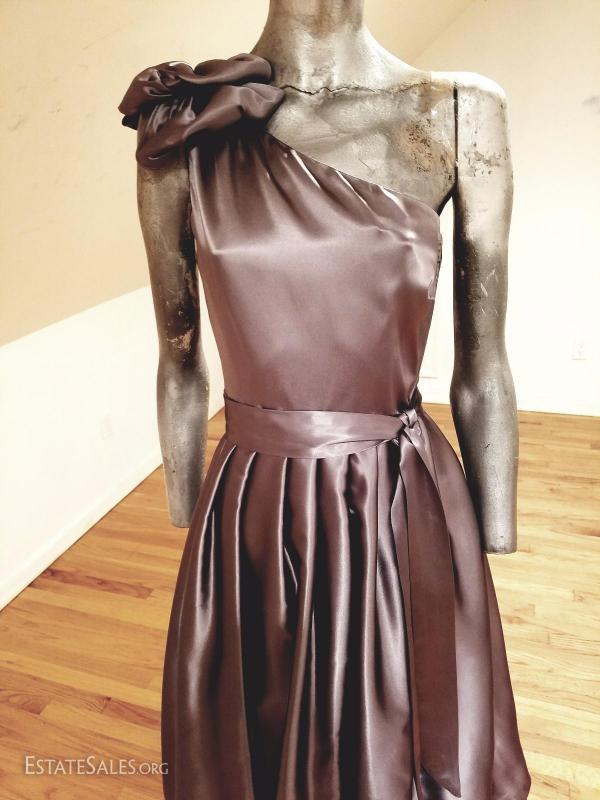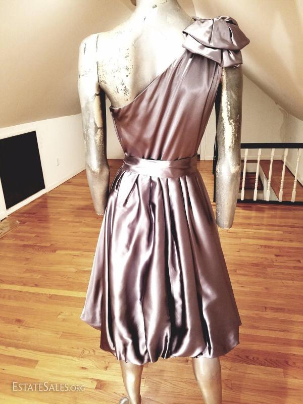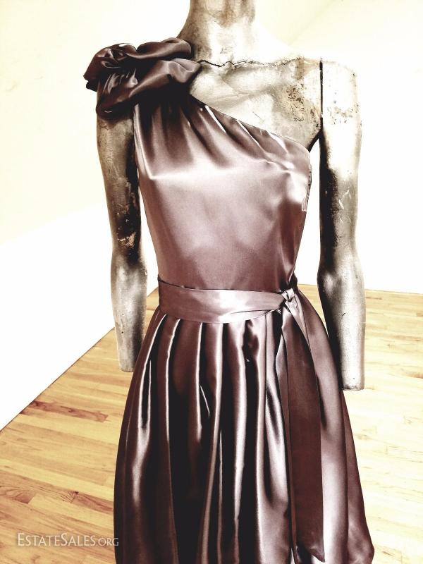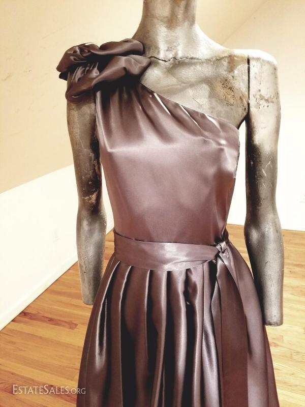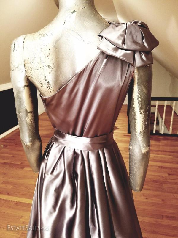 What a stunner this one is . Single shoulder with a kitten bow atop . Peau de soie fluid with tulle inside lining it is a site to see. In amazing condition this one is a beauty.