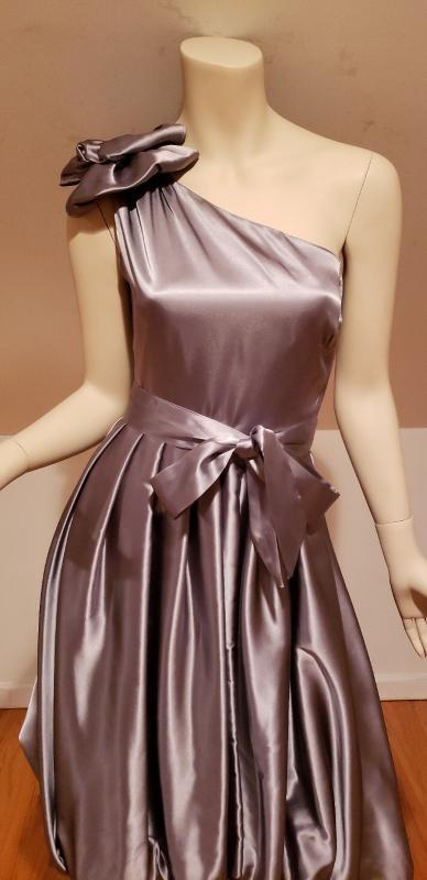 What a stunner this one is . Single shoulder with a kitten bow atop . Peau de soie fluid with tulle inside lining it is a site to see. In amazing condition this one is a beauty.