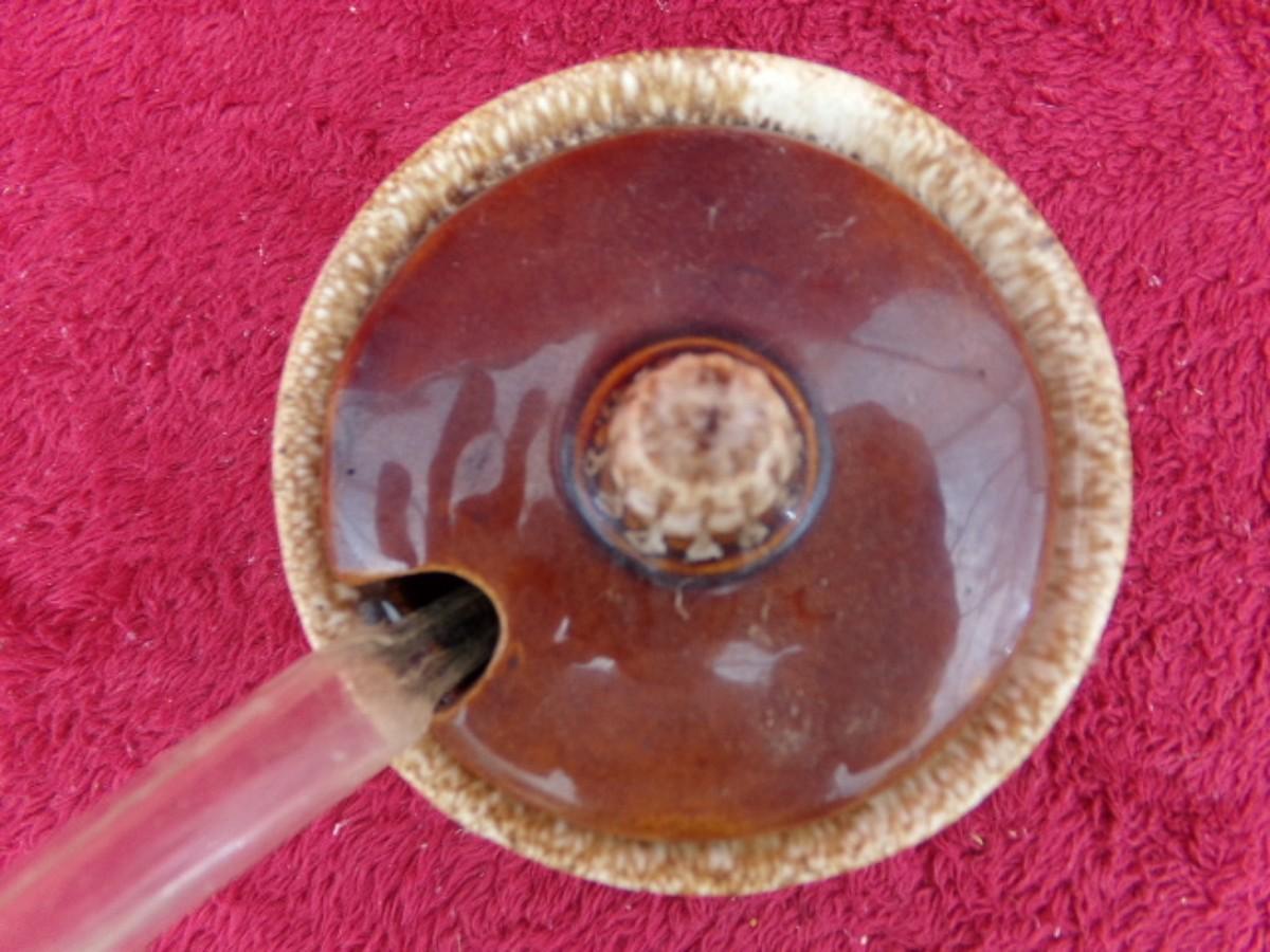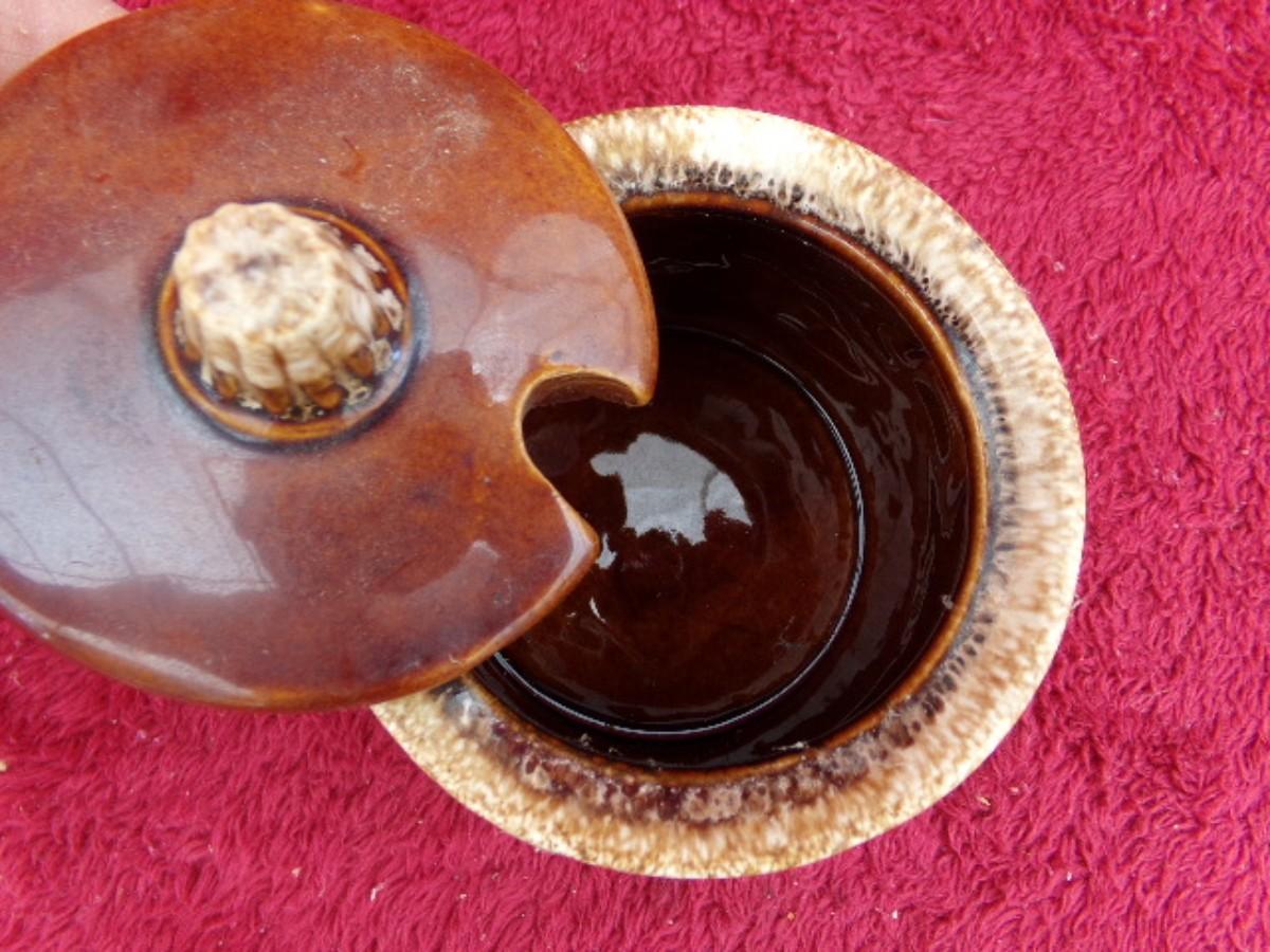 VTG small honey container for table service. Has a small coffee measure spoon with it. About 4-1/2" tall.