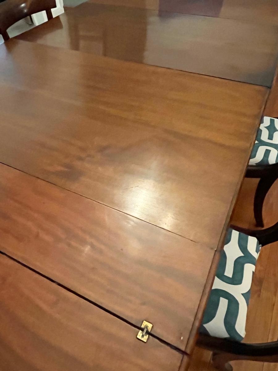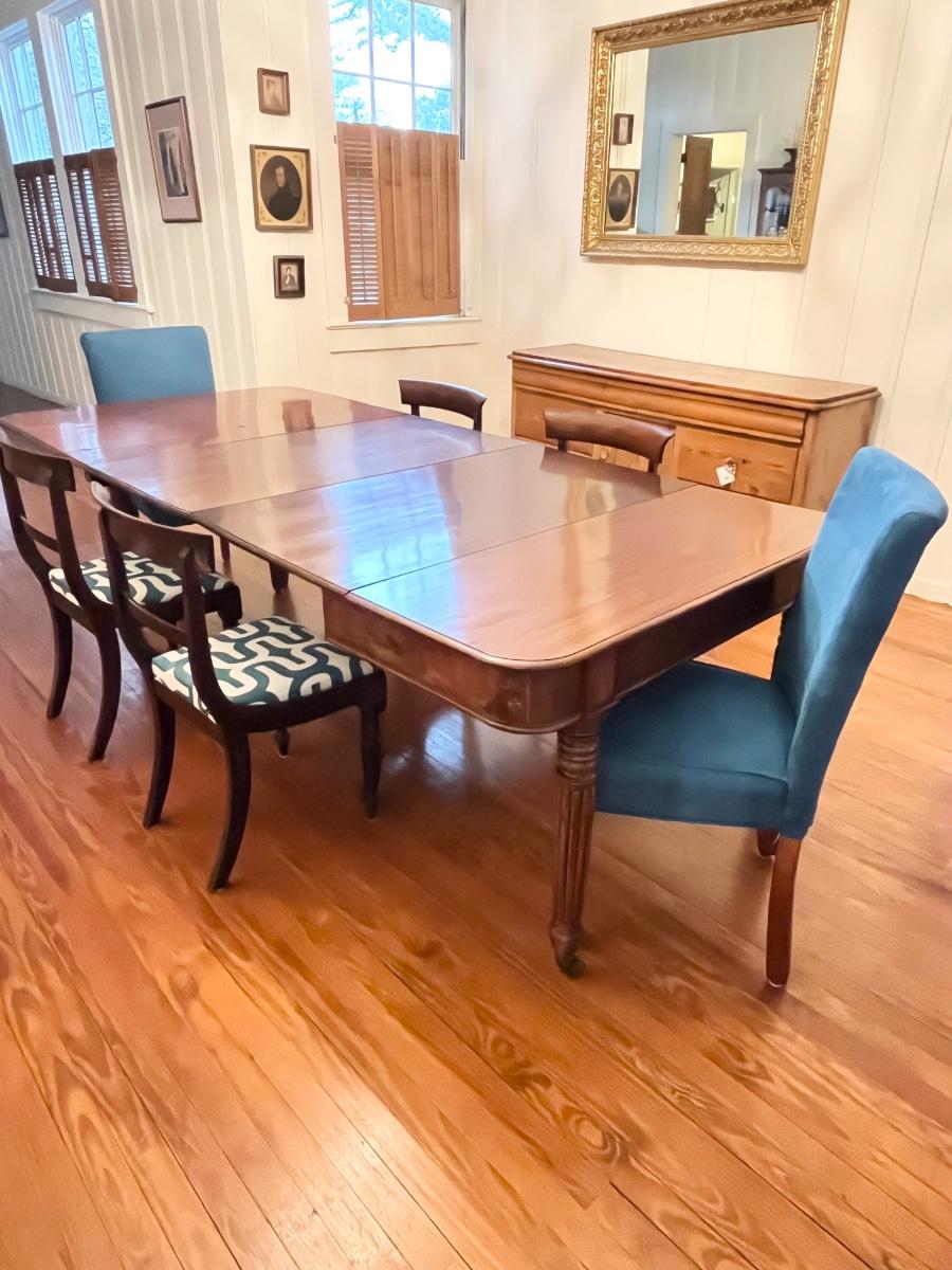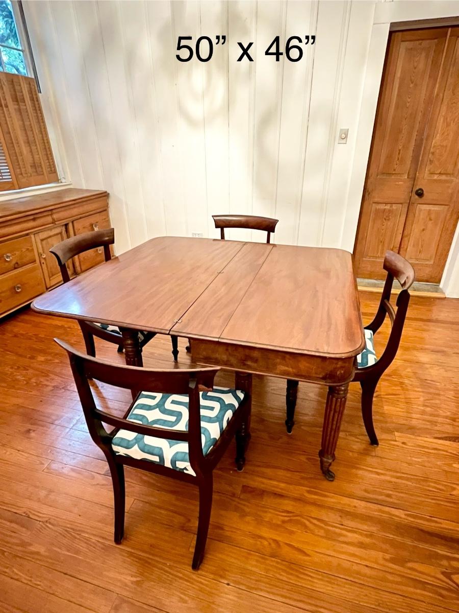 Table converts from 25” console table to a full size 98” dining table when you add the (2) 24” leaves ~ See Photos ~ Chairs not included with table but can be purchased separately. Measurements of the table without the leaves 50" x 46" ~ Sticker on front is the Antiqued Dealers of America Association Sticker