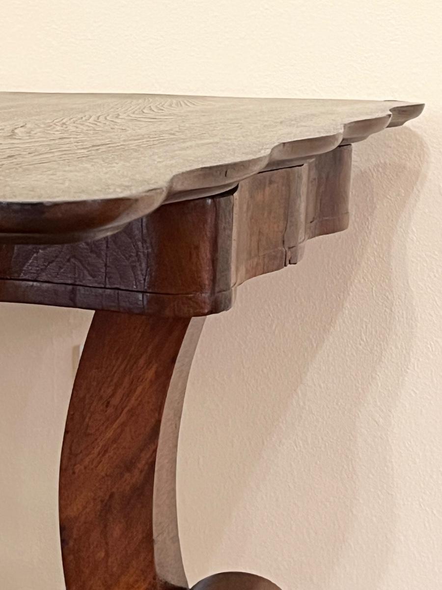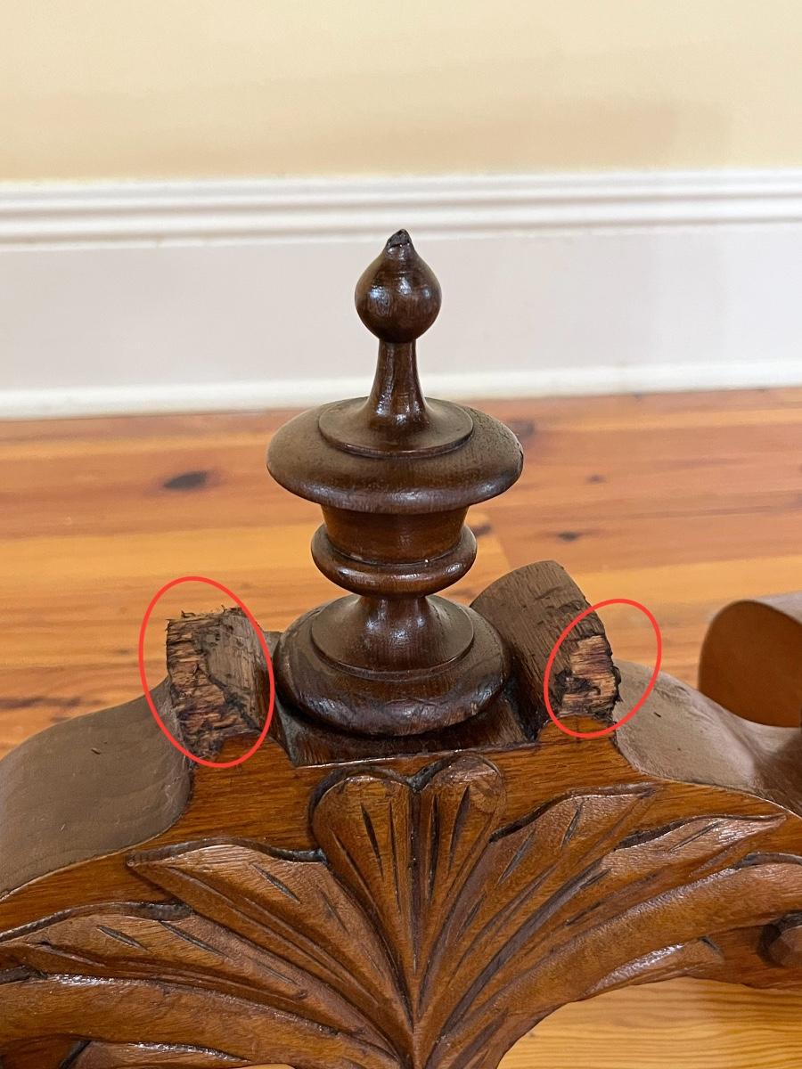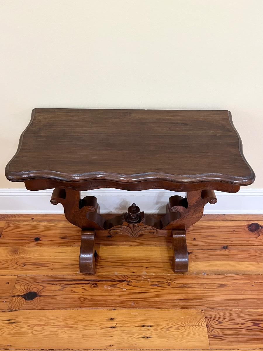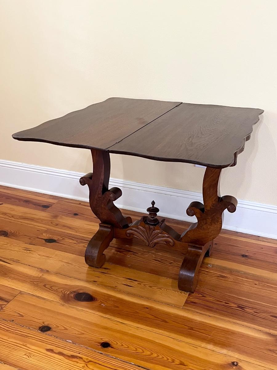 As a side table 28 3/8” H x 33 3/4” W x 16.5” ~ As a card table 27.5” H x 33 1/4” W x 34 1/4” D ~ No name brand ~ There are 2 small spots where the wood has been chipped off as seen in photo