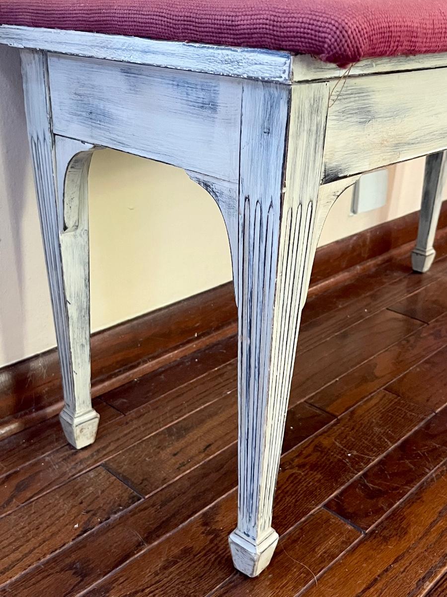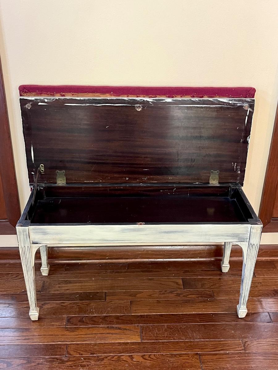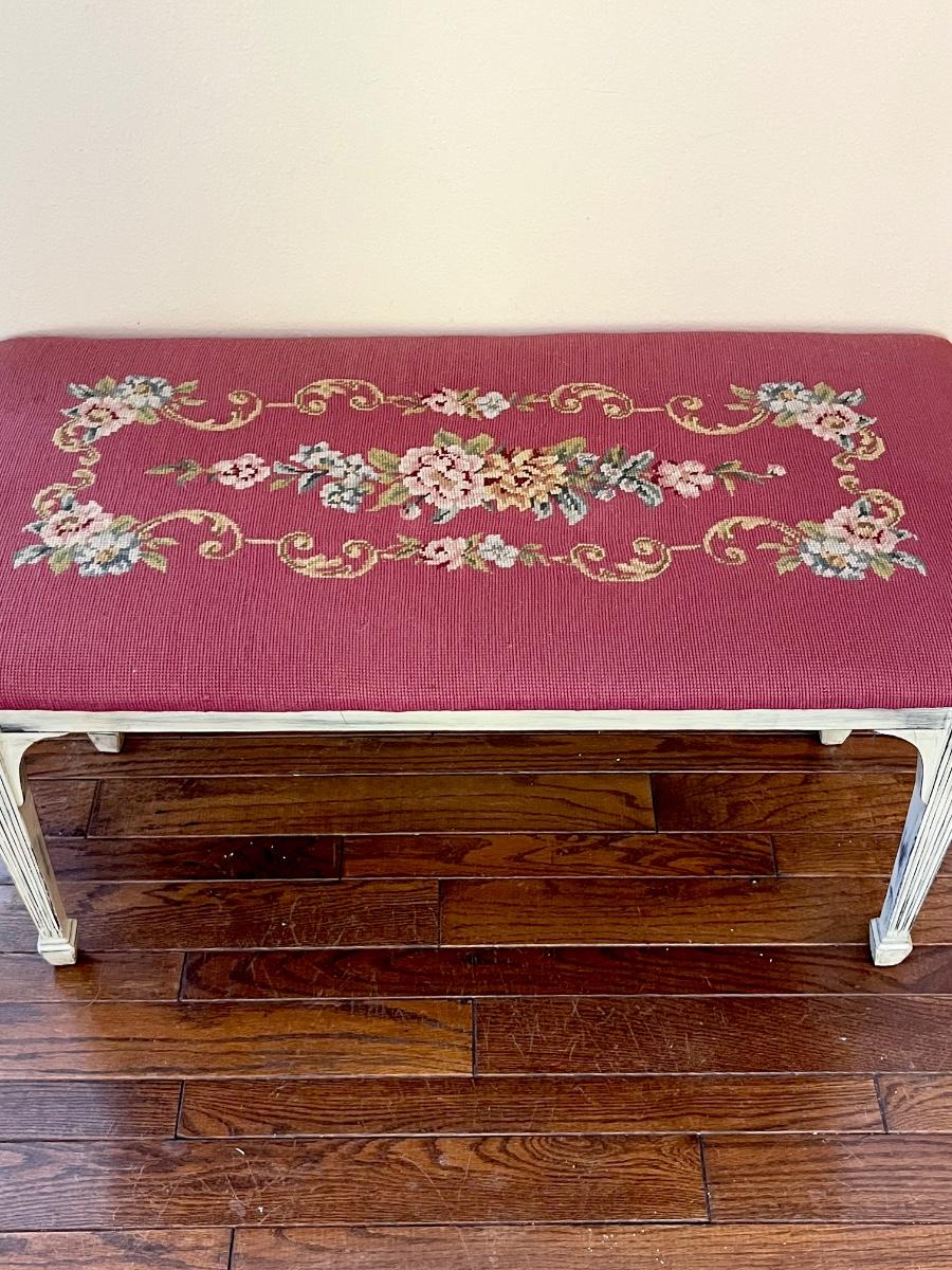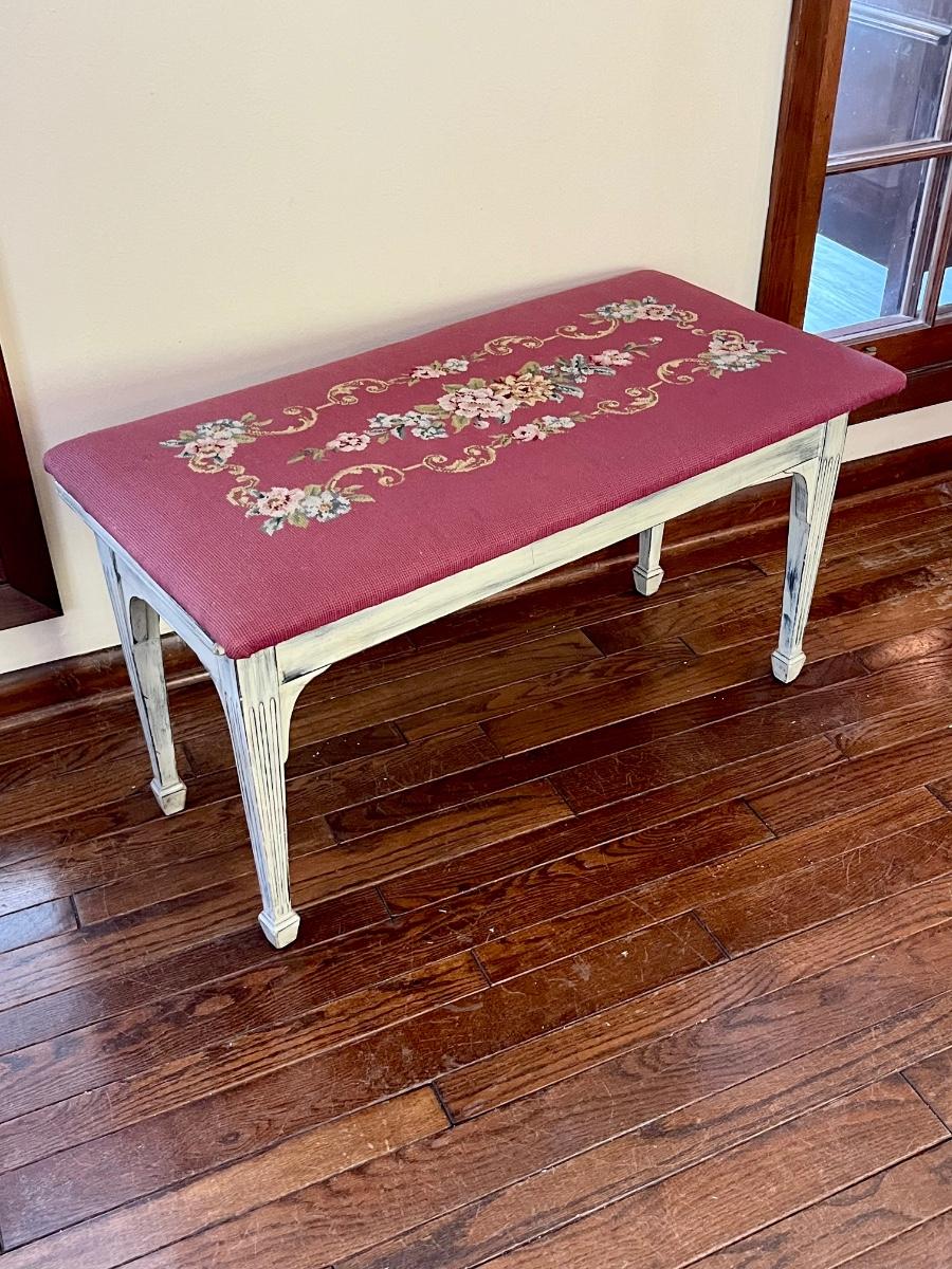Vtg. Solid Wood Painted & Distressed Piano Bench With Needlepoint Seat