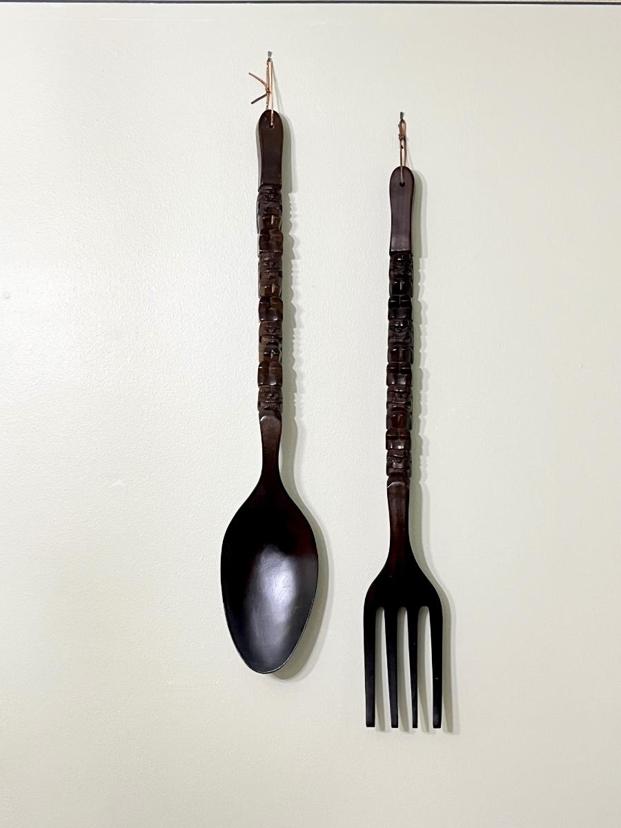 Vtg. Solid Wood Tiki Carved 36.5” Fork & Spoon