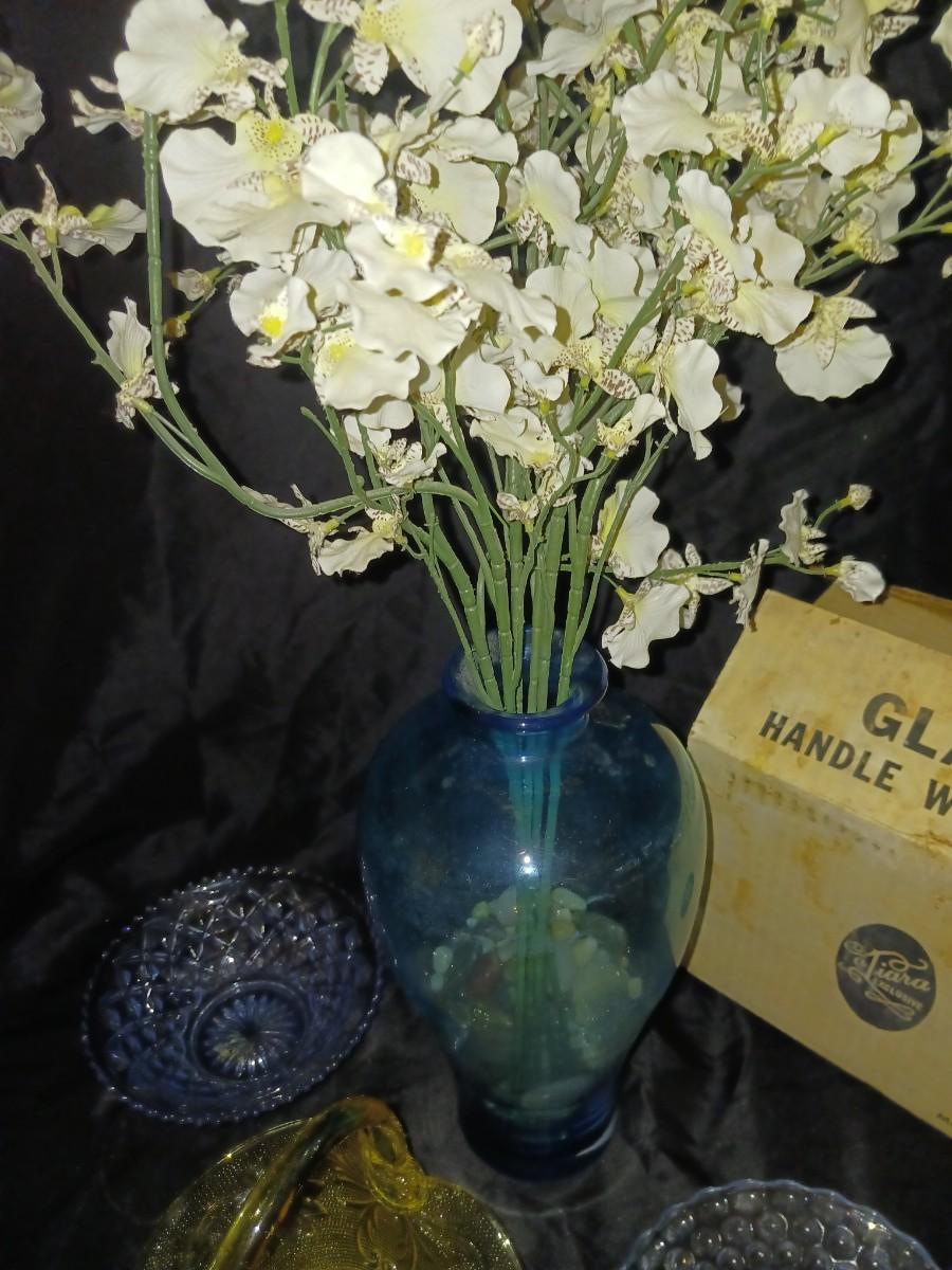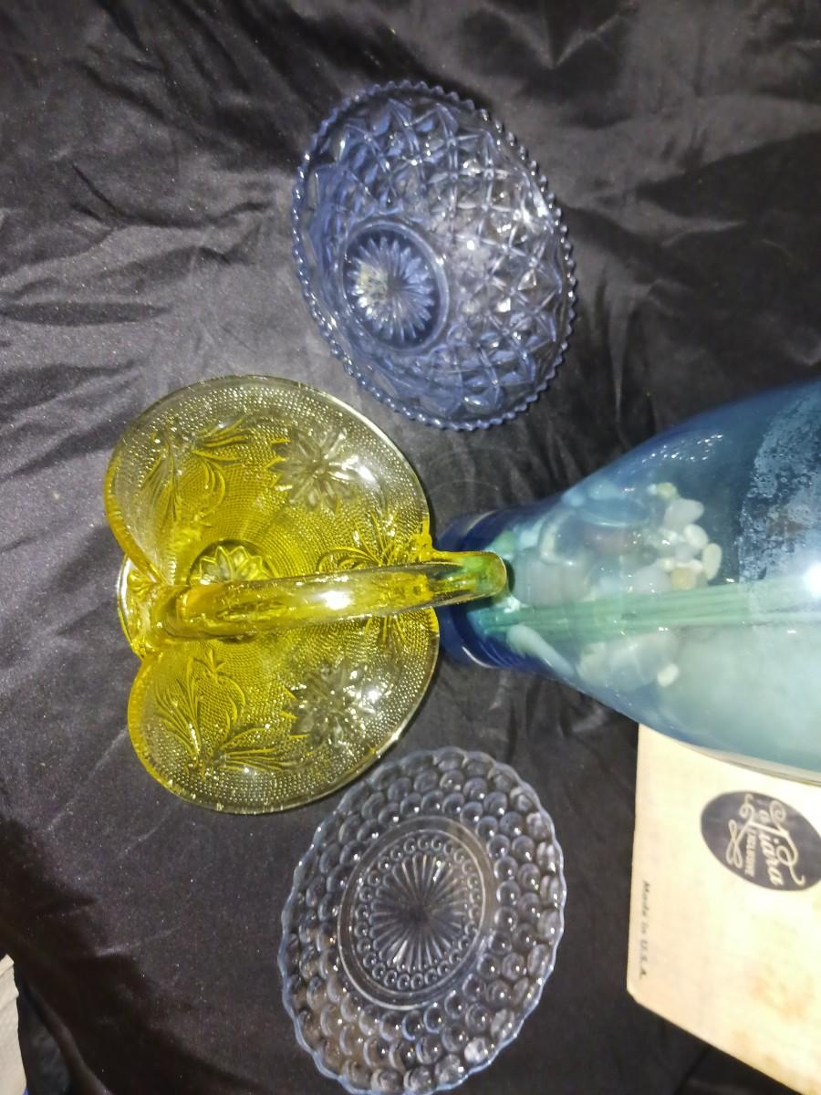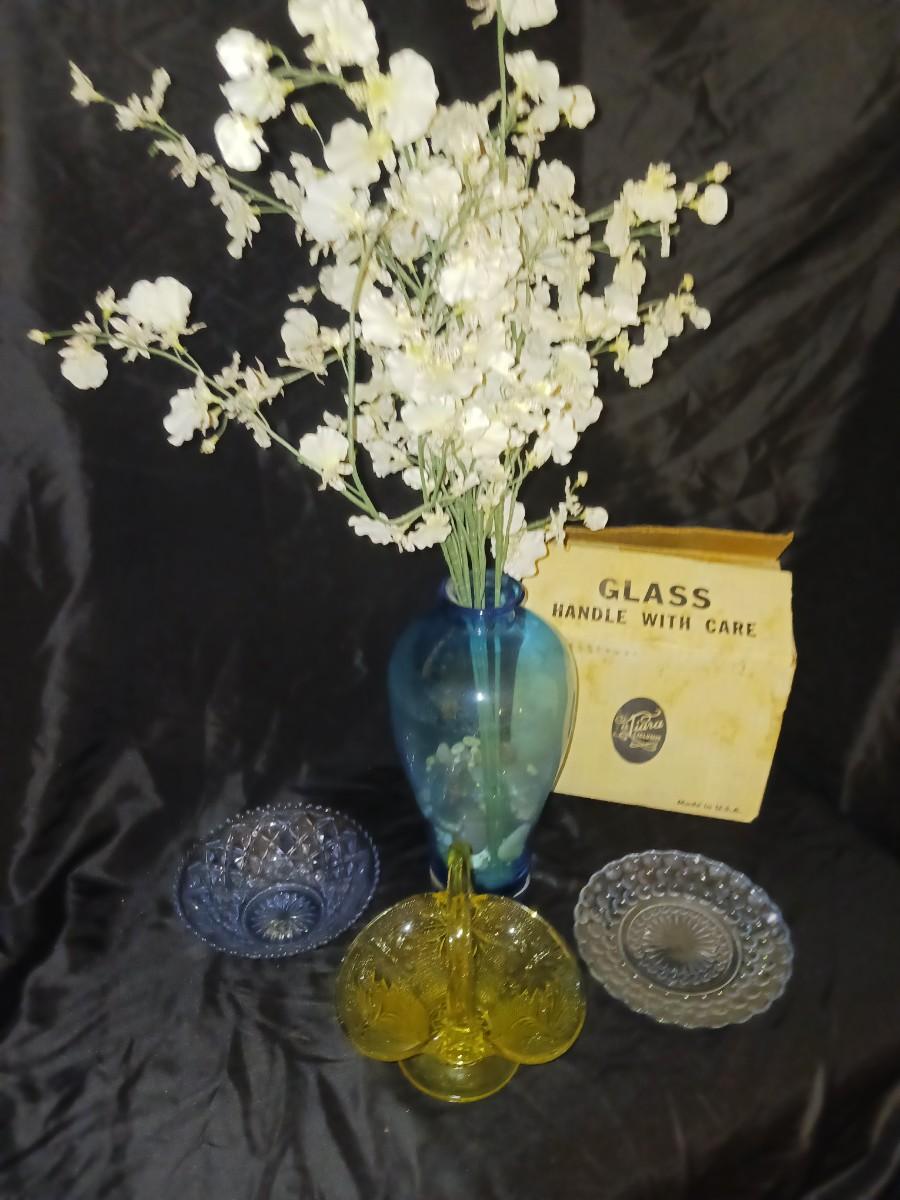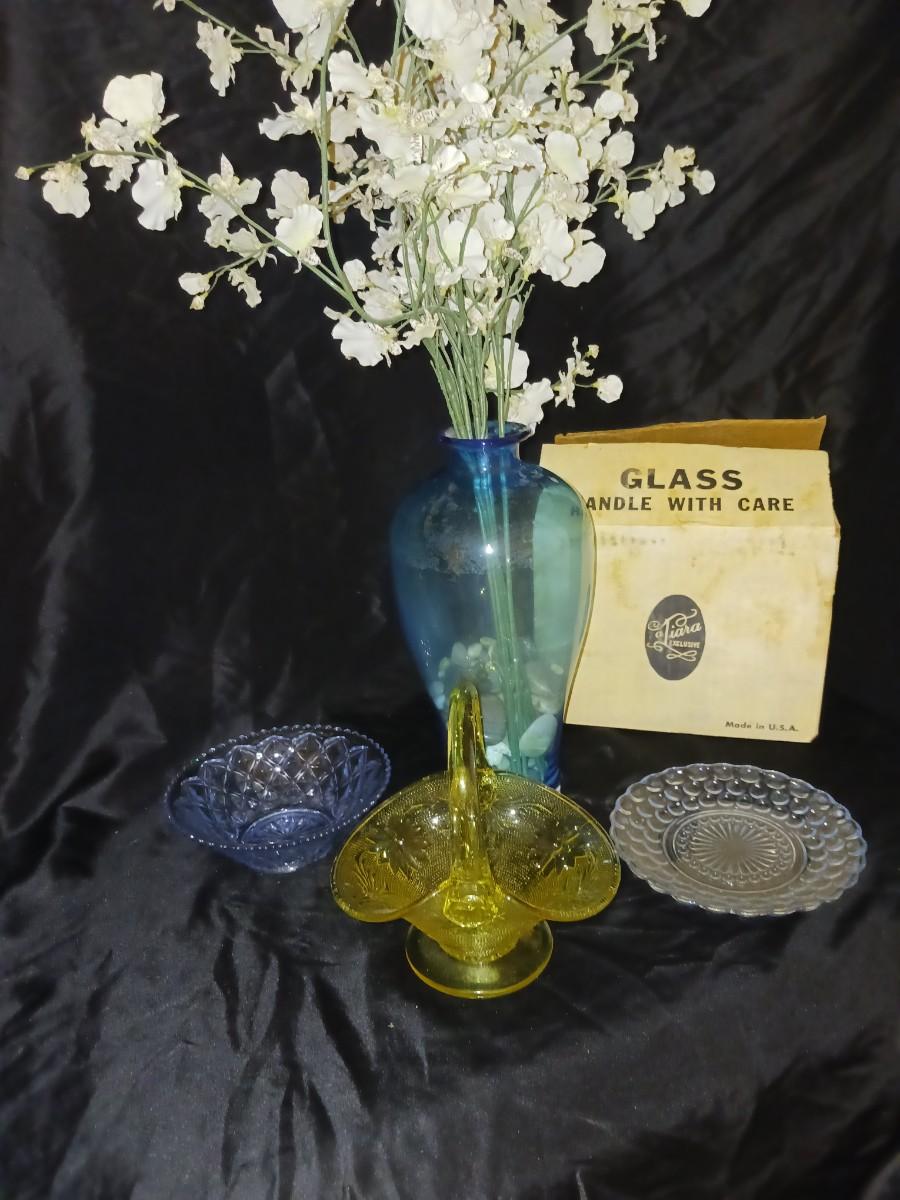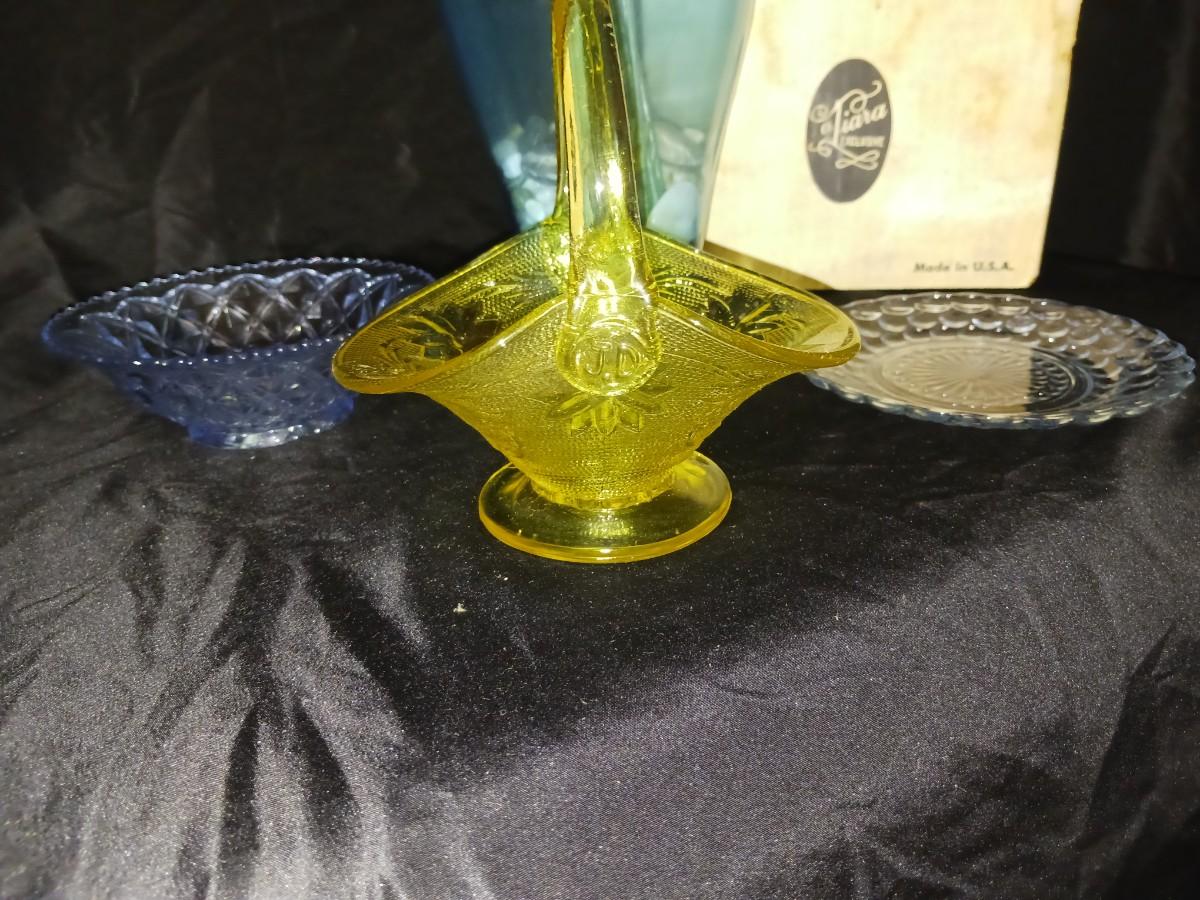 VTG TIARA GLASS BASKET, IMPERIAL BLUE DIAMOND BLOCK CUT BOWL, TEAL VASE & MORE!