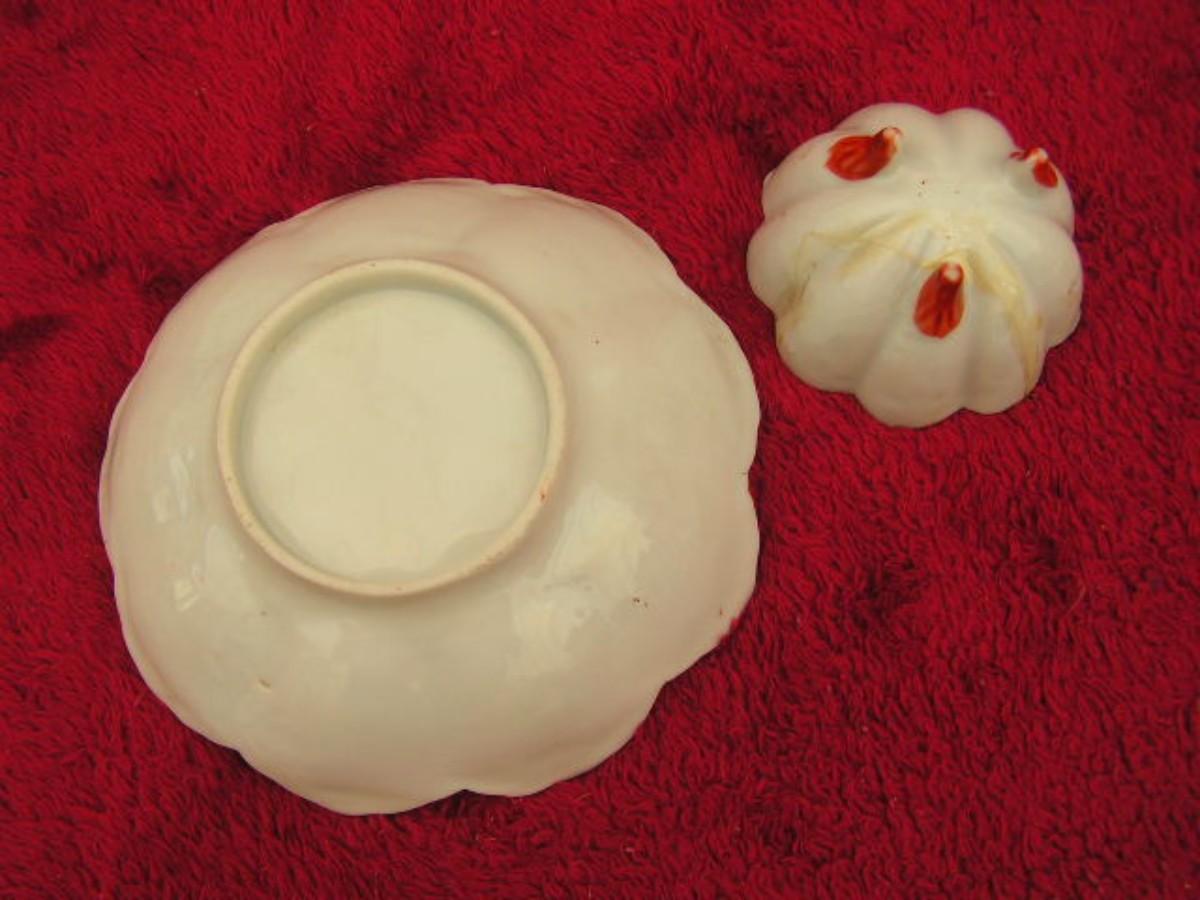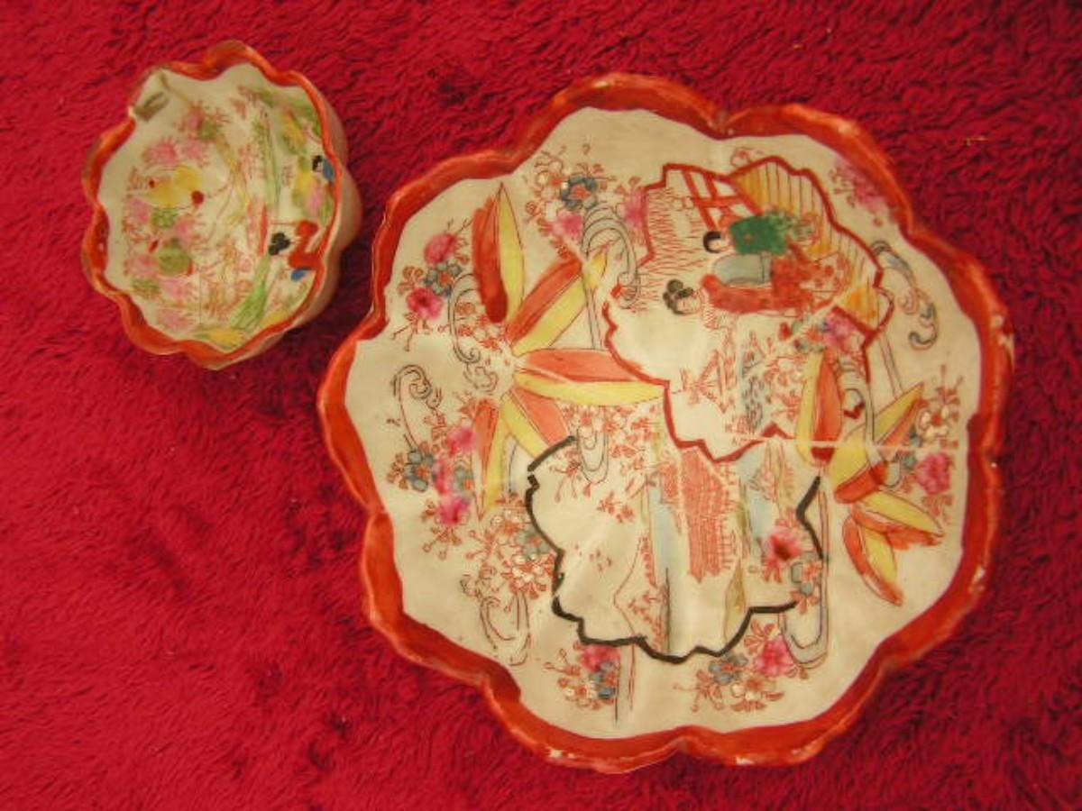 Vintage traditional Japanese porcelain bowl & footed sake cup w/ “Geisha Girl” designs. Both pieces have a scalloped edge flower shape. Production of this type of porcelain was broadly made from the late 19th century thru the 1980s. This example is most likely hand painted considering the irregularities on the edges that look like chips but are actually painting flaws. VG to EX