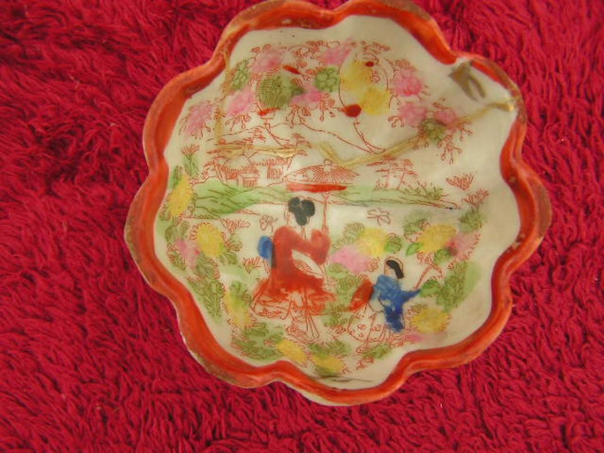 Vtg traditional Japanese porcelain bowl & sake cup w/ “Geisha Girl” designs.