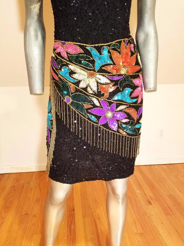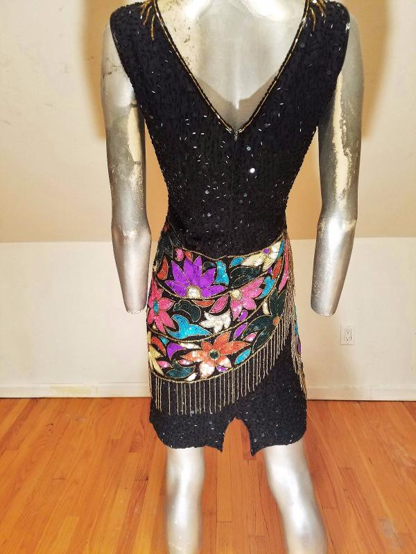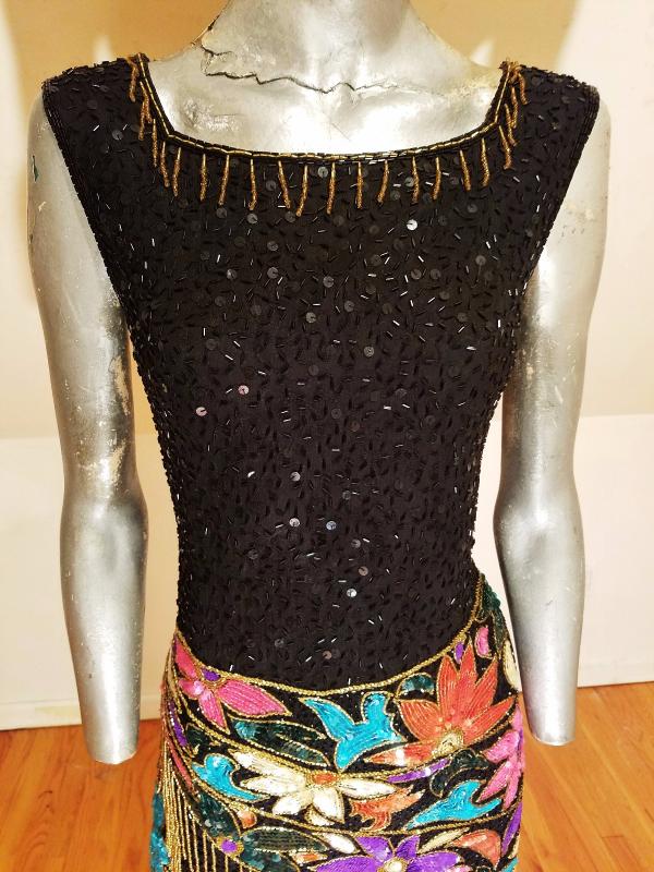 Vtg Unique bold sequined Art Deco floral beaded dress gold fringe