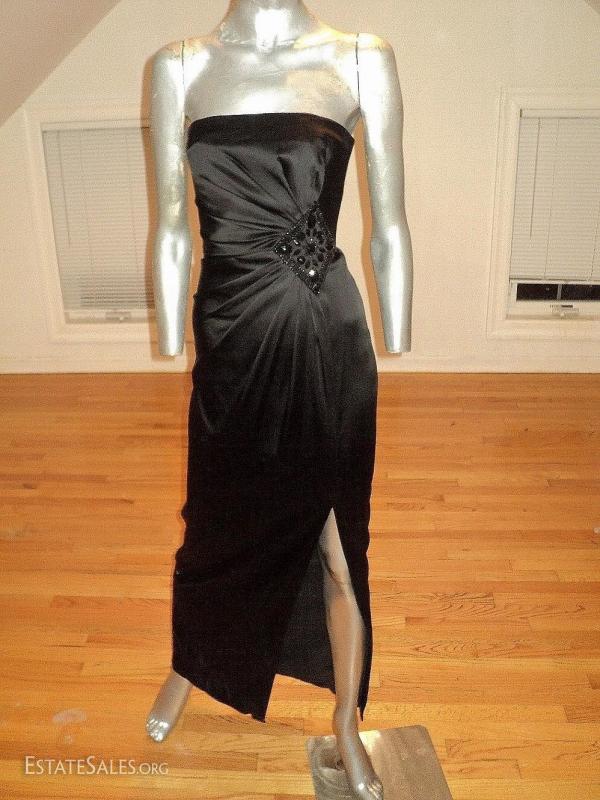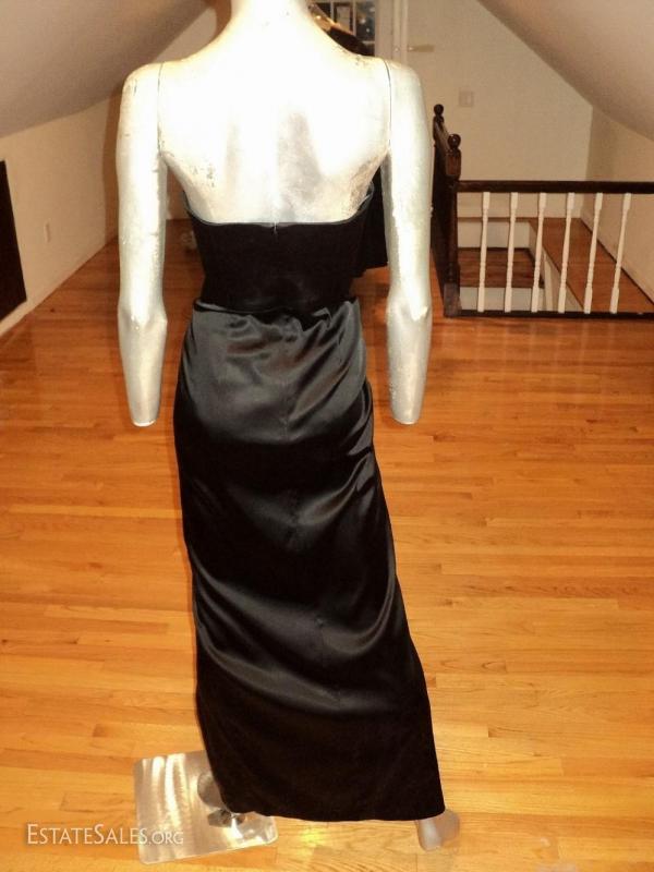 Black peau de satin stunner. Vamp look gathered at the side waistline with an embroidered onyx beaded brooch. Also a high slit. A Stunner
