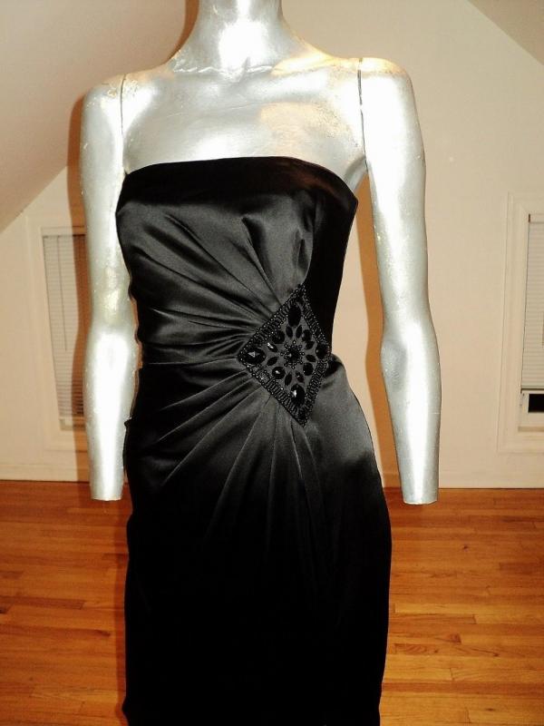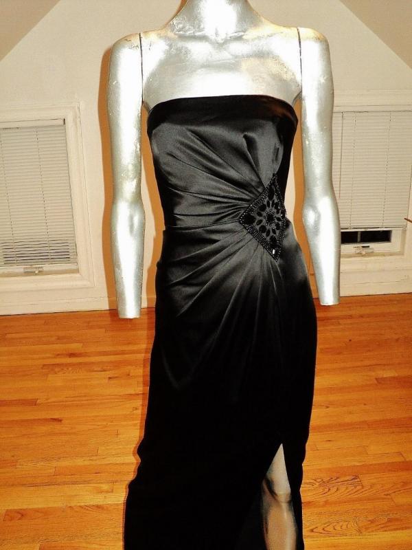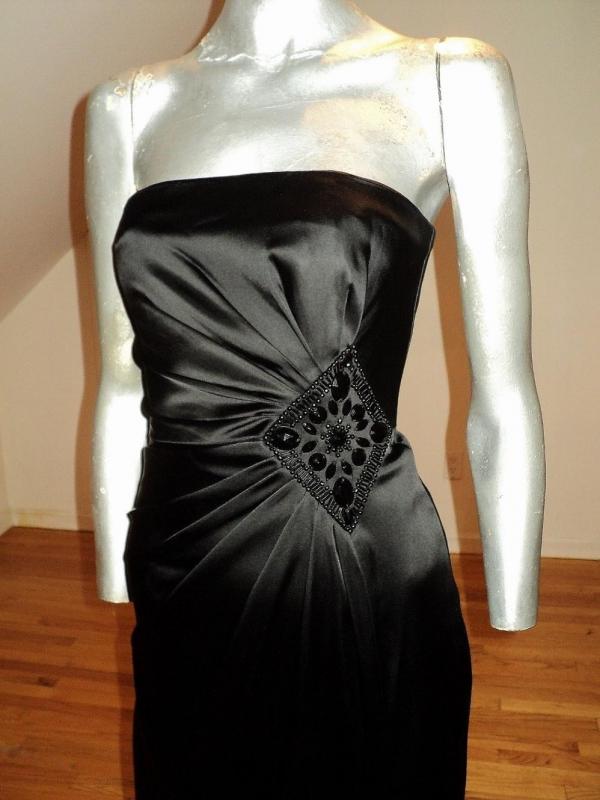 Black peau de satin stunner. Vamp look gathered at the side waistline with an embroidered onyx beaded brooch. Also a high slit. A Stunner