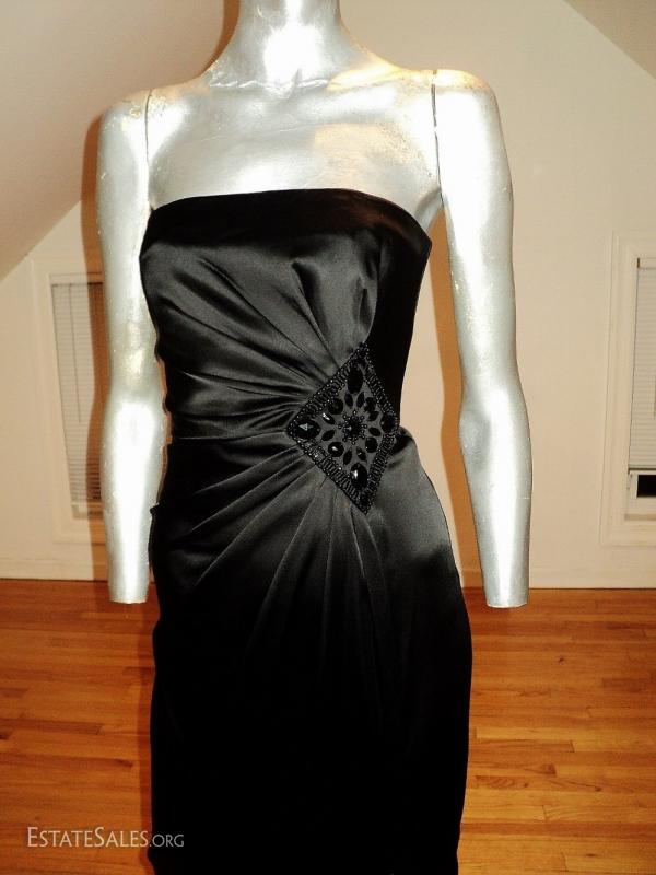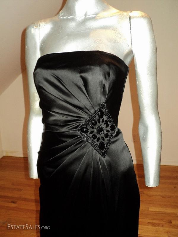 Black peau de satin stunner. Vamp look gathered at the side waistline with an embroidered onyx beaded brooch. Also a high slit. A Stunner