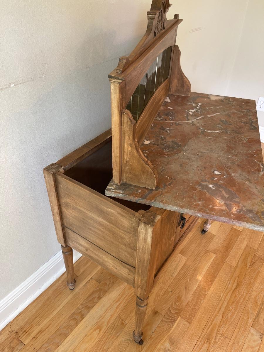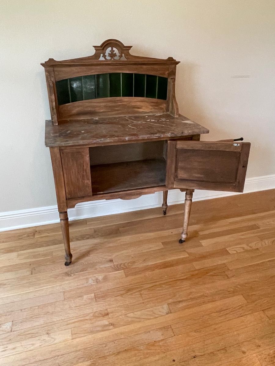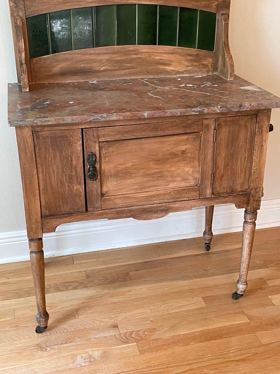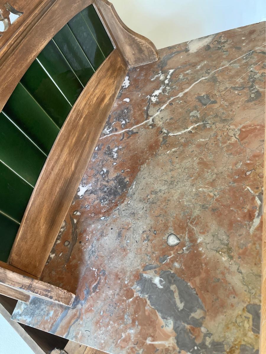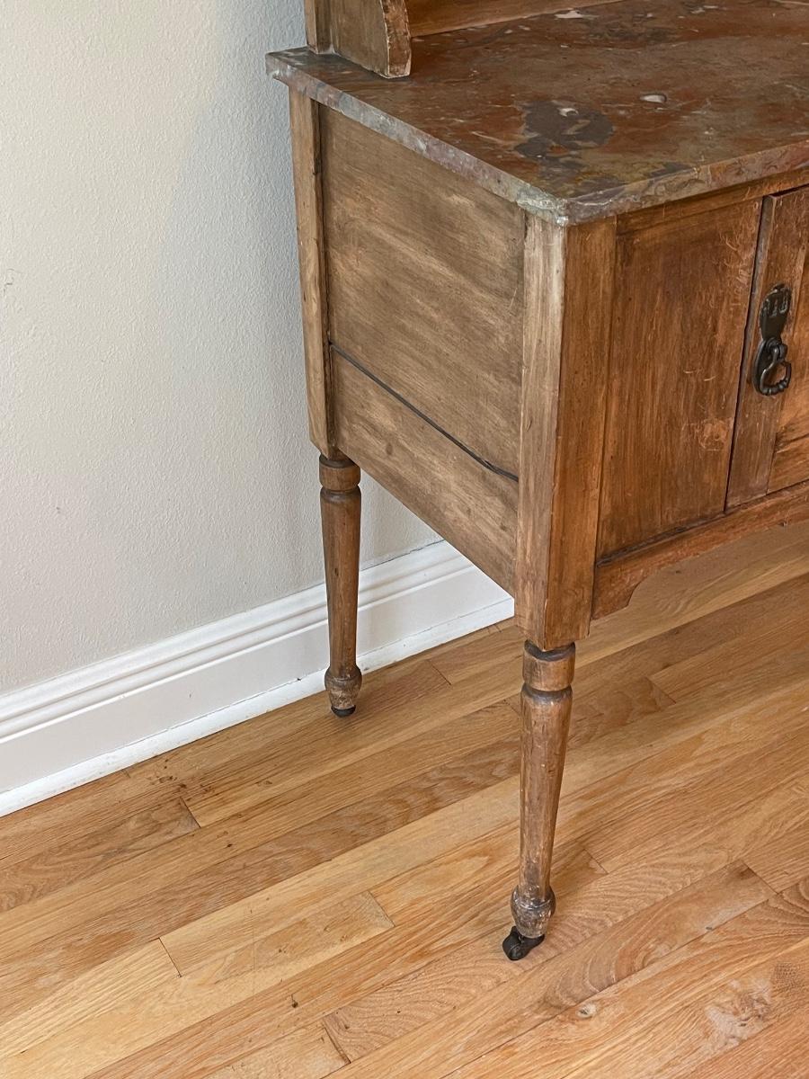 Needs a little TLC ~ See photos ~ from floor to top of marble 31” H ~ top piece on marble is 17” H. Top piece is attached to the marble top, which is removable, see photos. ~ 33” W x 17 D ~