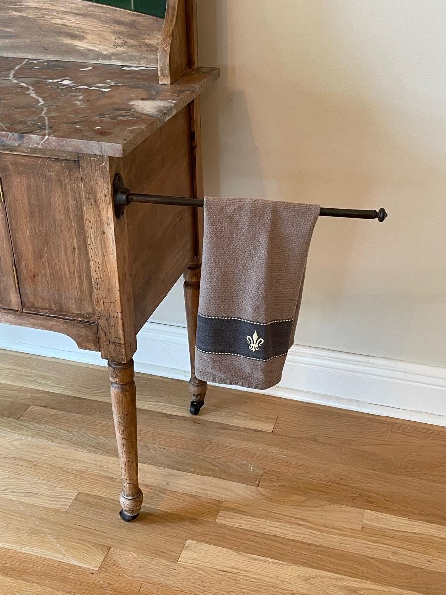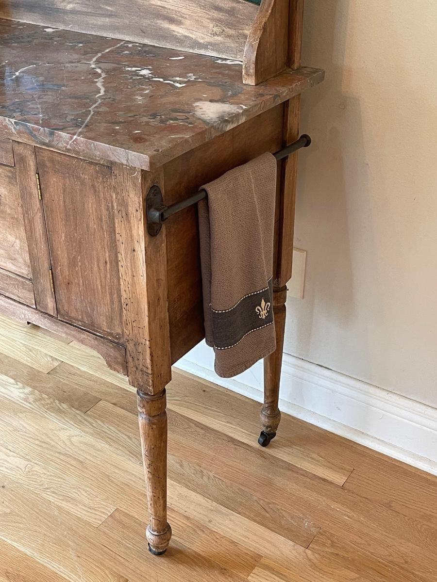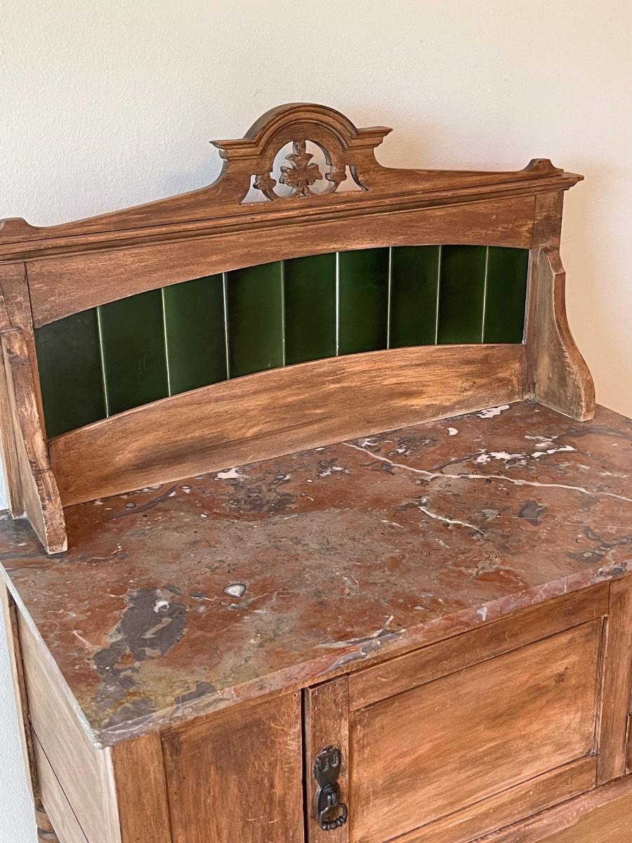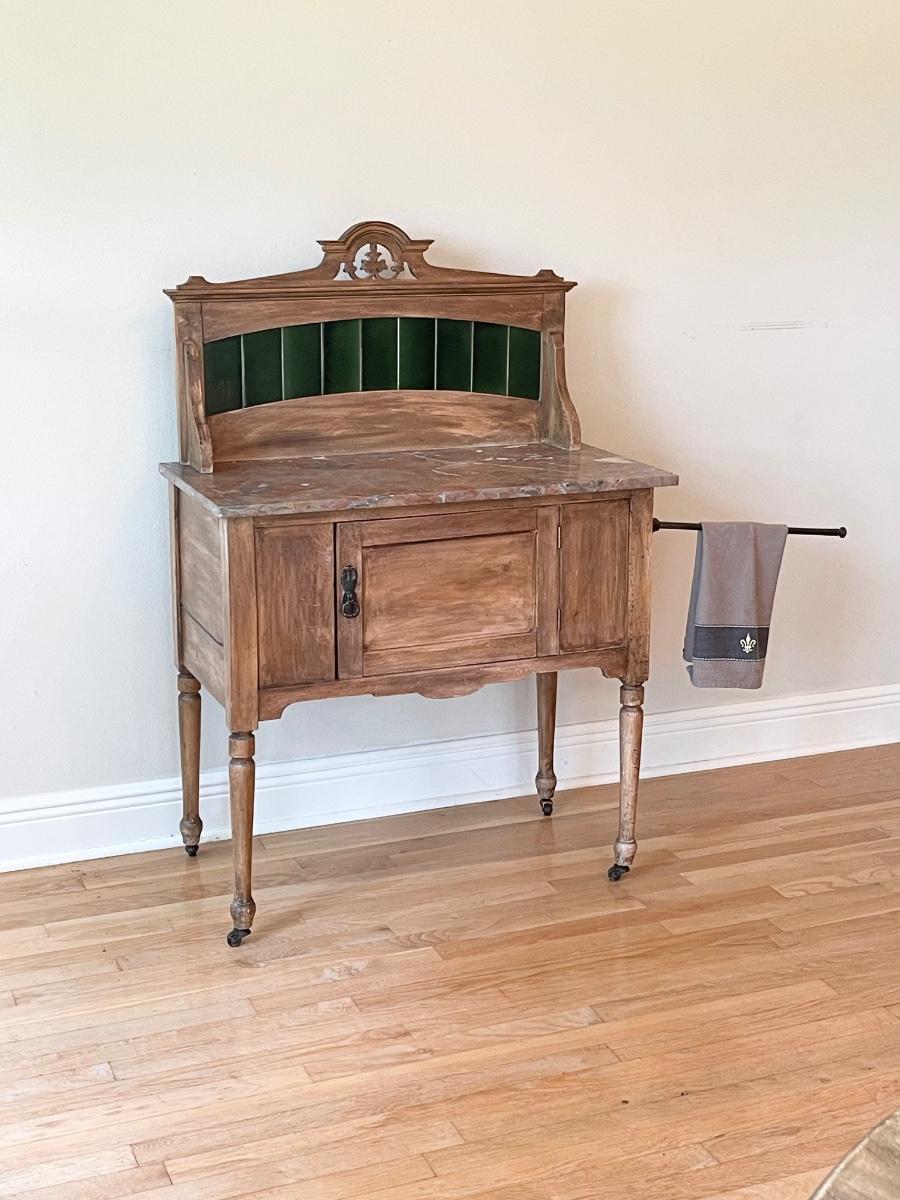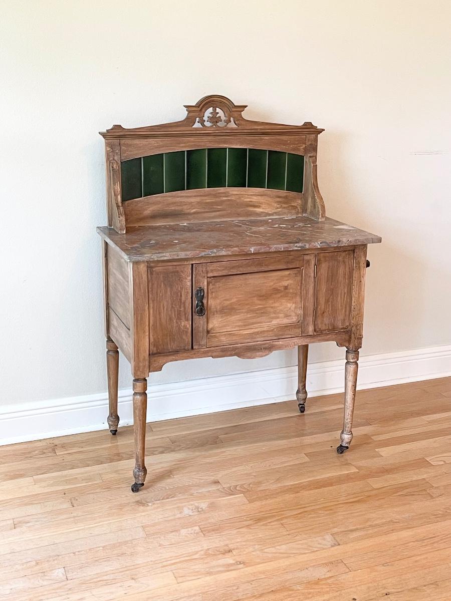 Needs a little TLC ~ See photos ~ from floor to top of marble 31” H ~ top piece on marble is 17” H. Top piece is attached to the marble top, which is removable, see photos. ~ 33” W x 17 D ~