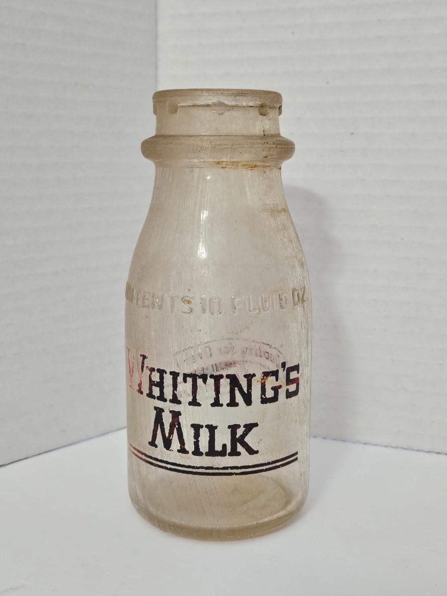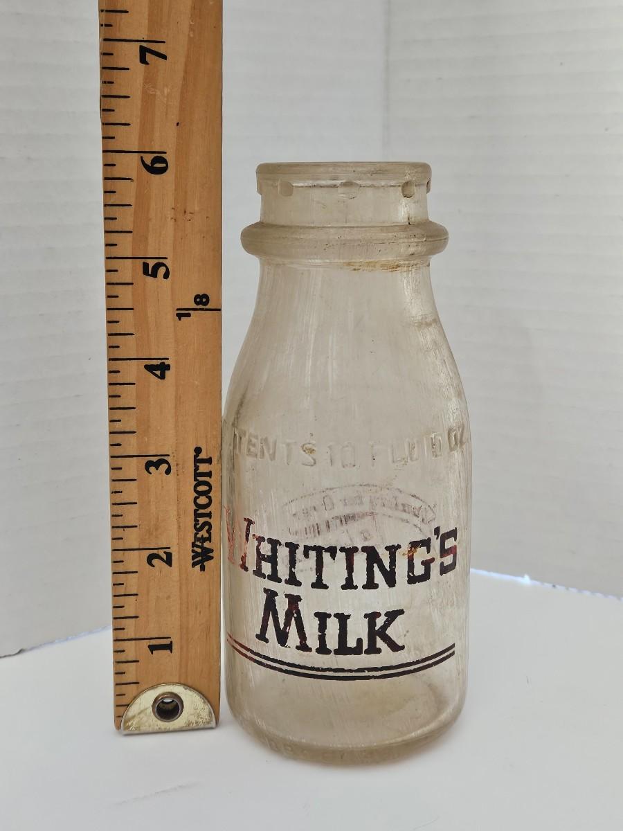 This is an authentic vintage Whiting's Milk glass bottle from Boston, Massachusetts. The clear glass bottle features applied color lettering (ACL) in red, which was a popular method for dairy branding in the mid-20th century before the decline of home milk delivery. This specific bottle has a 10 fluid ounce capacity and is a great piece of New England dairy history for any collector.