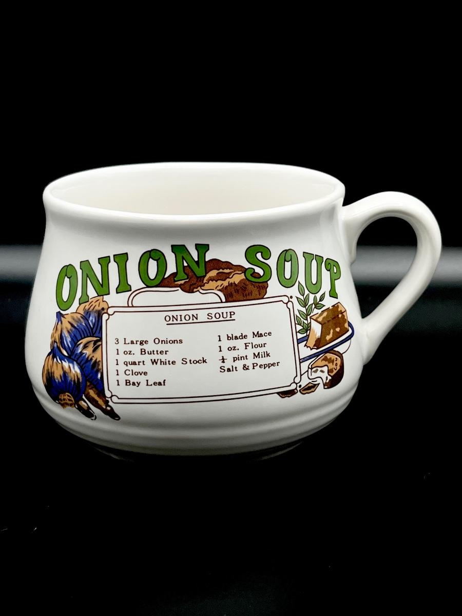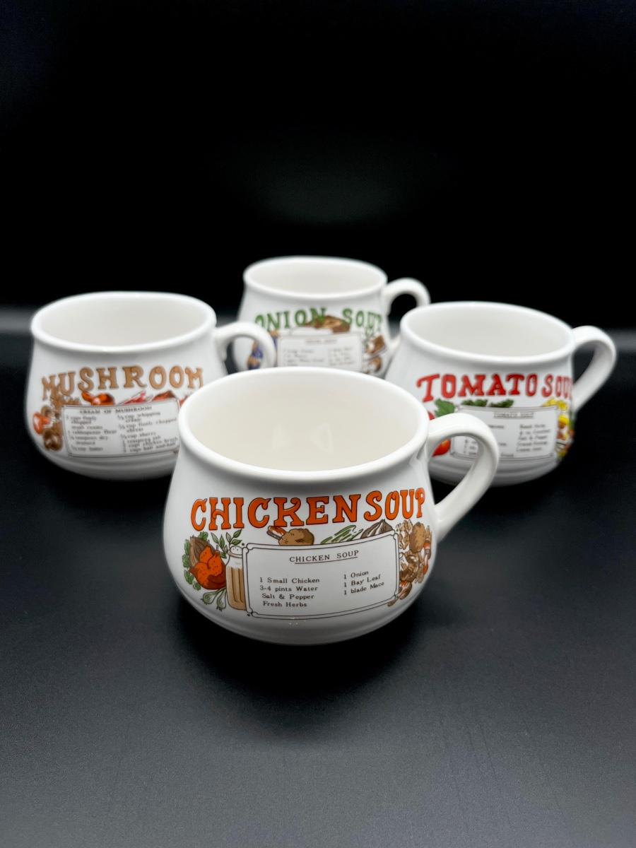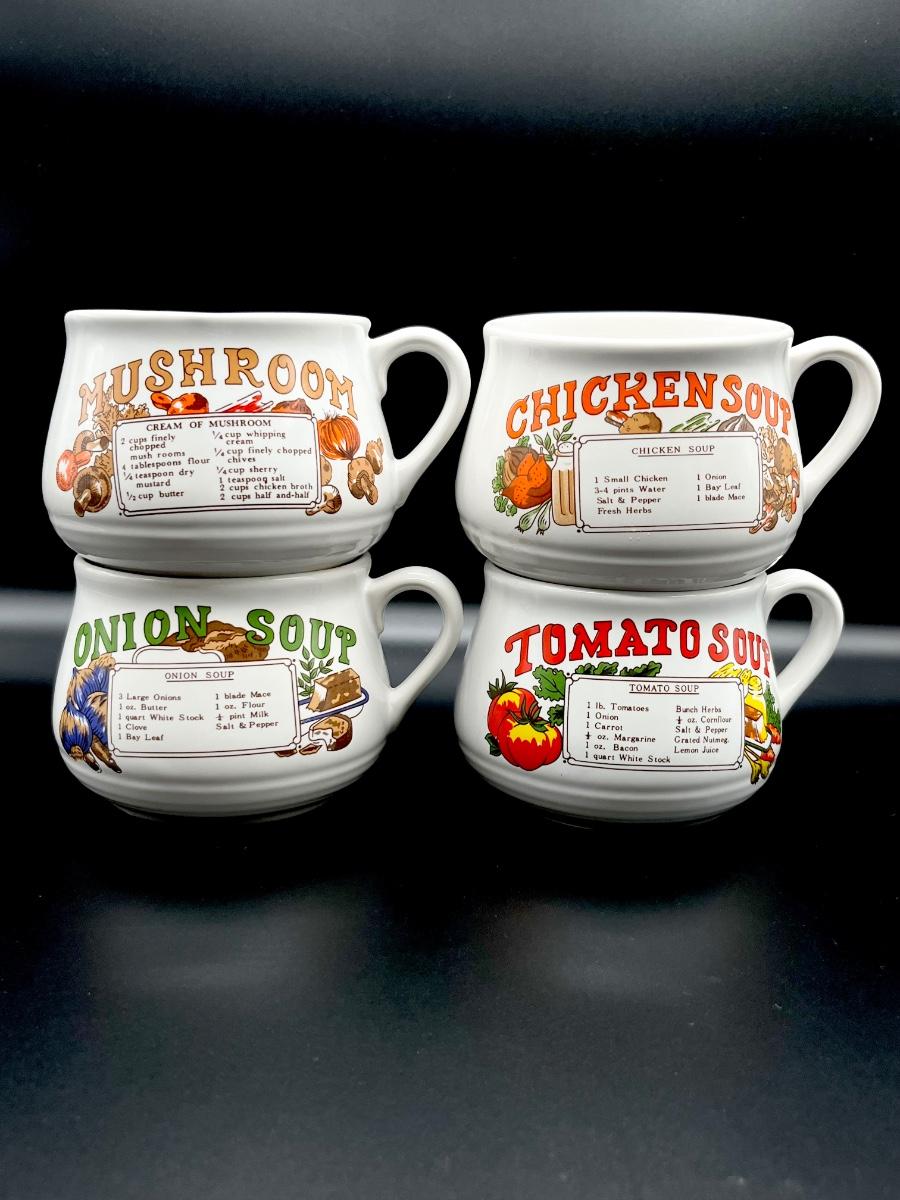 Vtg. Wide Soup Mugs With Recipe ~ Set Of Four (4)