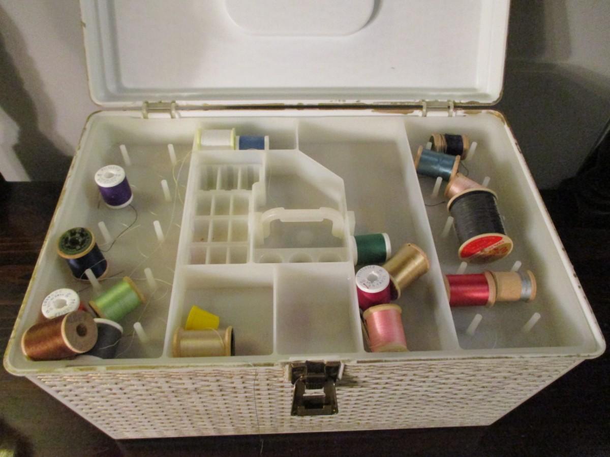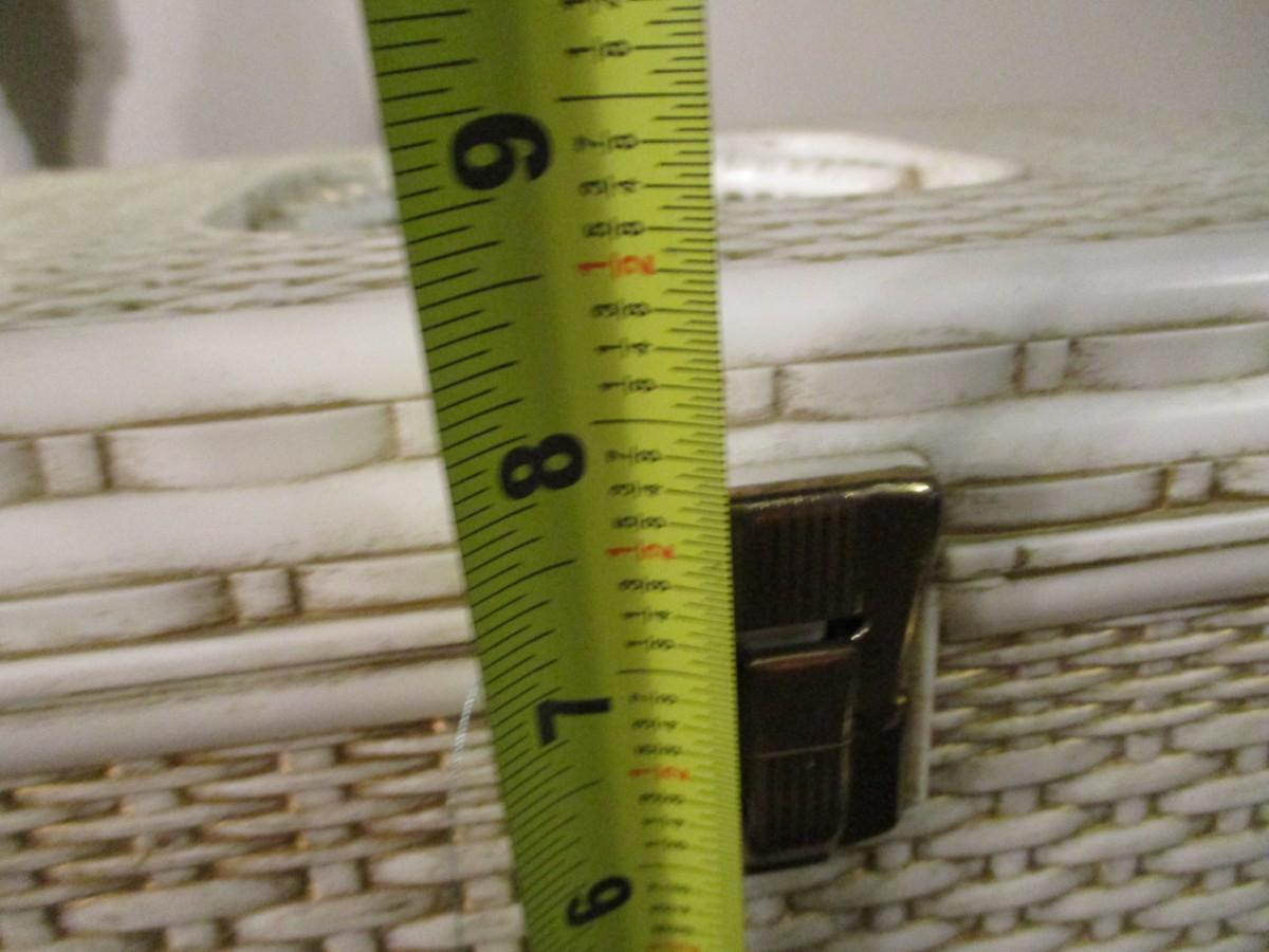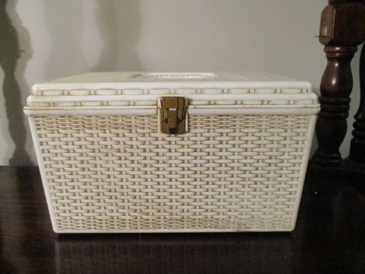 Vtg Wil-Hold Handled Sewing Box Faux Wicker White With Gold Wilson-MFG. Corp & Thread