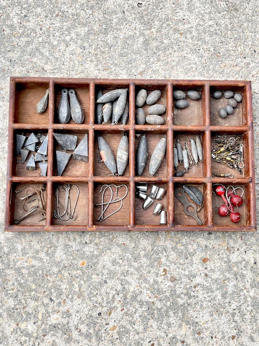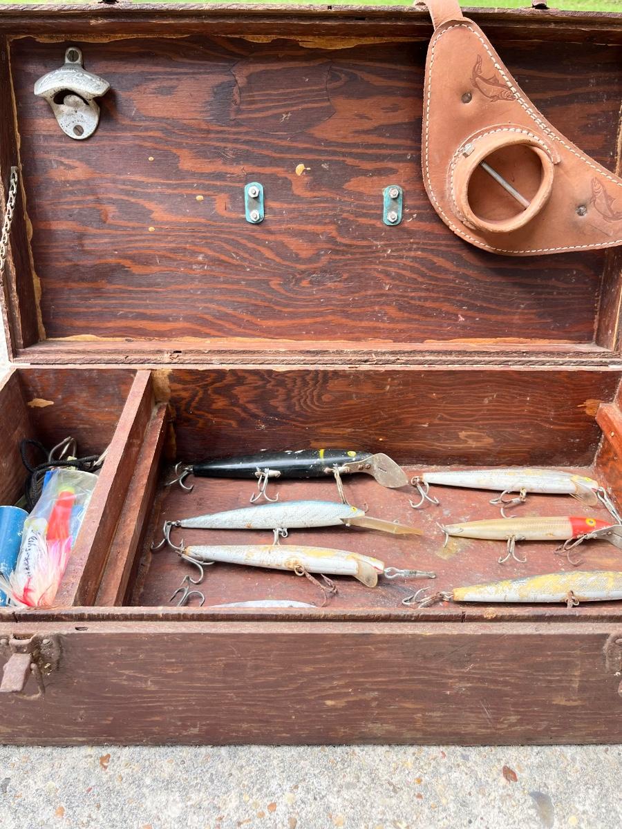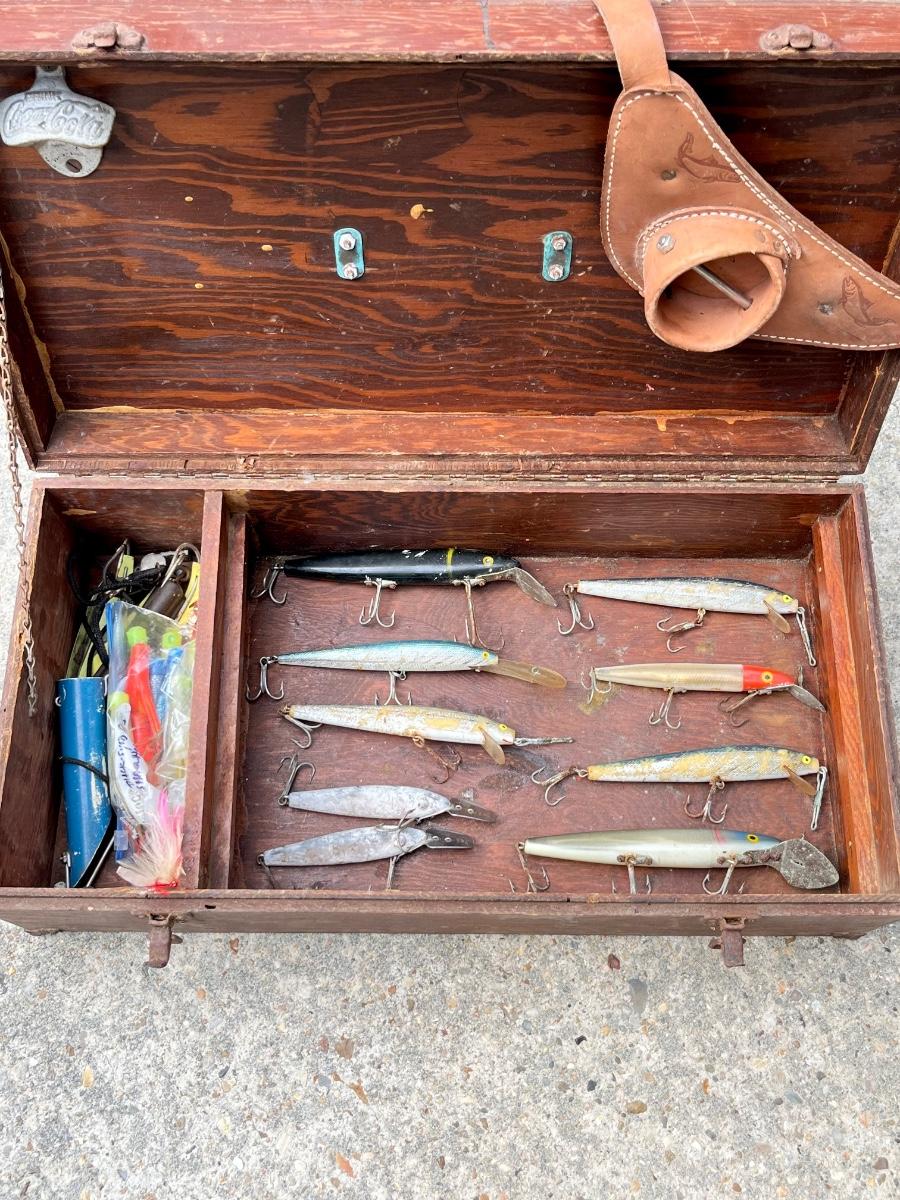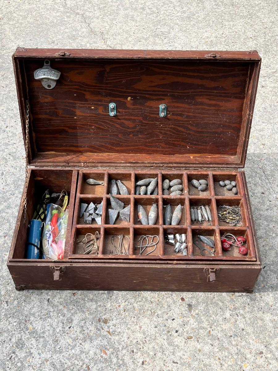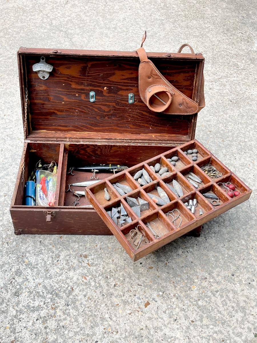 Great Grandaw's Wood Fishing Tackle Box & Tackle ~ Possibly Great Great!