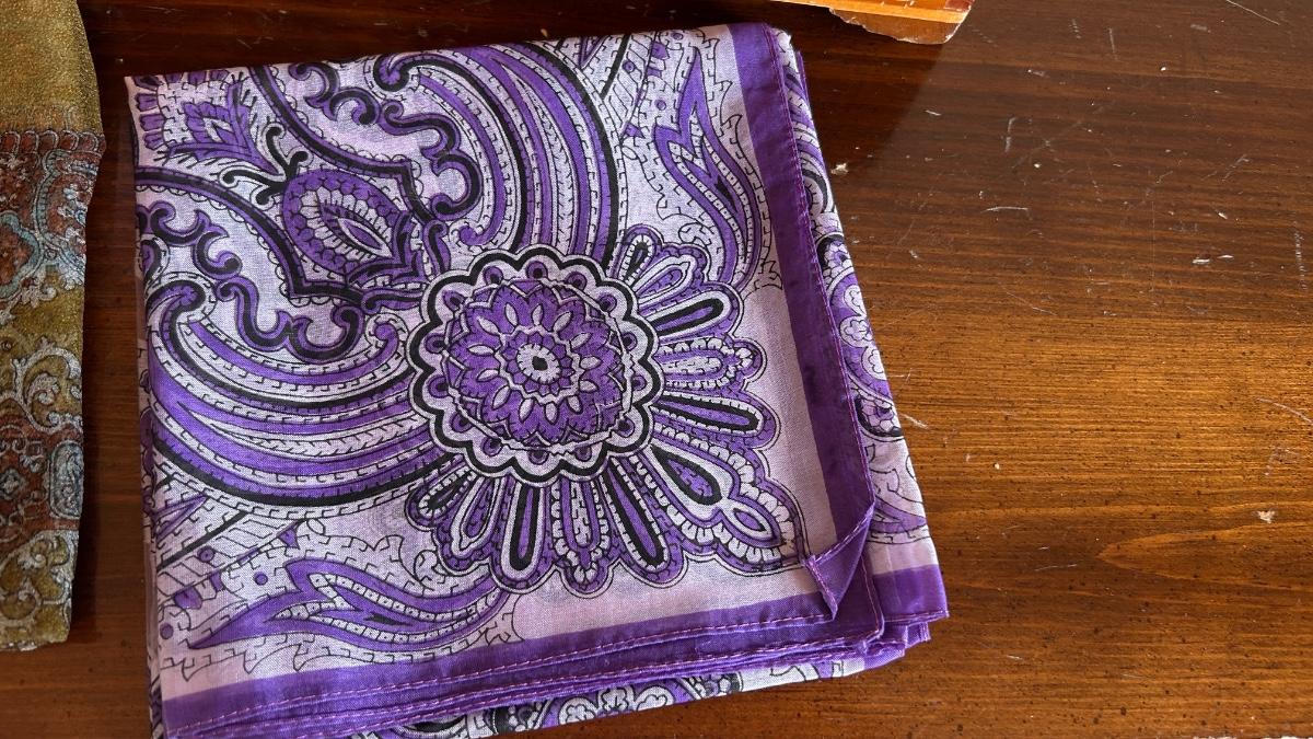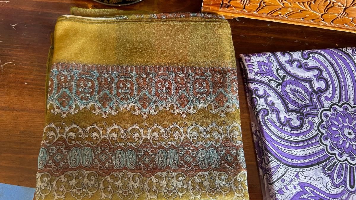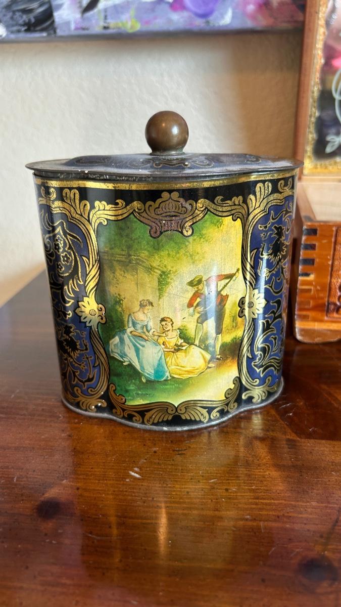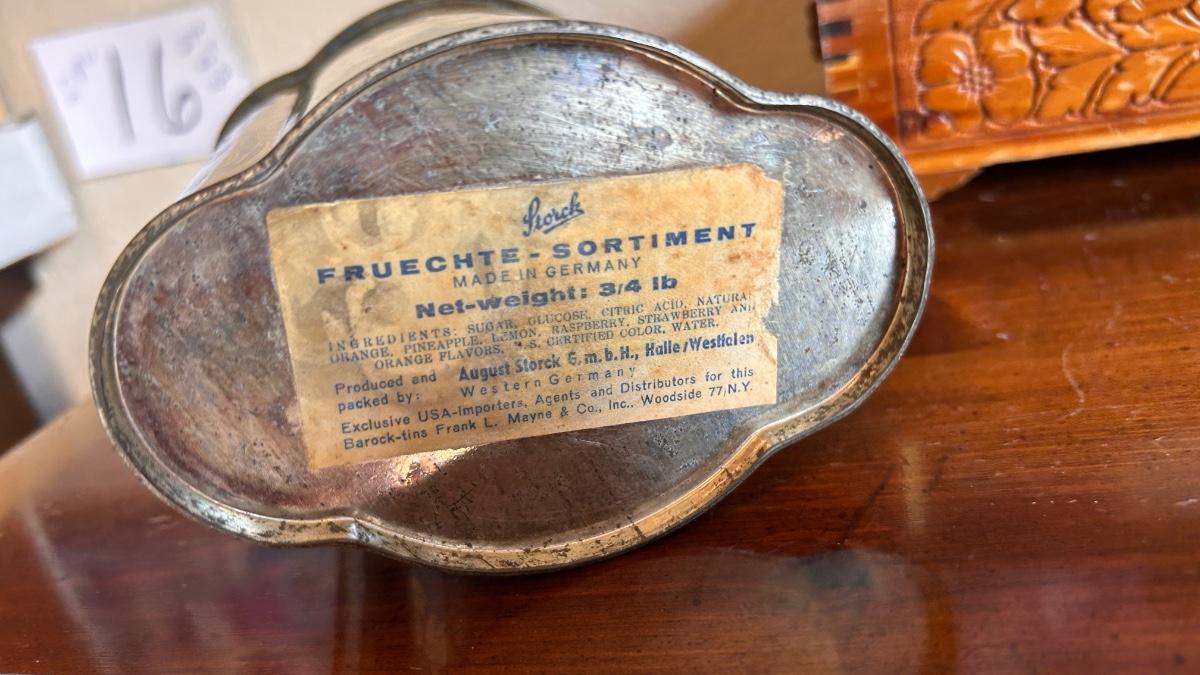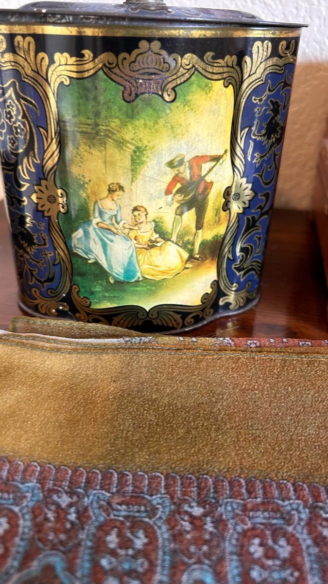 VTG WOODEN BOX WITH MIRROR ON LID, TIN AND SCARFS