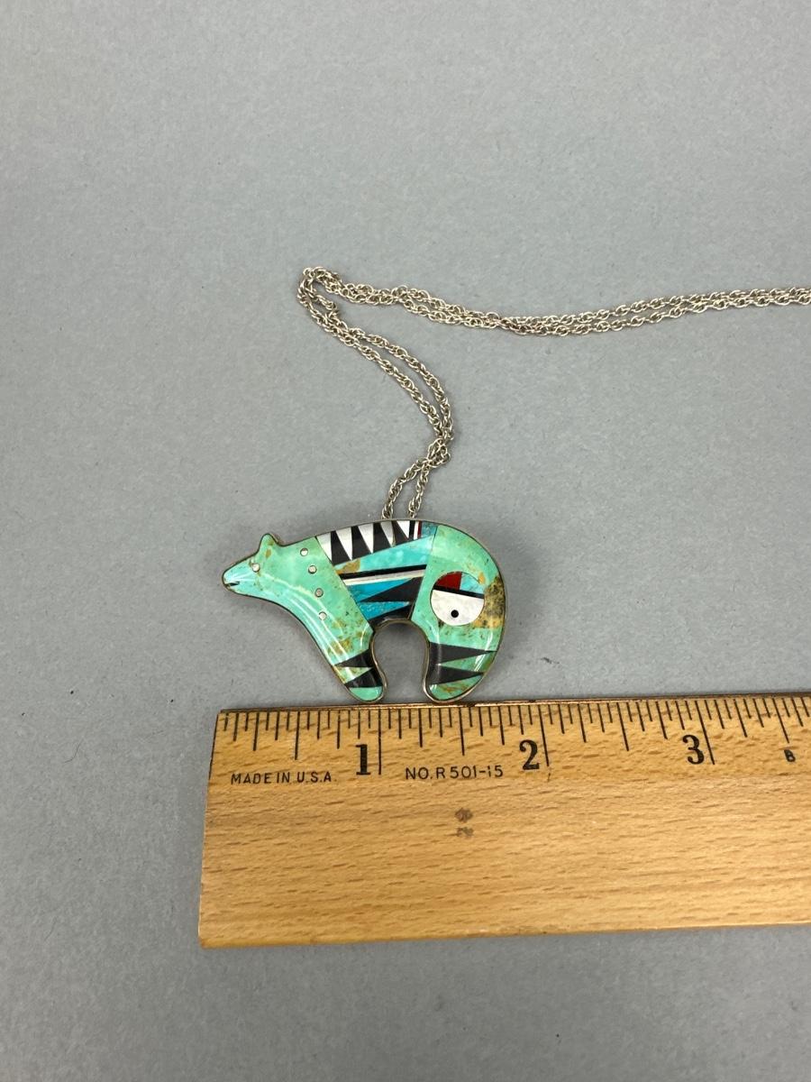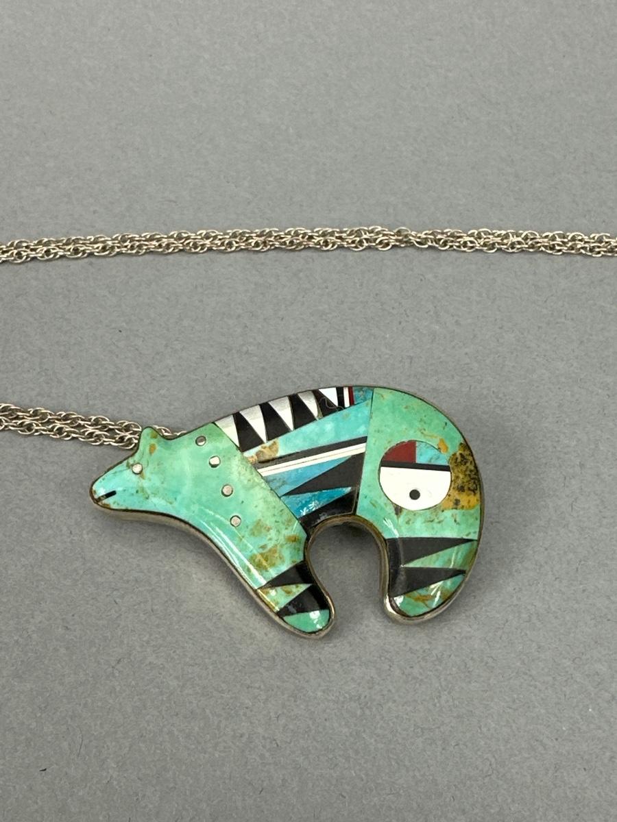 Zuni sterling multi inlaid stone bear fetish pendant.