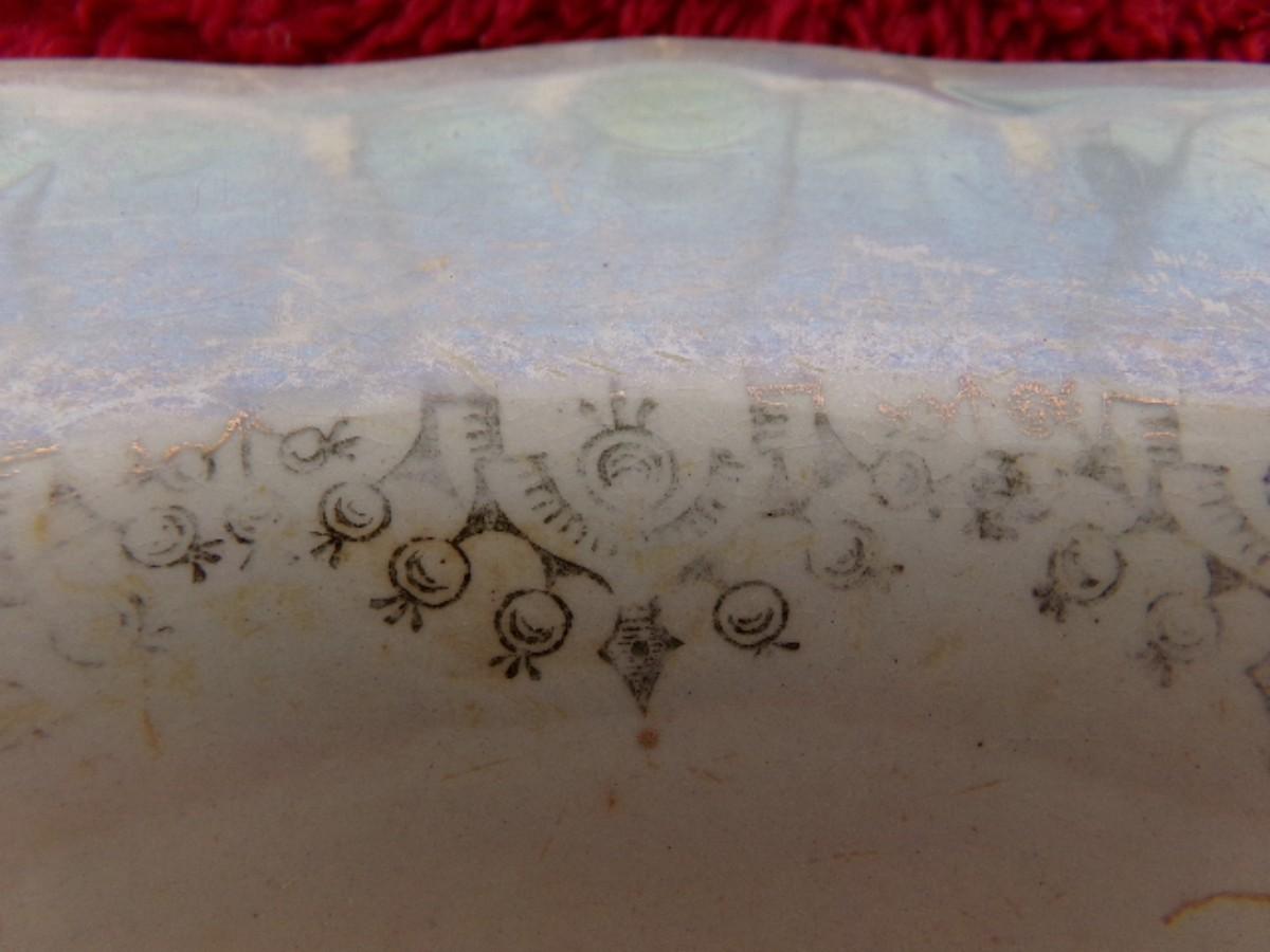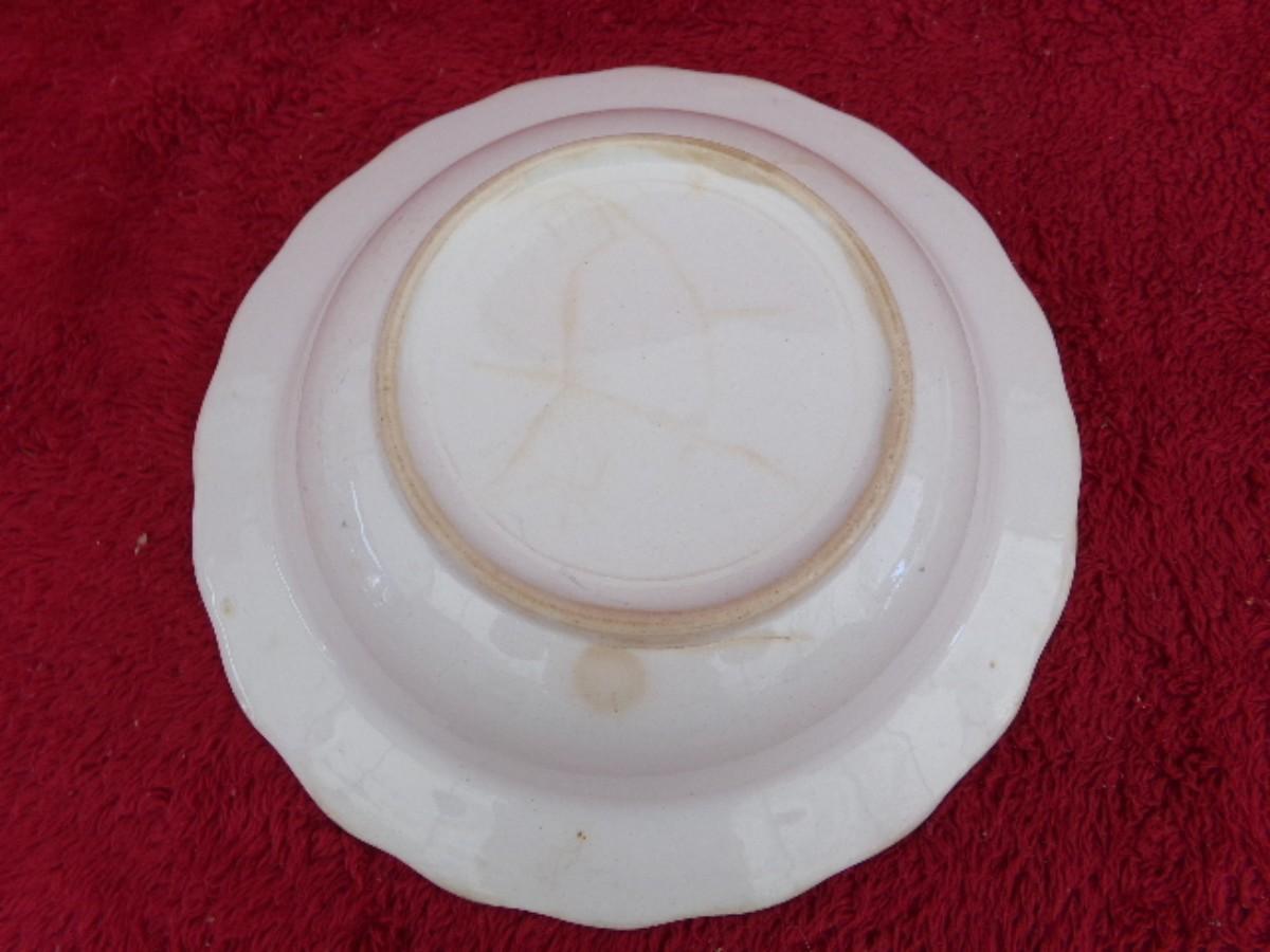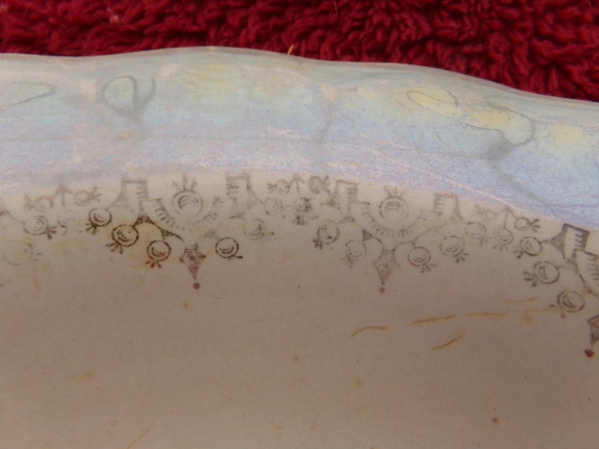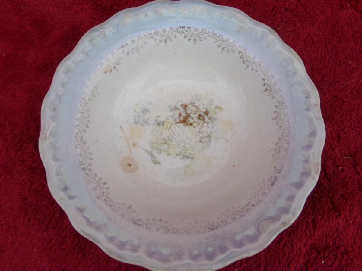 VTG or Antique glazed ceramic serving bowl, preadolescent sky blue edging and lacy silver (platinum) border work. Floral pattern center. Some minor discolorations and pocking. Mfg. unknown. About 9"+ diameter.