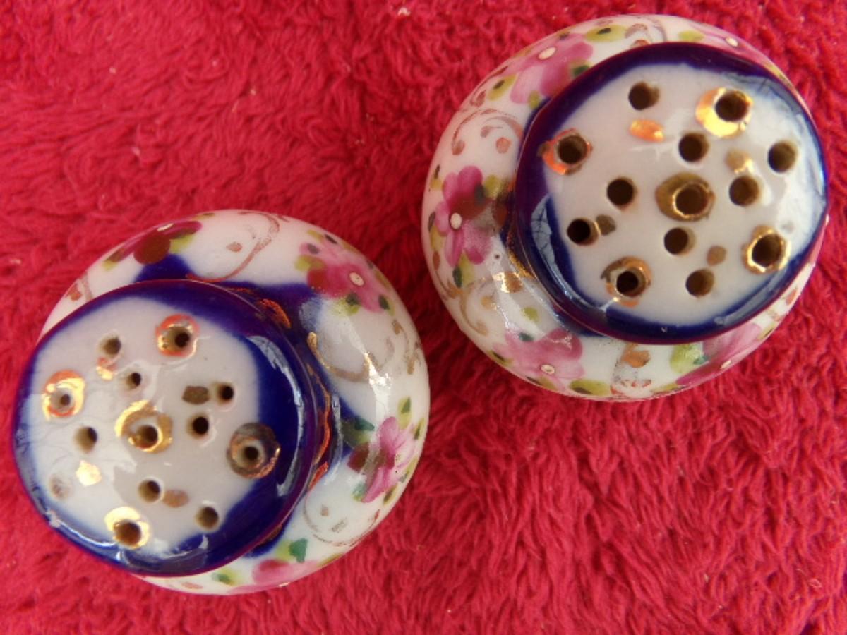 VTG/antique ornate salt & pepper set. Appear hand painted. Roses and plentiful gold trim decorations. Origins unknown. Motif looks Japanese?? Only about 2-1/2" tall.