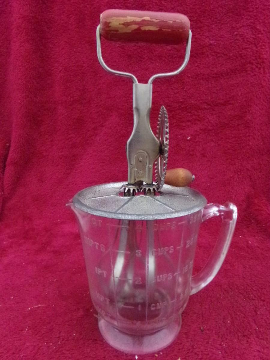 VTG/antique VERY OLD whipping mixer machine. Self contained mixing device w/ 1qt. measuring cup/bowl. It still works.