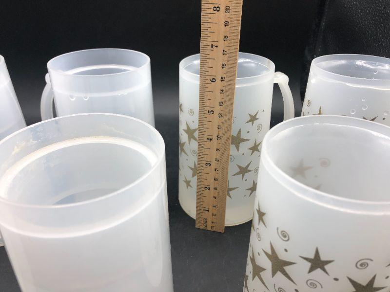 In good condition, some are plain and some have stars. Have gel inner layer, put in freezer and keep drinks cold longer without watering down from melted ice. Set of 7.