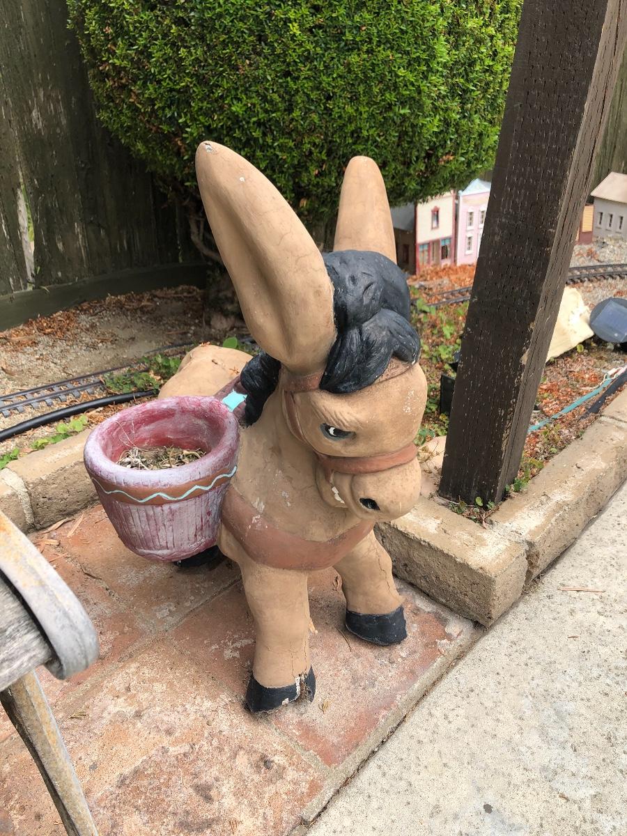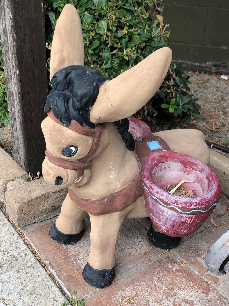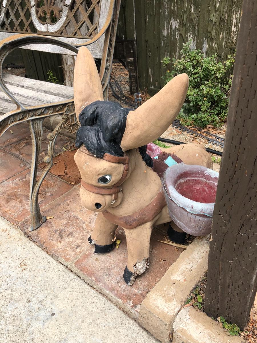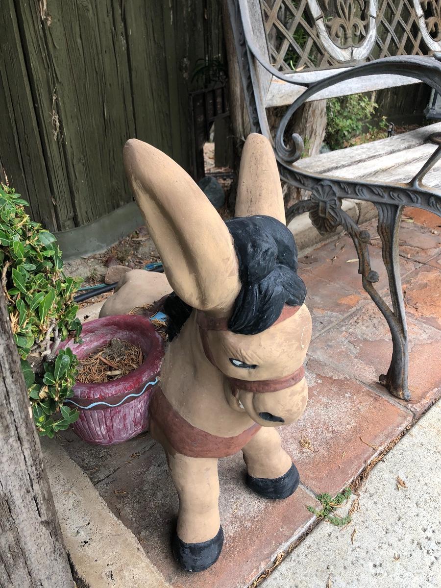 Pair of Vintage Cement Basket Carrying Donkey Burro Yard Garden Art. Both are a little weathered and there is some foot damage, but they display great. Heavy. Last picture shows pair, bench and other items not included only donkeys.