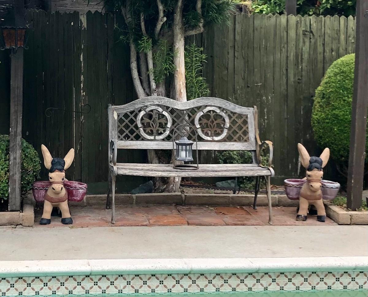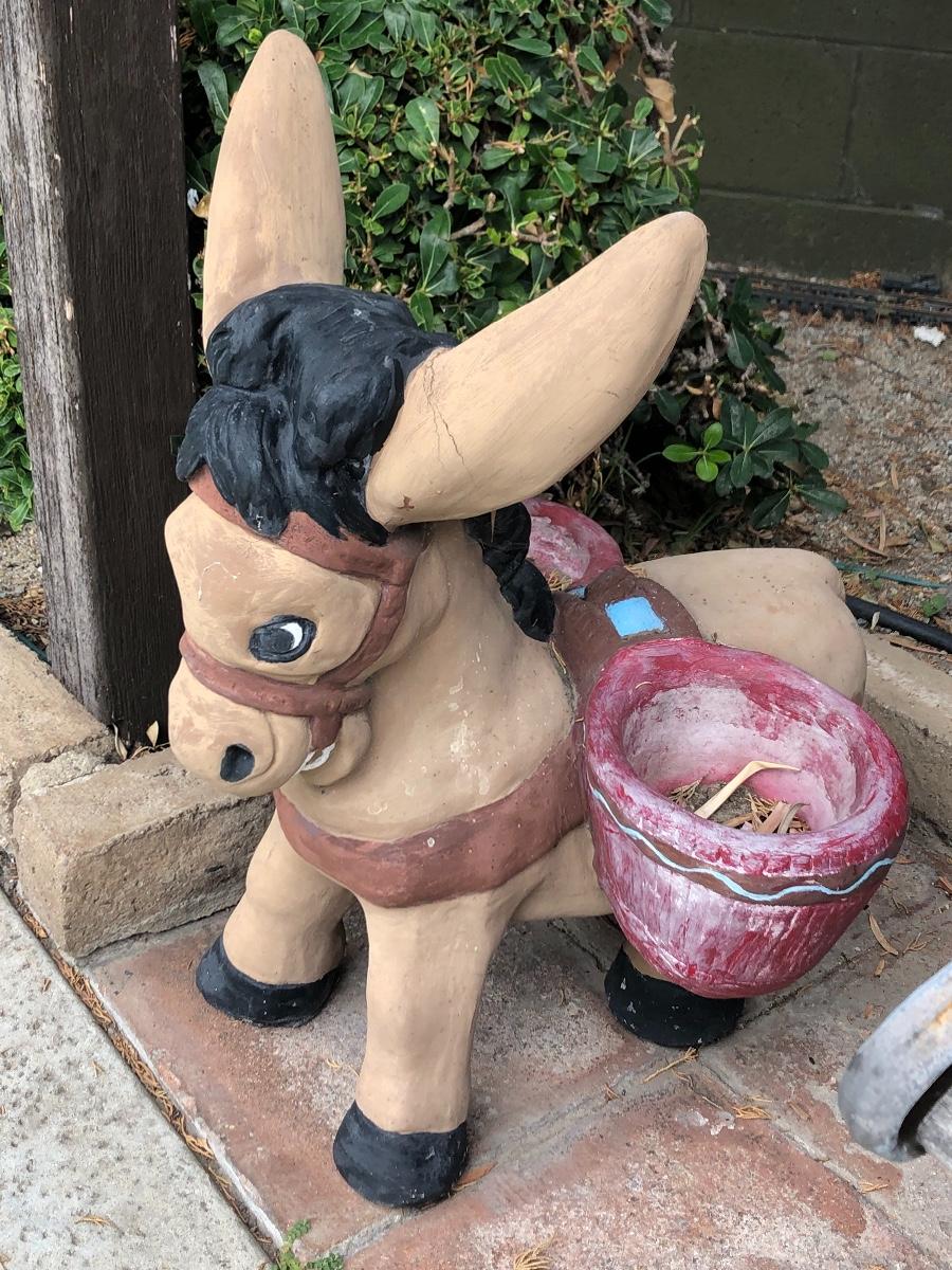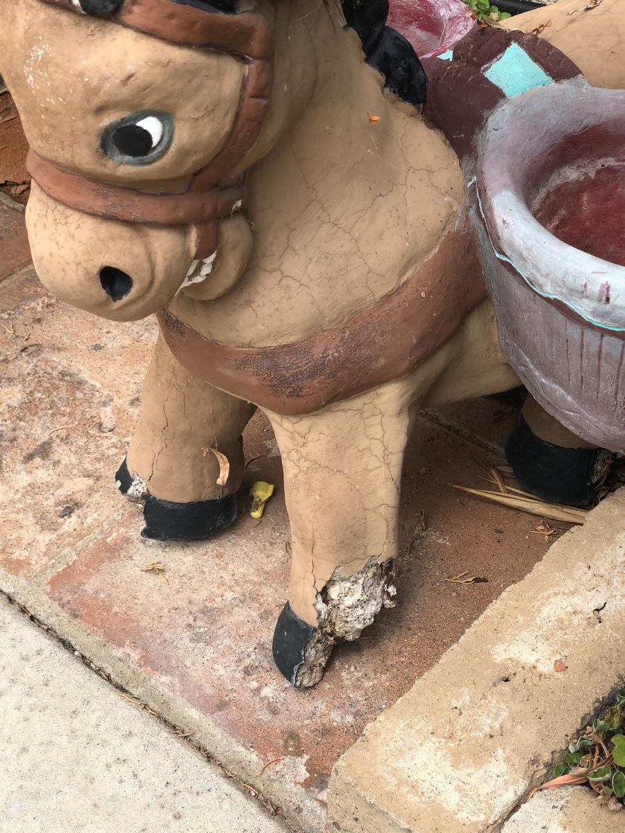 Pair of Vintage Cement Basket Carrying Donkey Burro Yard Garden Art. Both are a little weathered and there is some foot damage, but they display great. Heavy. Last picture shows pair, bench and other items not included only donkeys.