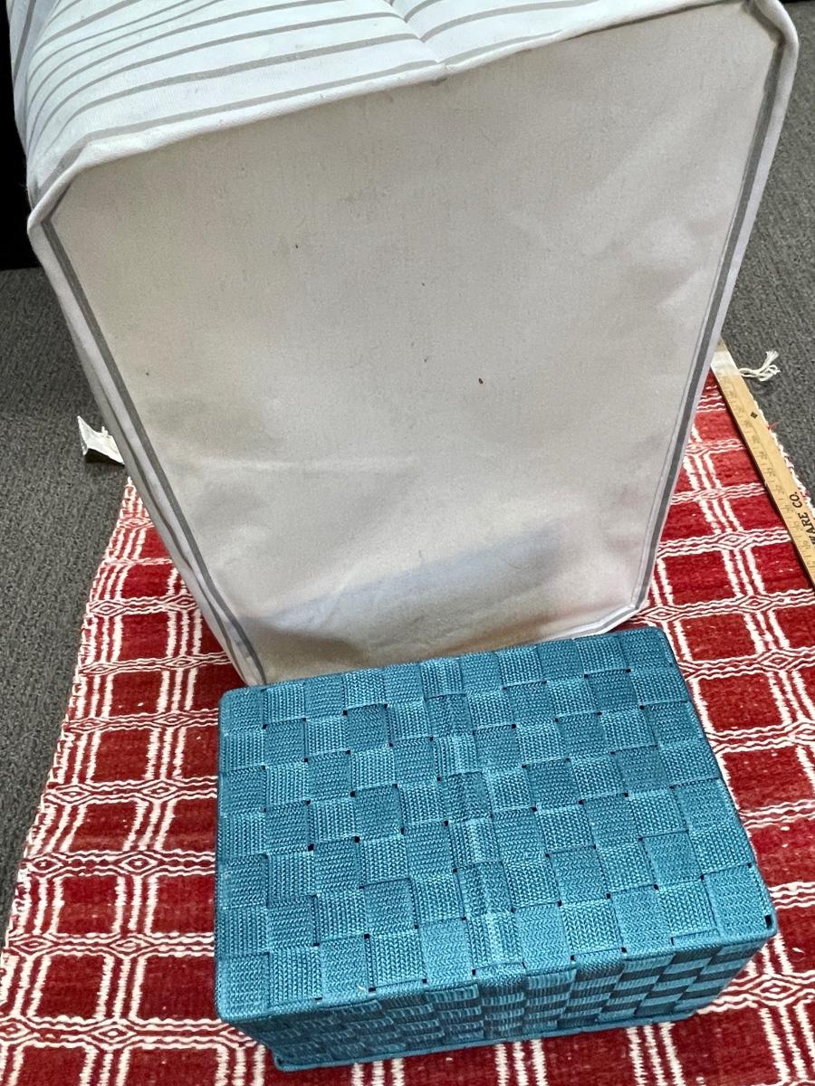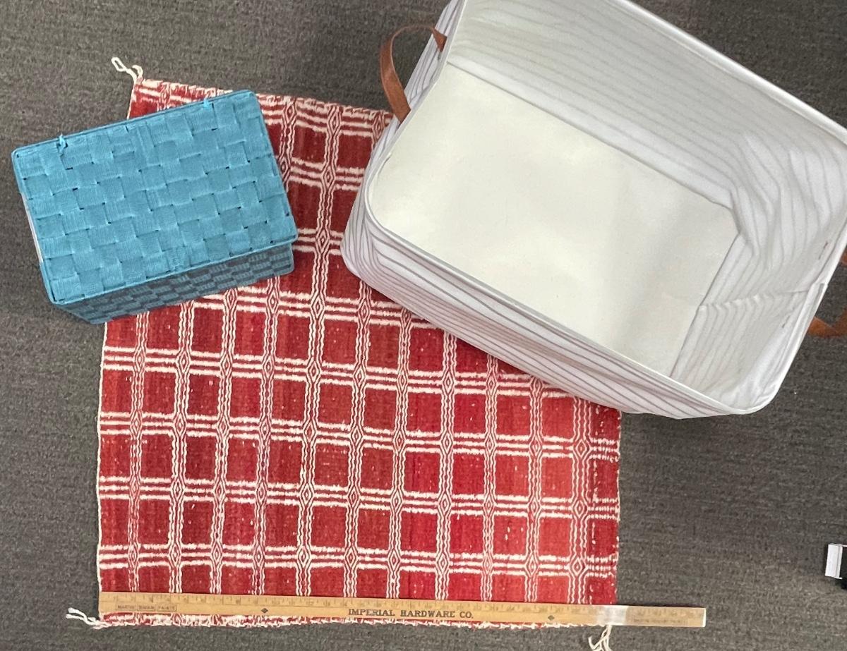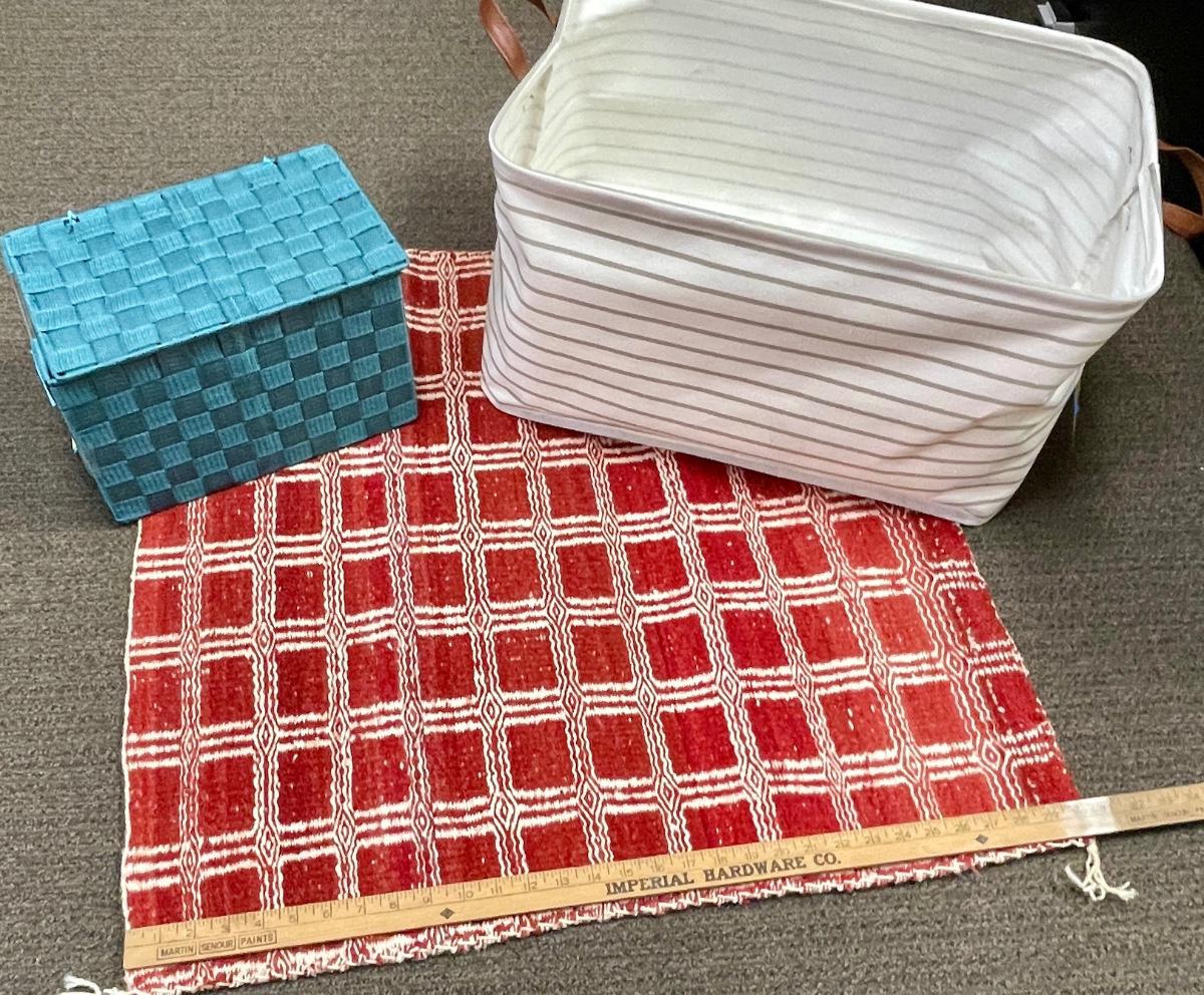 Large Fabric Tote, Blue woven box with lid, red & white woven mat.