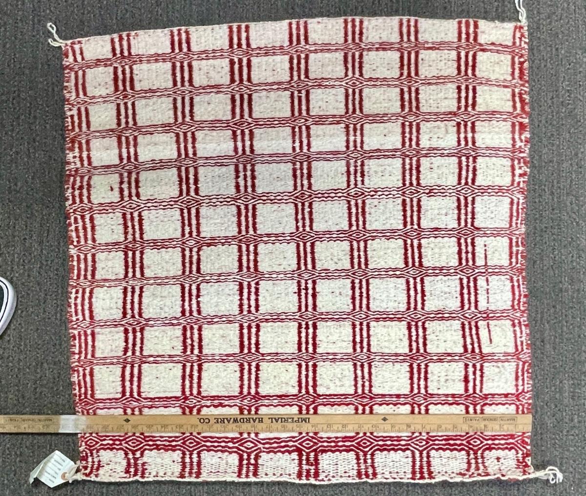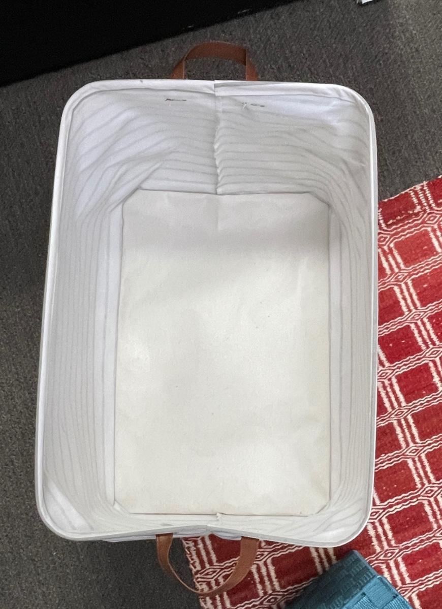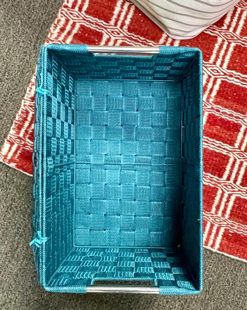 Large Fabric Tote, Blue woven box with lid, red & white woven mat.